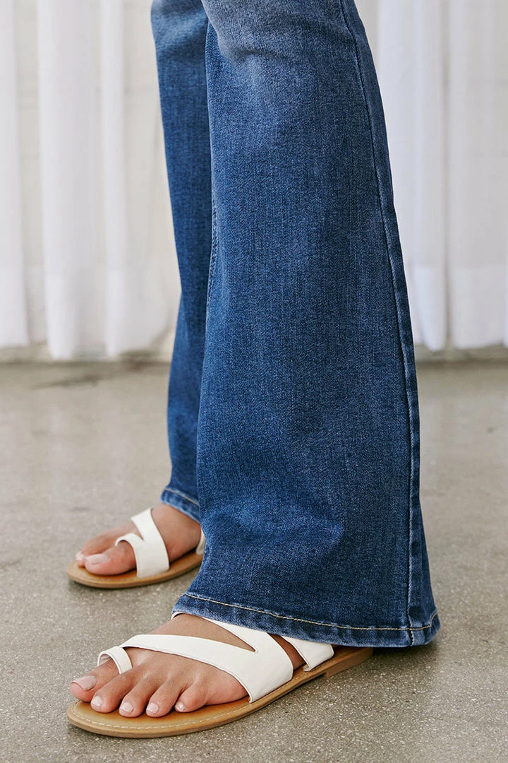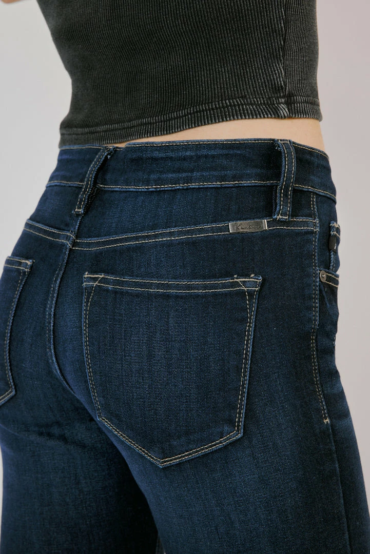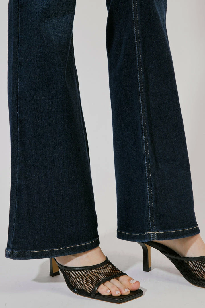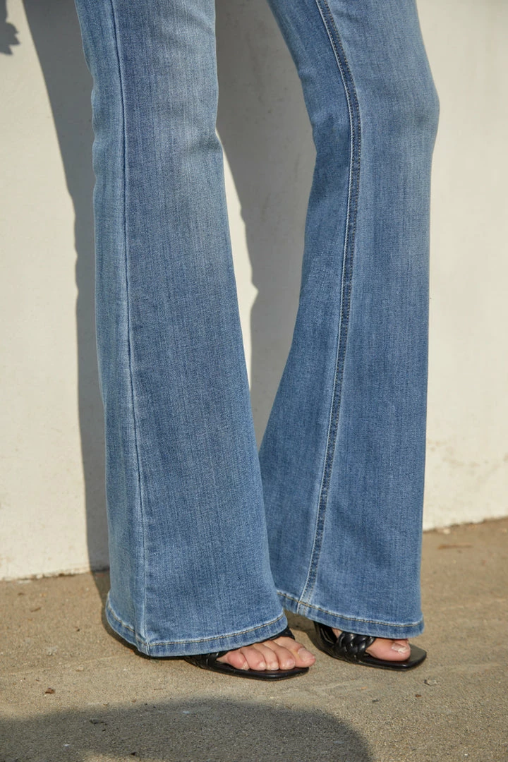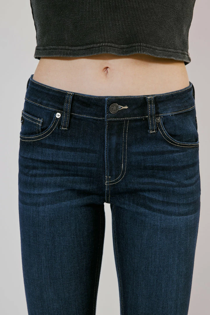 Our Samuel Mid Rise Jeans come in a flattering flared fit with light fading and whiskering for a classic blue jean look. Sits right at the natural waistline as it tapers down the thigh and begins to flare out at the knee. Made with super soft, super-stretch denim that’s breathable, flexible, and durable. Features a classic five-pocket design, single-button front, and zip-fly closure.