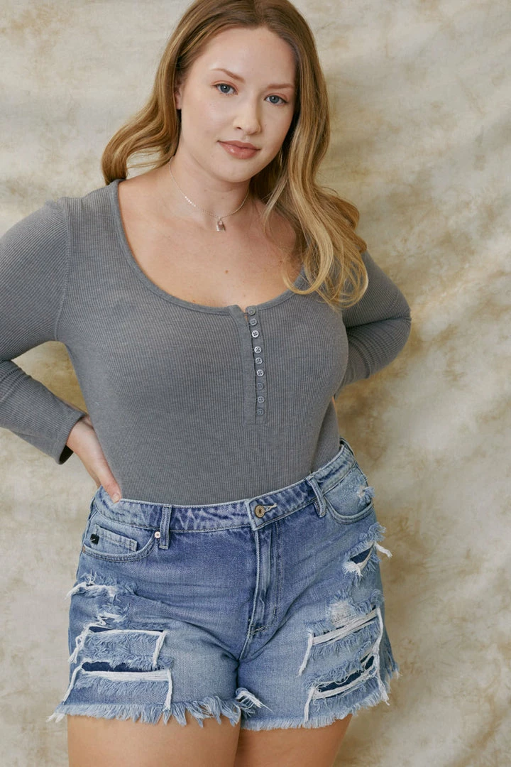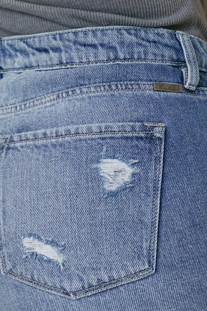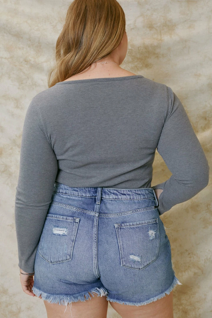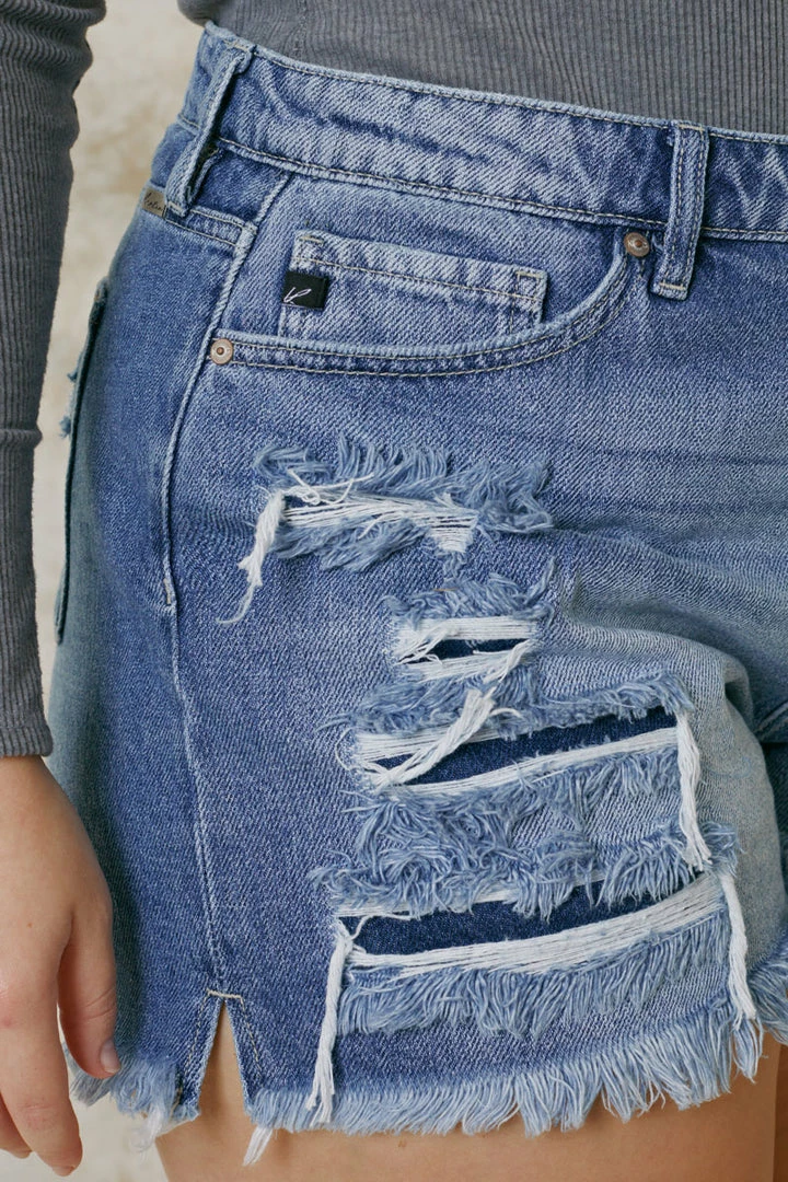 A medium blue washed denim short with heavy distress, a raw hem, and ultra high rise. Our Sandrine Shorts give you the perfect worn-in look with its detailed patchwork underneath each distress mark that adds to this piece’s versatility in style. Sits high above the waist for an on-trend look that gently relaxes down the hips and thigh. Comes in a rigid denim fabric that won’t bag out after multiple wears, a classic 5 pocket design, single-button front, and zip-fly closure.