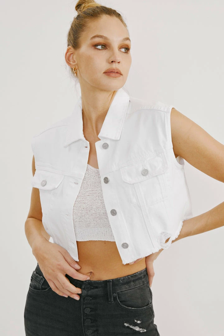 The Shay 90’s denim vest is your new favorite style! This chic white denim vest is perfect to pair with shorts or bootcut jeans. Featuring a basic collar and front button-flap pockets.Â