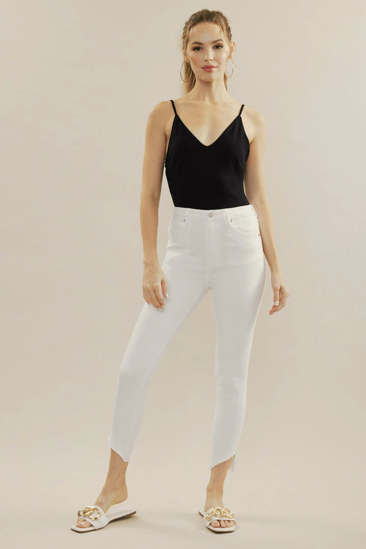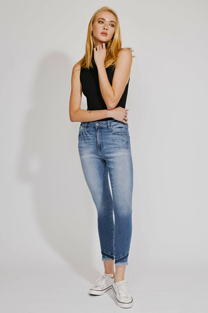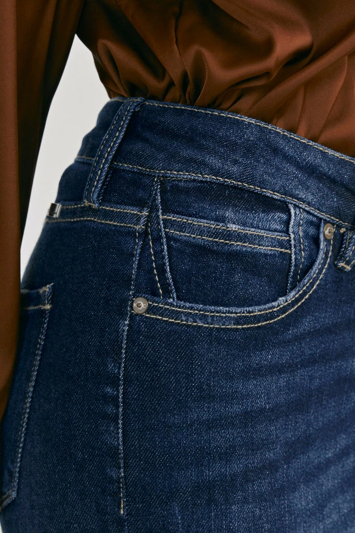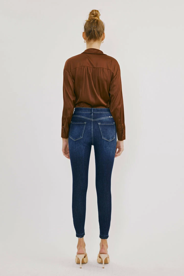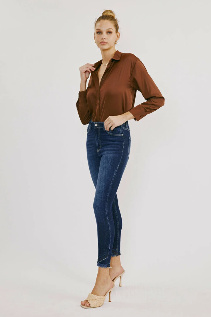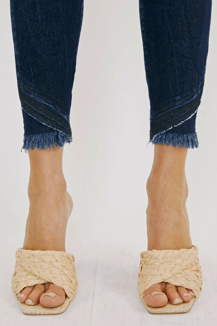 Our Shiloh High Rise Jeans sit above the natural waistline as they taper down the leg and end with a raw twisted, released hem. Made with stretch denim that fits like a glove with maximum comfort. Features a classic five-pocket design, single-button front, and zip-fly closure.