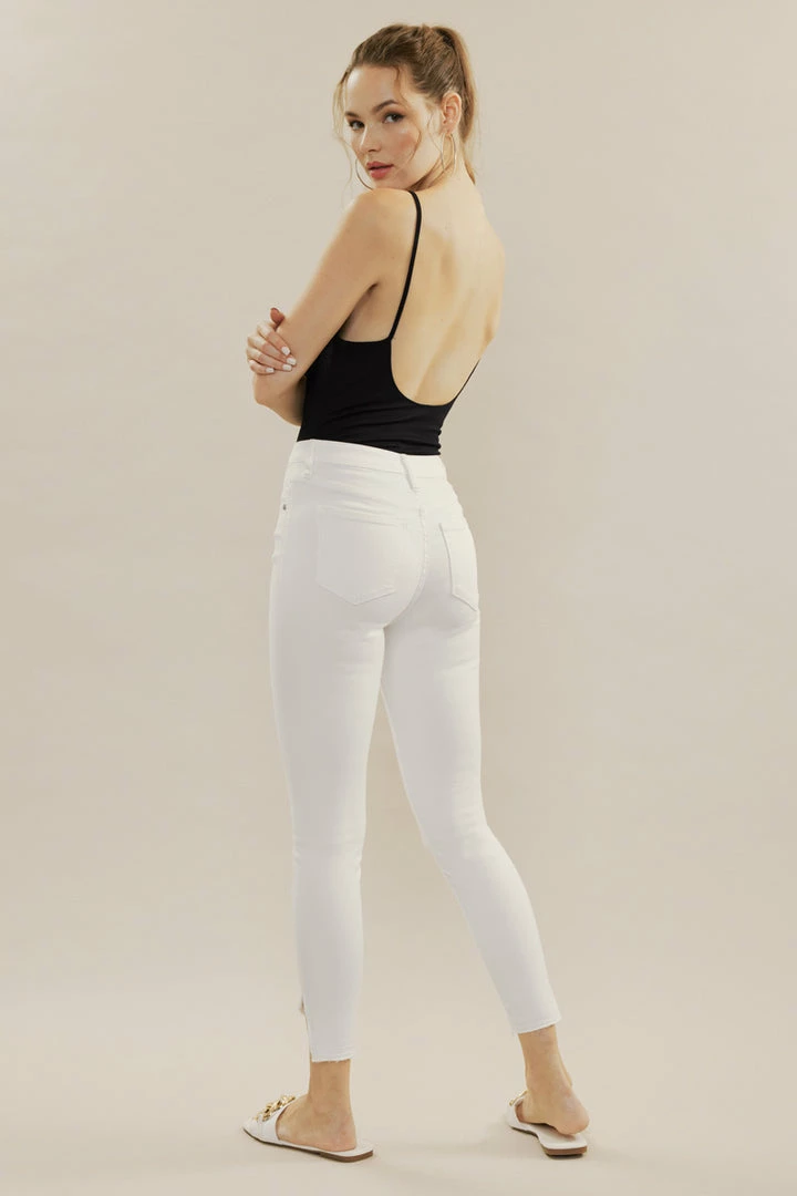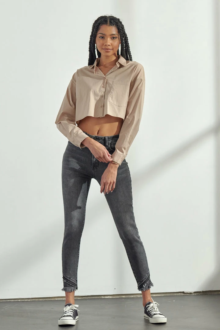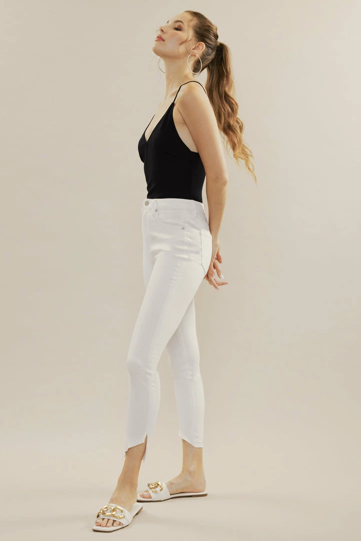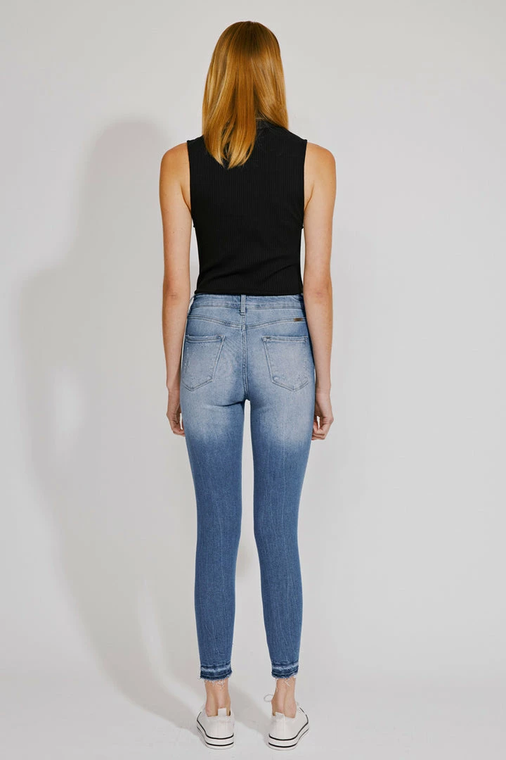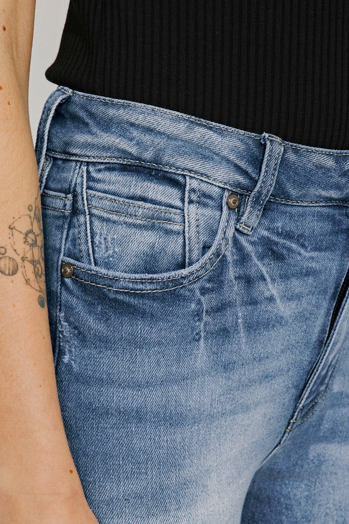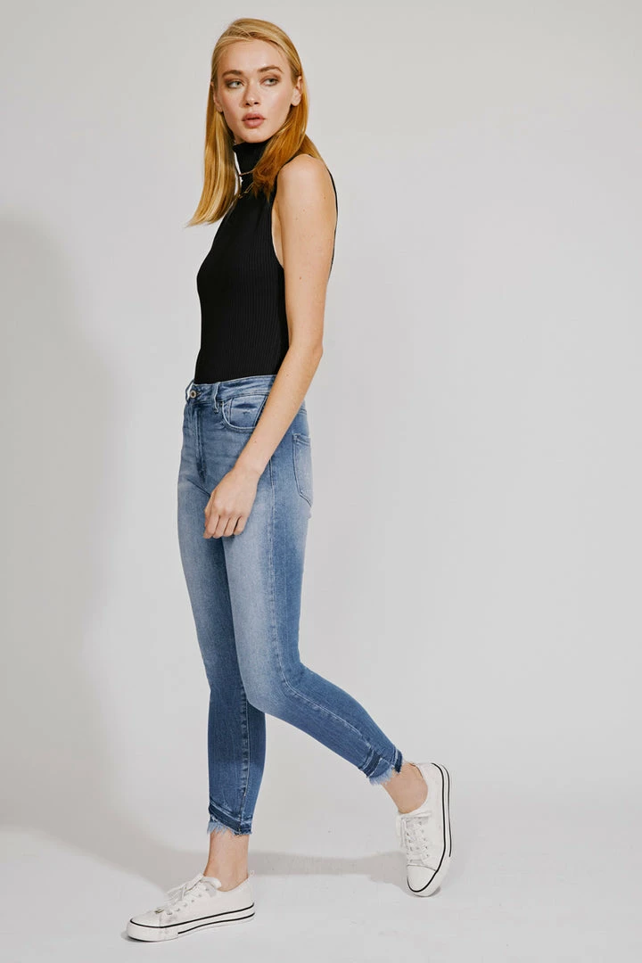 Our Shiloh High Rise Jeans sit above the natural waistline as they taper down the leg and end with a raw twisted, released hem. Made with stretch denim that fits like a glove with maximum comfort. Features a classic five-pocket design, single-button front, and zip-fly closure.