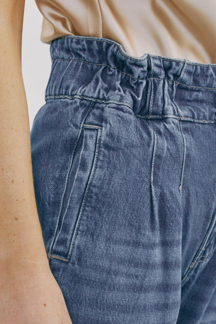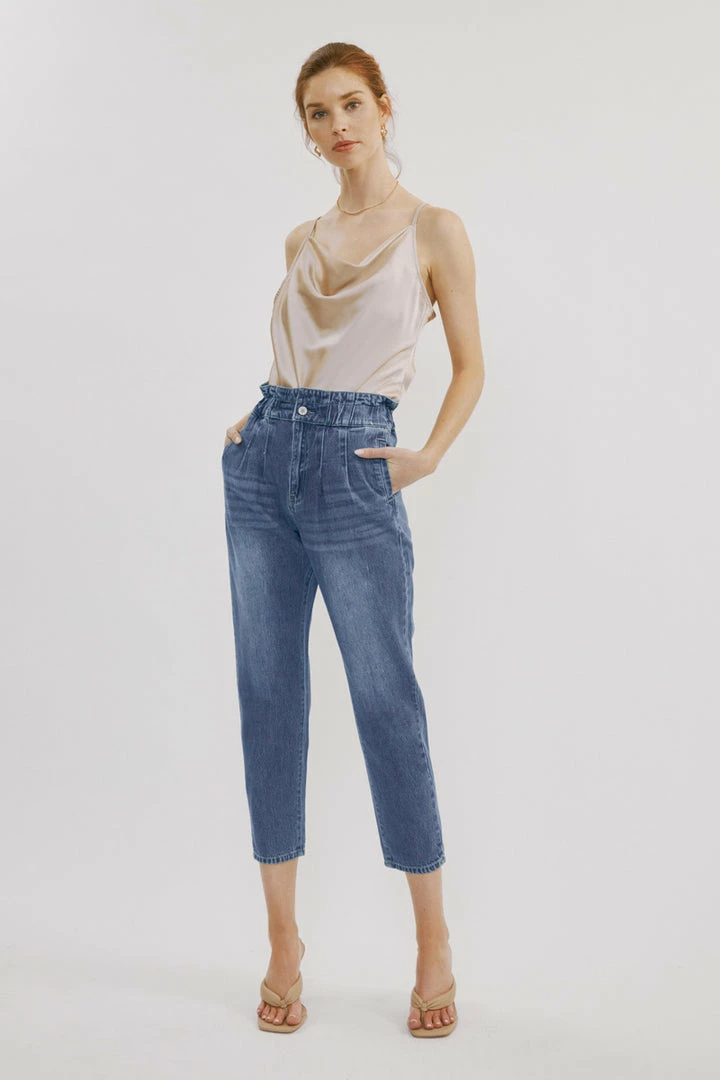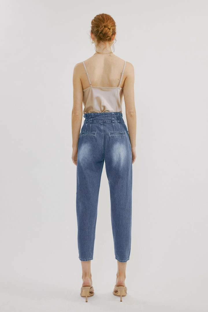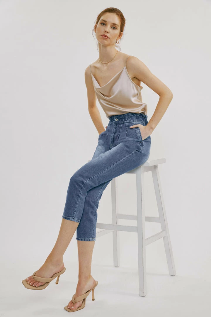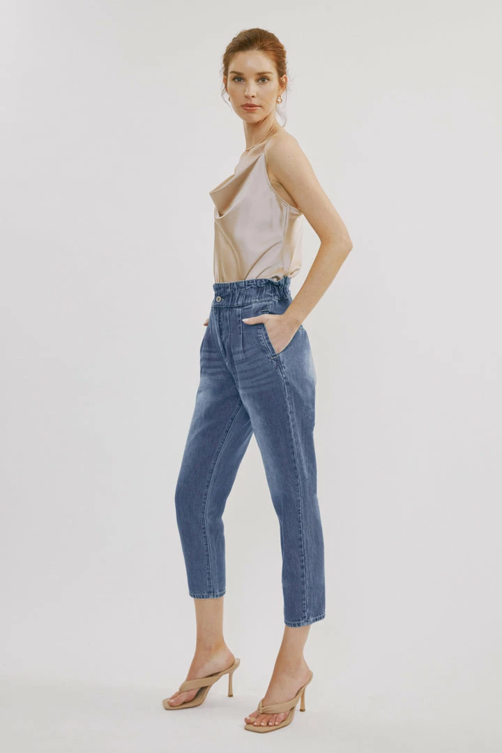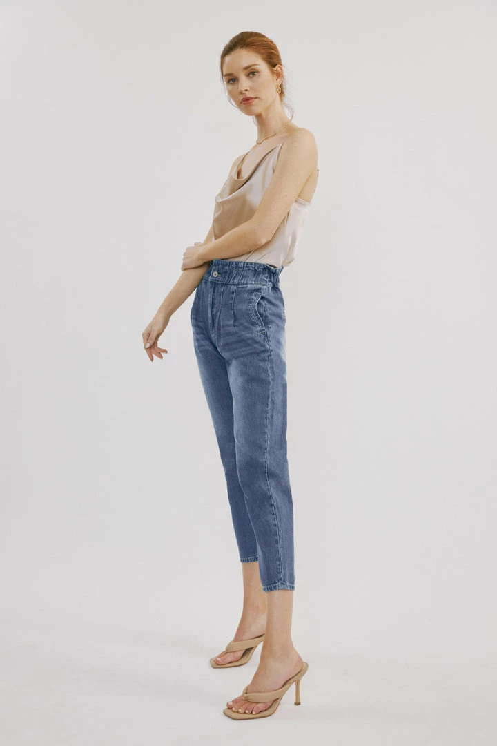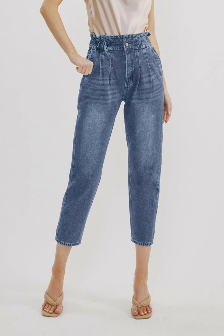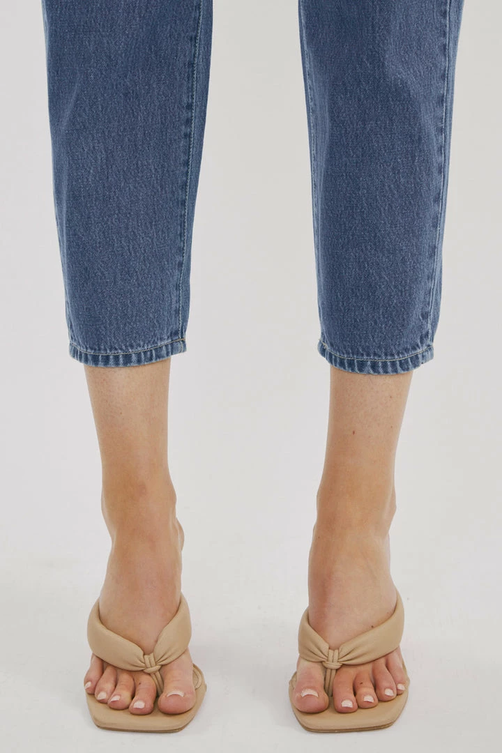 Our Angel Ultra High Rise Mom Jean comes in a medium blue wash with moderate distress on the front with a raw hem. Sits high above the natural waistline with an elastic waistband for a trendy look meanwhile offering your waist comfort at the same time. Fitted from the waist as it relaxes down the leg for a true mom jean style. Features 2 front slanted pockets and 2 back faux pockets, a single-button front, and a zip-fly closure.