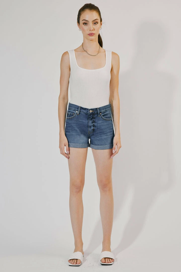 Our Beau High Rise Shorts come in a blue wash with whiskering detail and a cuffed hem. Sitting just above the waist for an on-trend look, this pair is a must-have closet staple. Pairs perfectly with casual tees, bodysuits, or crop tops.
