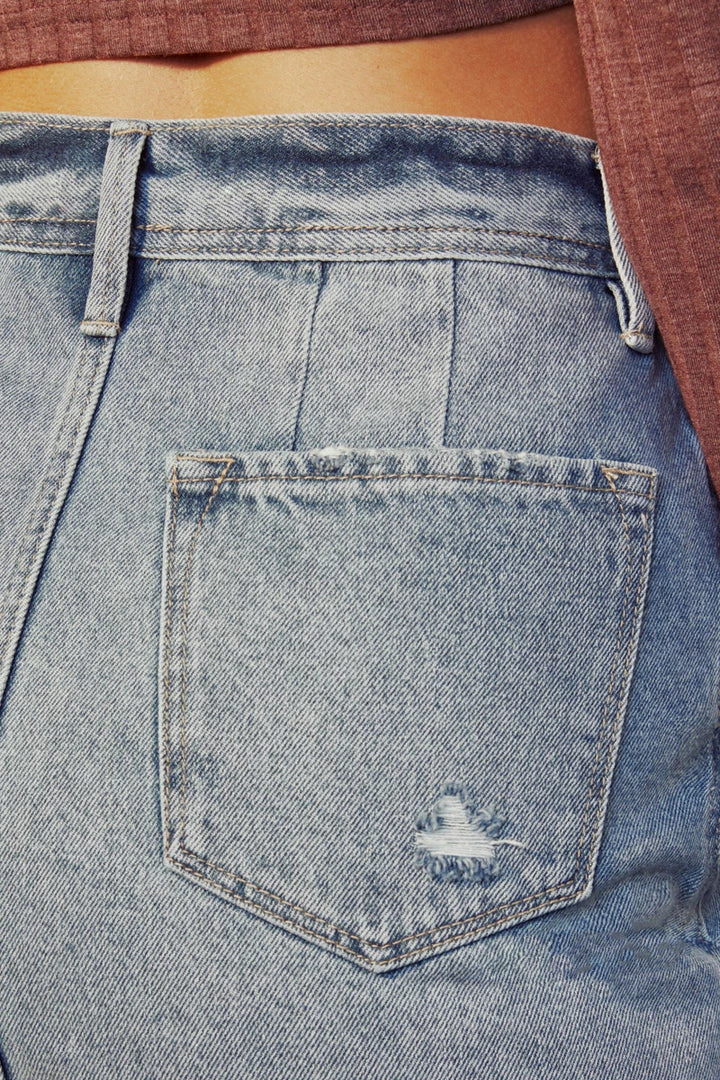 Medium washed button-down A-Line Skirt featuring ragged hemline, whiskering, 5-pocket design, and a 7-button front closure.
