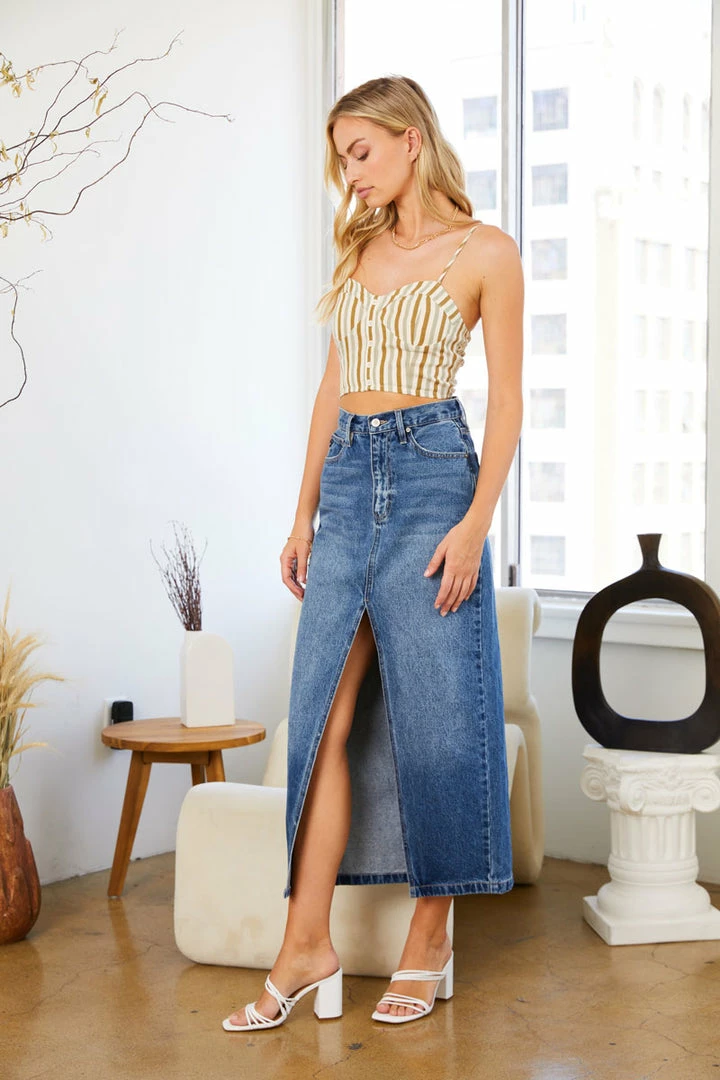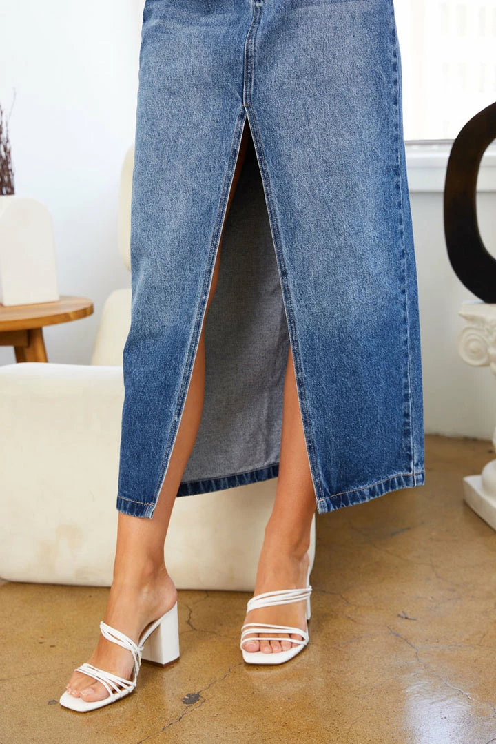 Our Delphi 90’s Maxi Skirt comes in a medium blue tone with marbled wash and whiskering, creating a beautiful gradient fade. Ends right at the lower calf with a high-cut slit starting from the midpoint of the skirt. Form-fitting around the hips for a sexy silhouette that’s perfect for the summer season. Features a classic five-pocket design, single-button front, and zip-fly closure. Finished with gold-colored hardware.