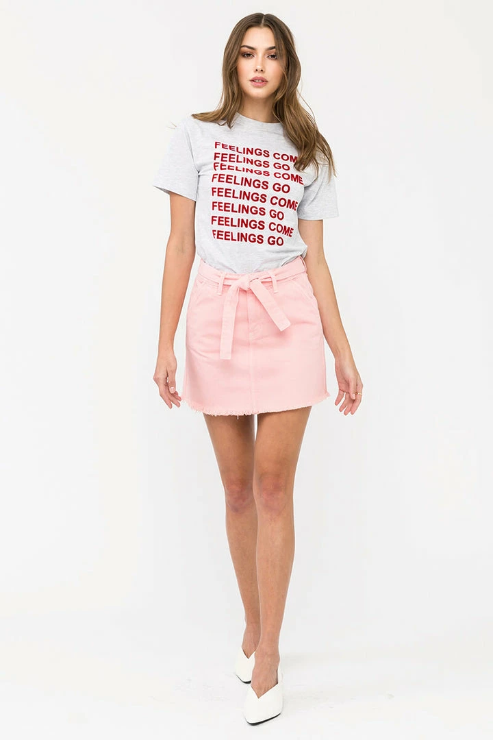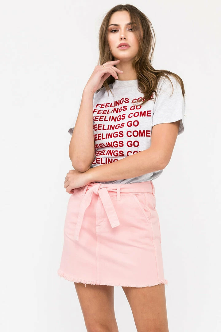 Our Eleanor Belted Mini Skirt comes in black or pink with a ribbon belt around the waist and a raw hem for a completely customizable look. Sits right at the natural waistline as it gently tapers down the hips creating a flirty silhouette that’s fun and stylish. Features a four-pocket design, single-button front, zip-fly closure, and ribbon-tie belt.