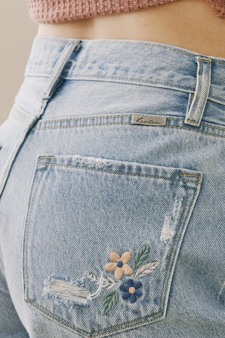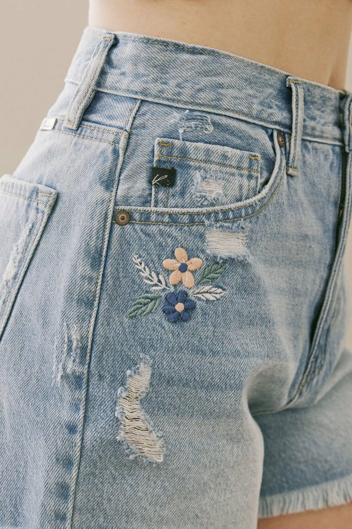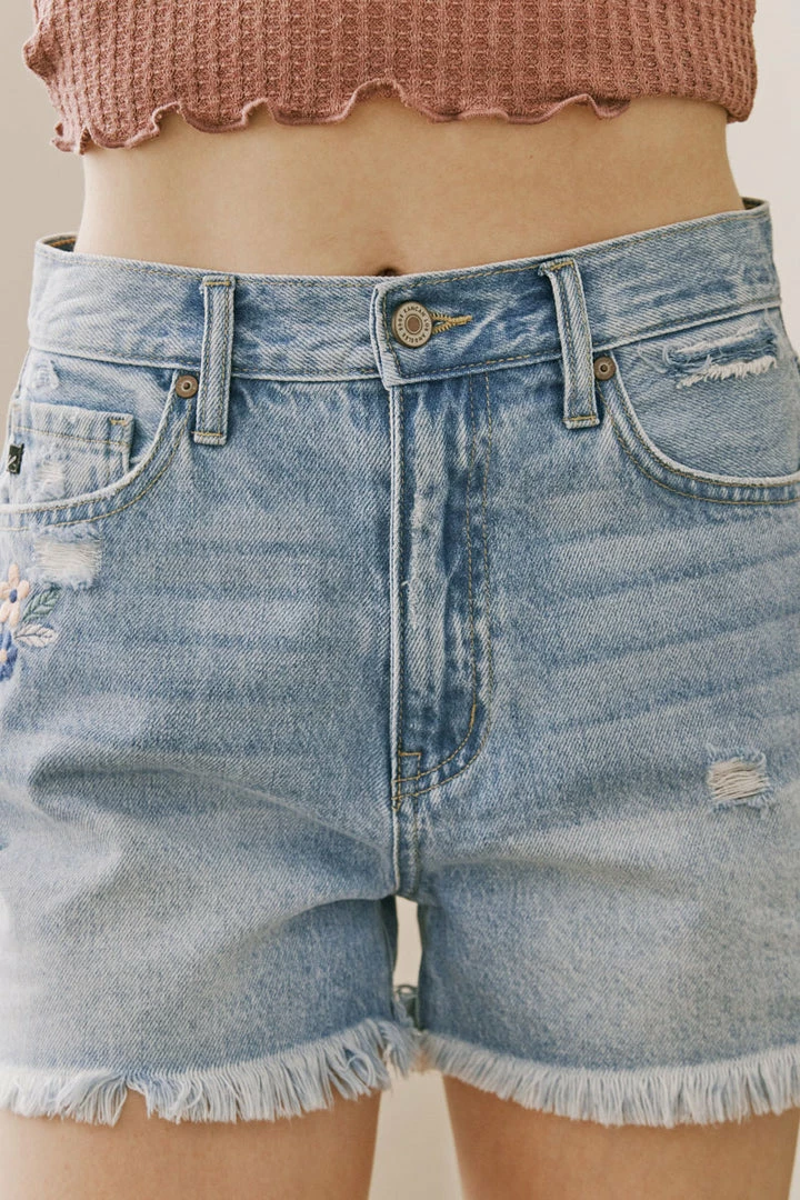 Our Flora Ultra High Rise Shorts come in a light blue wash with fading on the front and back, whiskering detail on the front, and slight distress all around. This style comes with a beautiful floral embroidered detail below the front right pocket as well as the back right pocket. Comes complete with a raw hem for a more casual look, a classic 5-pocket design, single-button front closure, and zip-fly.Â