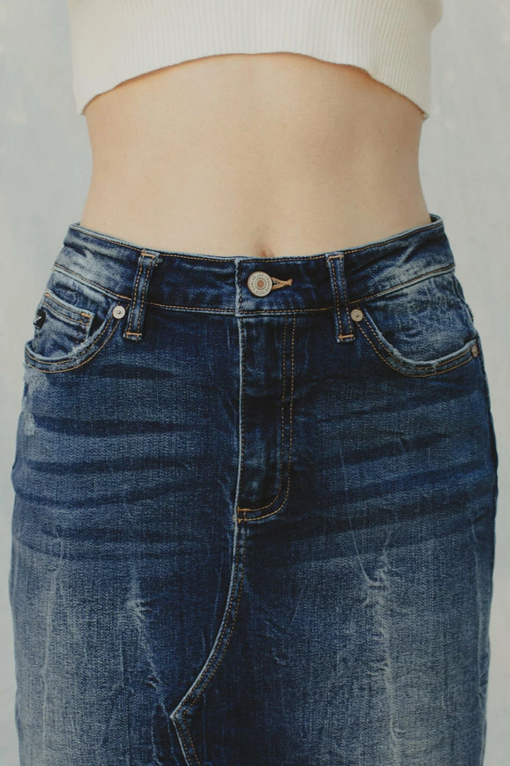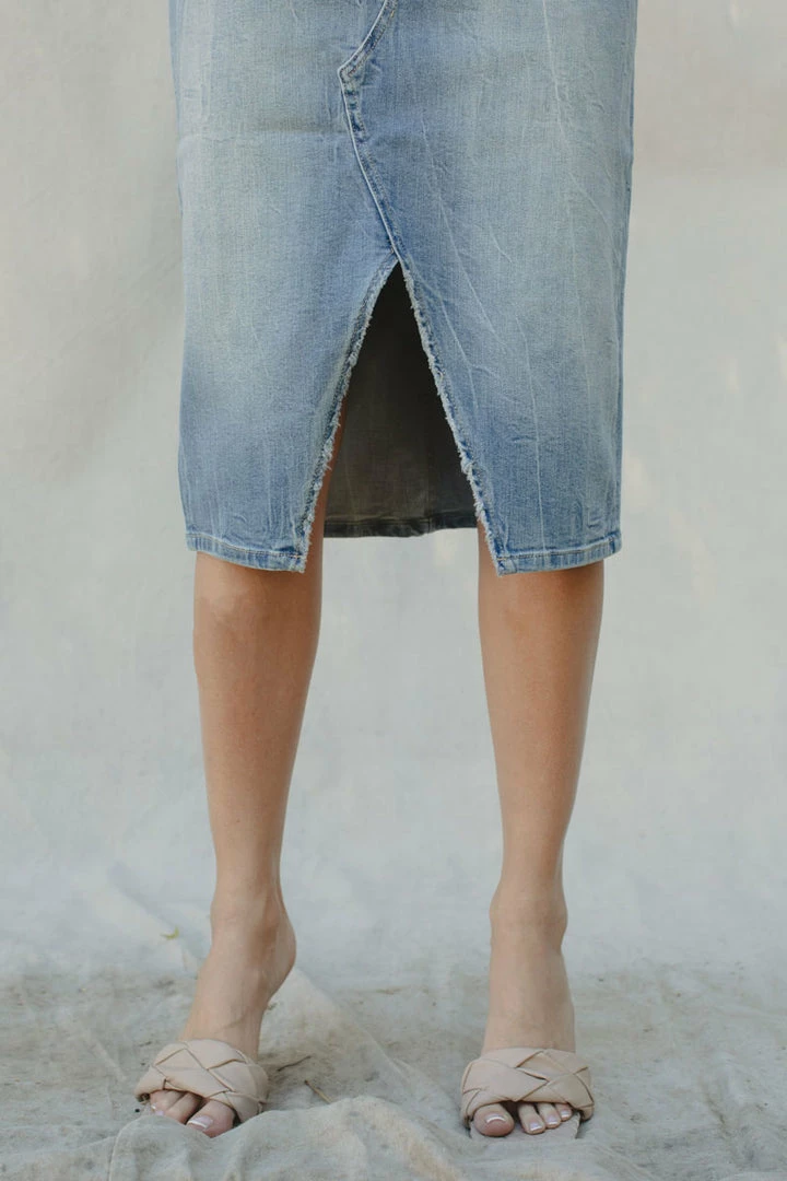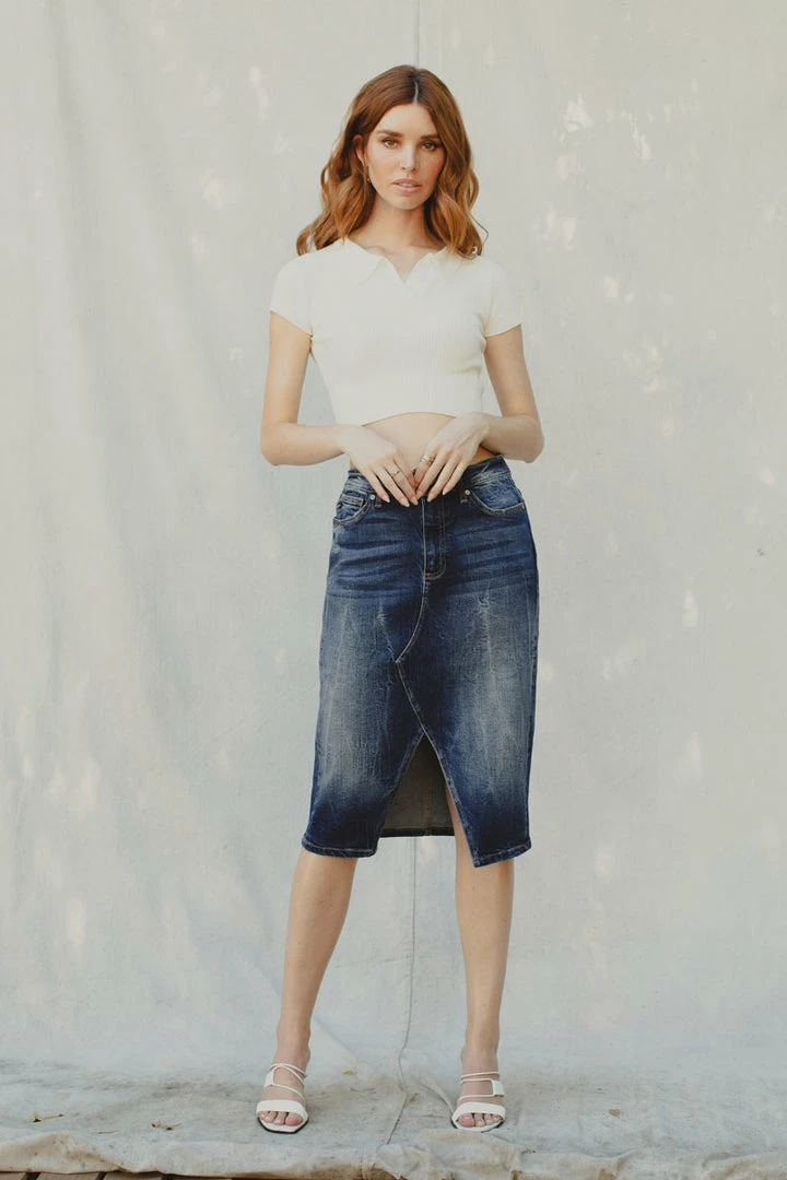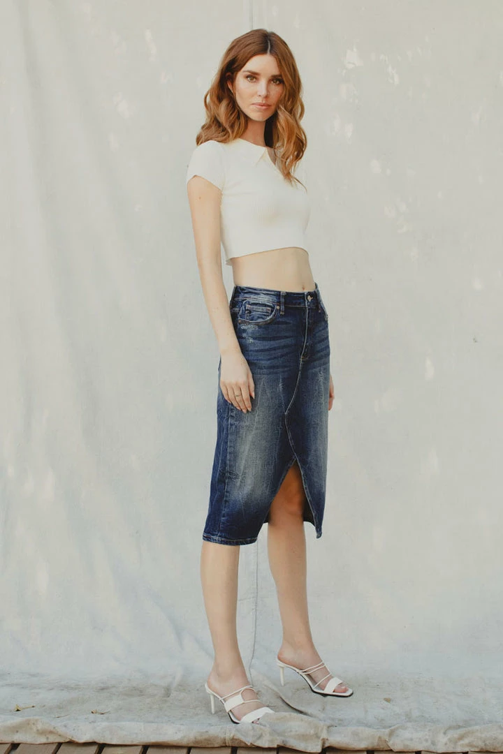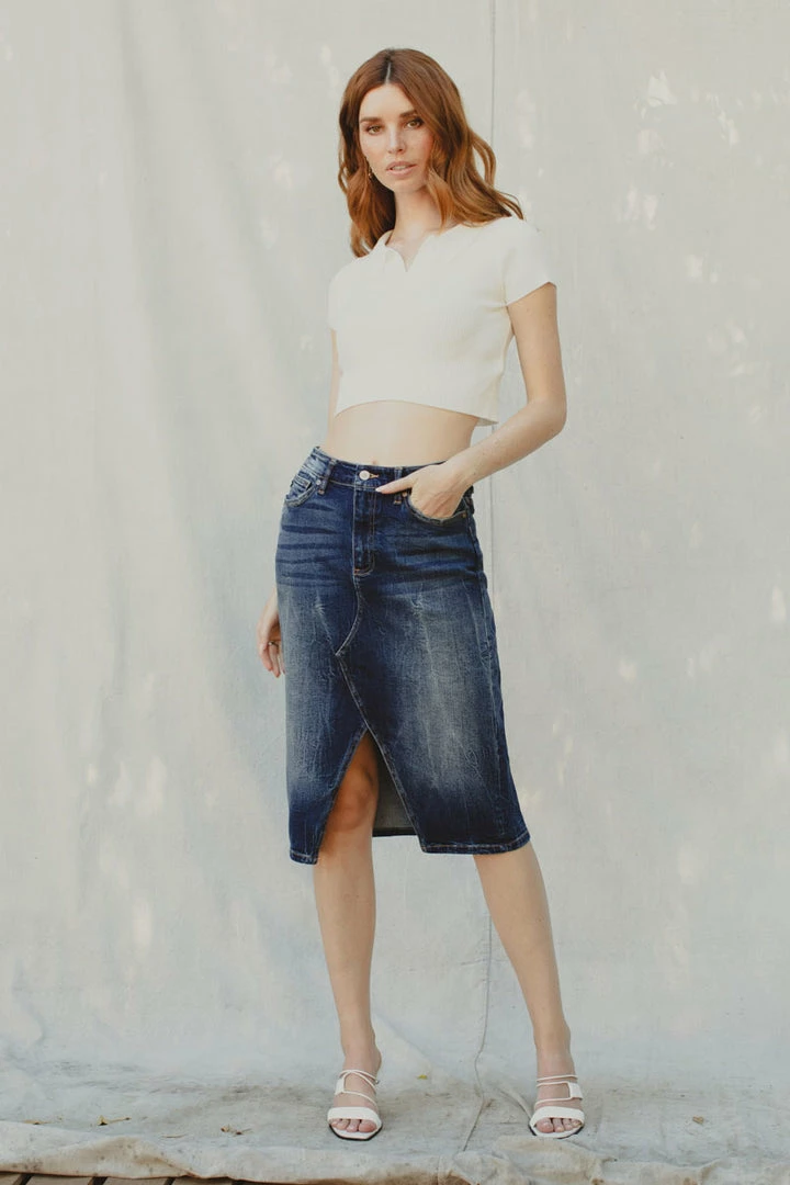 Enhance the look of your everyday wardrobe with this stylish high-rise midi skirt with a front slit. Featuring a narrow cut that sits close to the body, hem details, a 5-pocket design, and single button closure with zip fly.