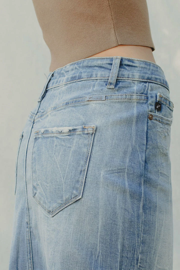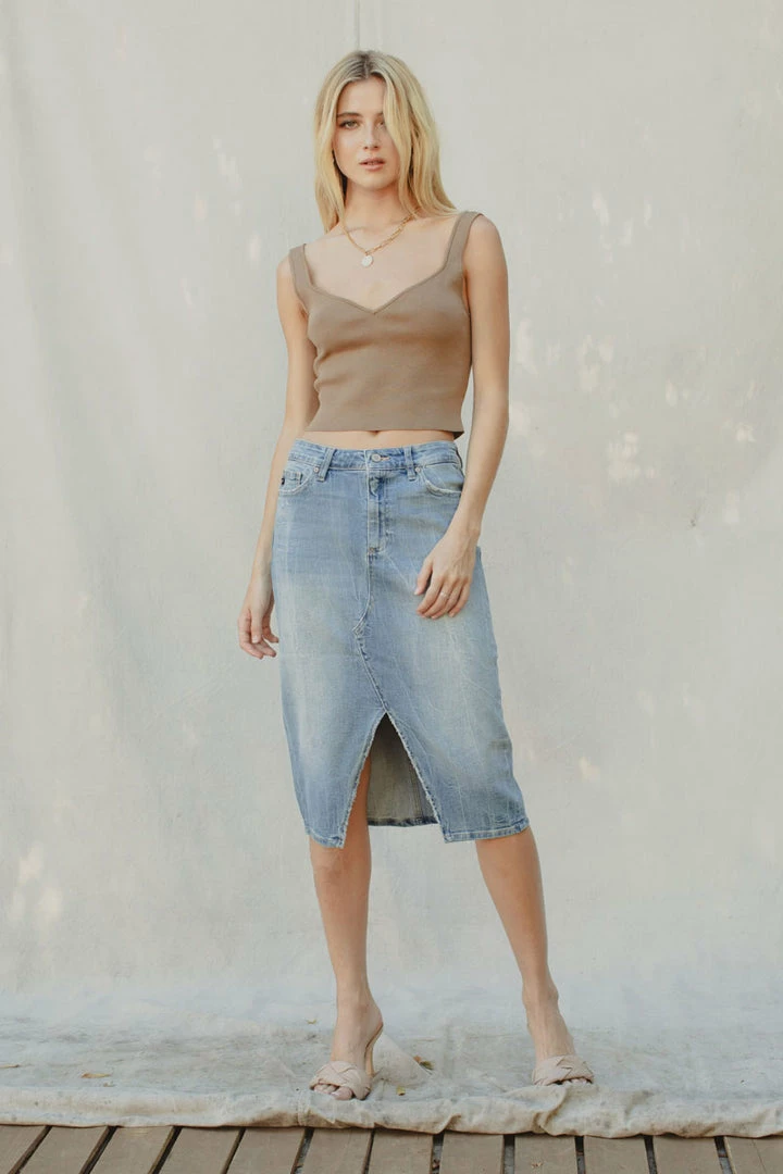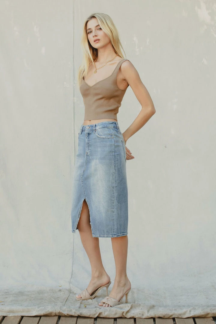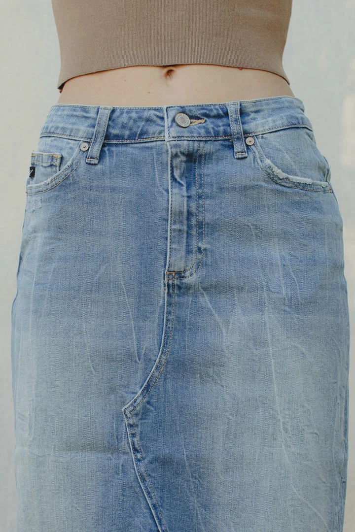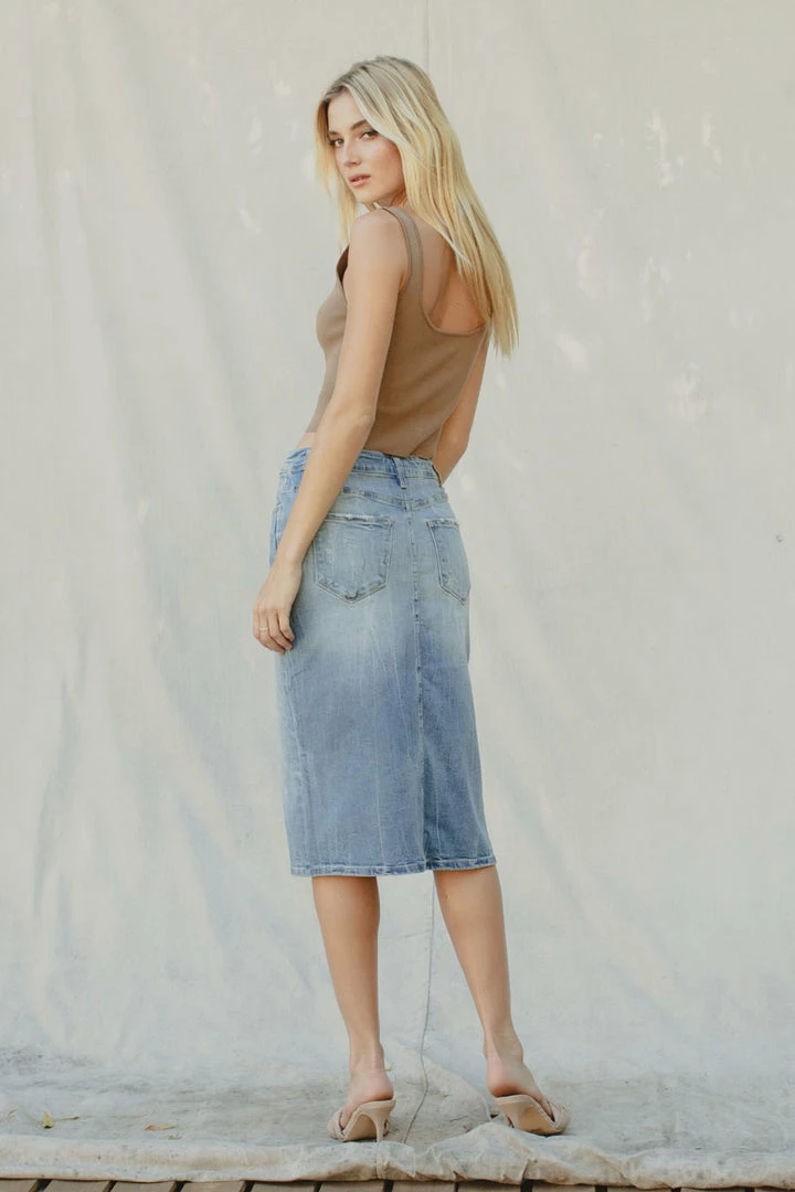 Enhance the look of your everyday wardrobe with this stylish high-rise midi skirt with a front slit. Featuring a narrow cut that sits close to the body, hem details, a 5-pocket design, and single button closure with zip fly.