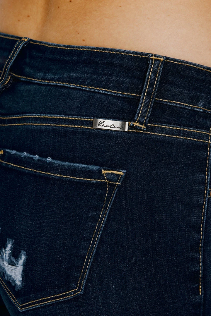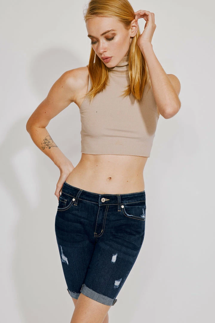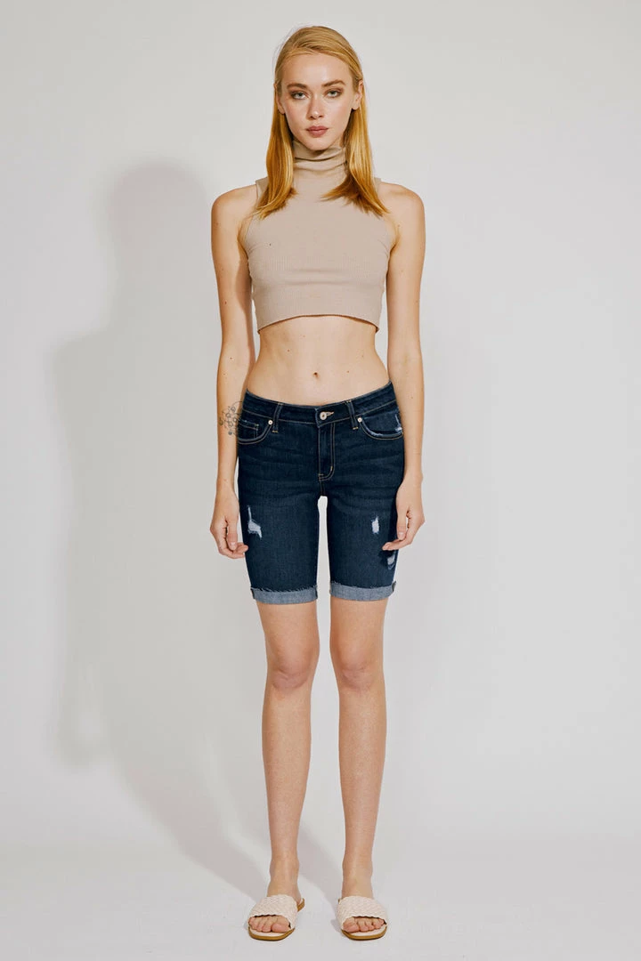 Dark washed curve-enhancing Bermuda shorts that sit right at the natural waistline and hems sit just above the knees. Comes in a classic slim-fit design that molds to your body while contouring your figure for a flattering fit every time. Made with a stretch denim blend that is designed for your comfort and to help you move with ease. featuring fading, whiskering, contrast stitching, a hint of distress detailing, and a cuffed hem.