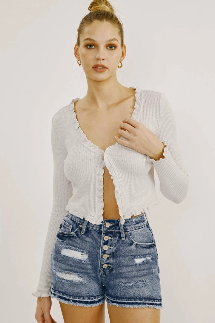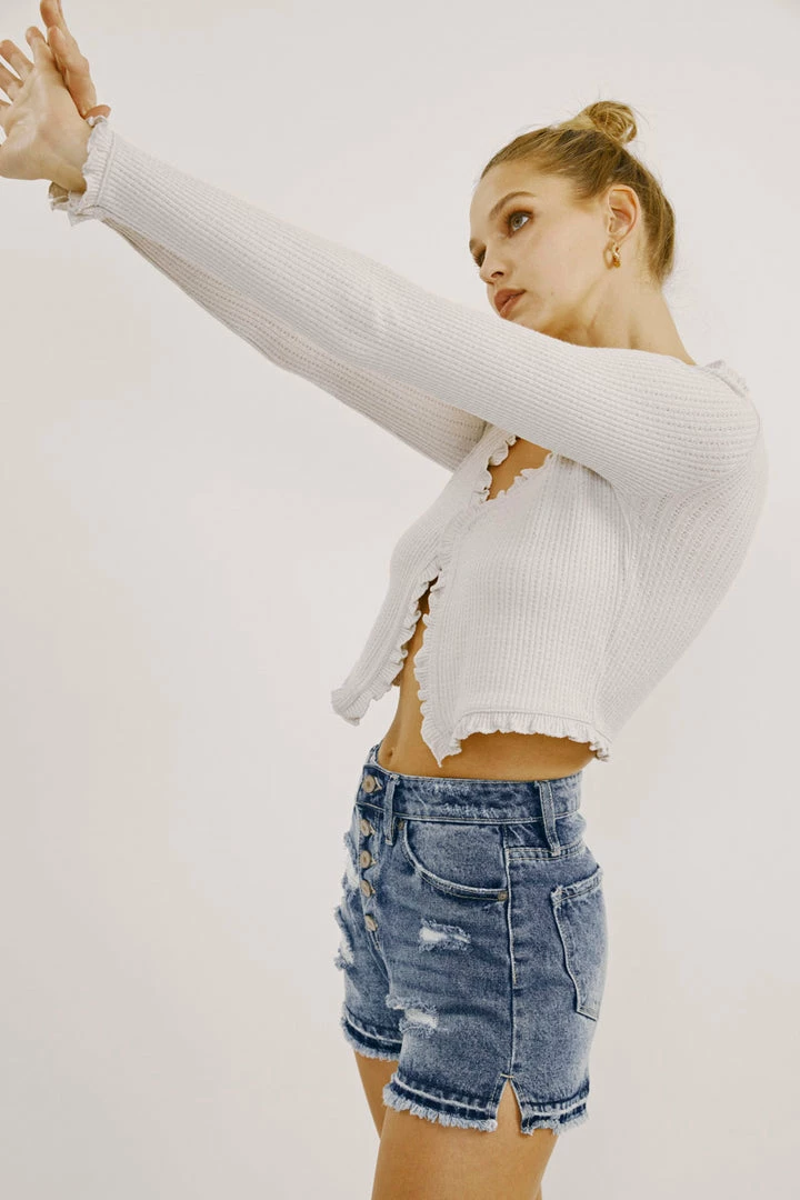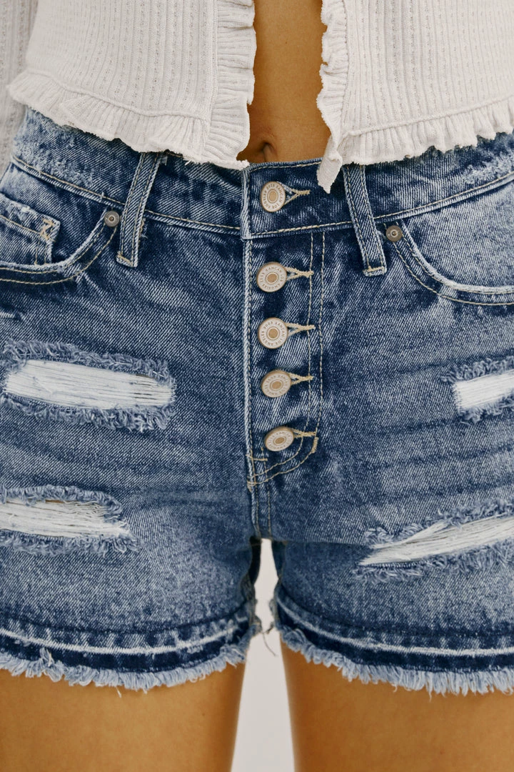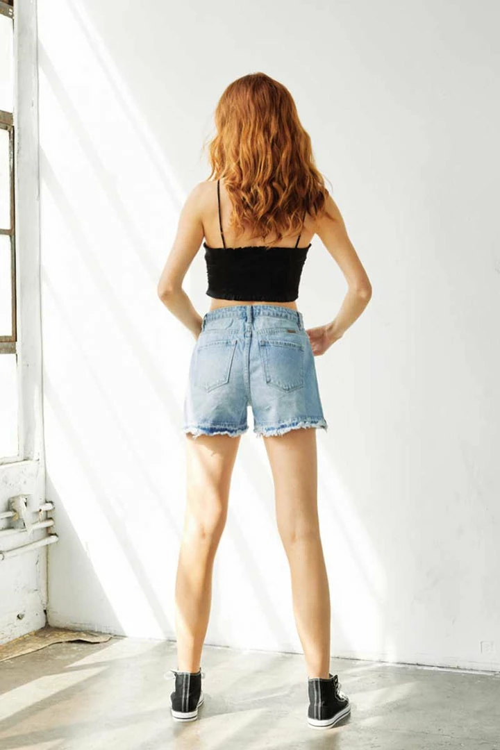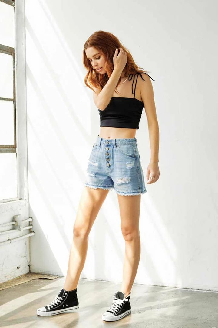 This pair of ultra high-rise, light wash denim shorts will bring out your playful side everywhere you go! Whether you’re headed for a stroll around town or a night out with friends, Lorraine shorts will create a trendy, chic aesthetic! Featuring ultra high-rise fit that cinch and accentuates your waist, distressed details, frayed hems, a 5-pocket design, and a 5-button front closure.