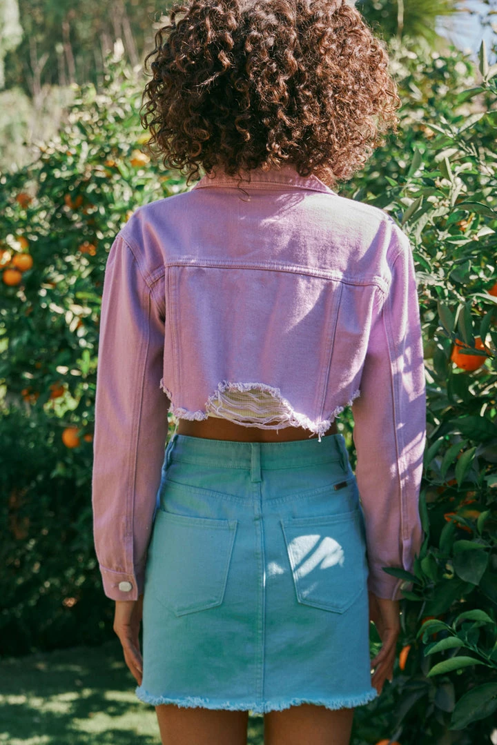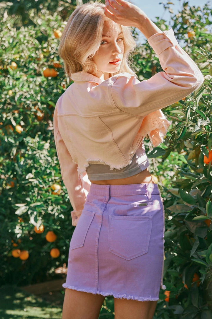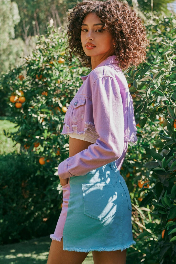 Color block mini skirt that is perfect for maintaining a trendy summer look, featuring center zipper front and raw frayed step hem.