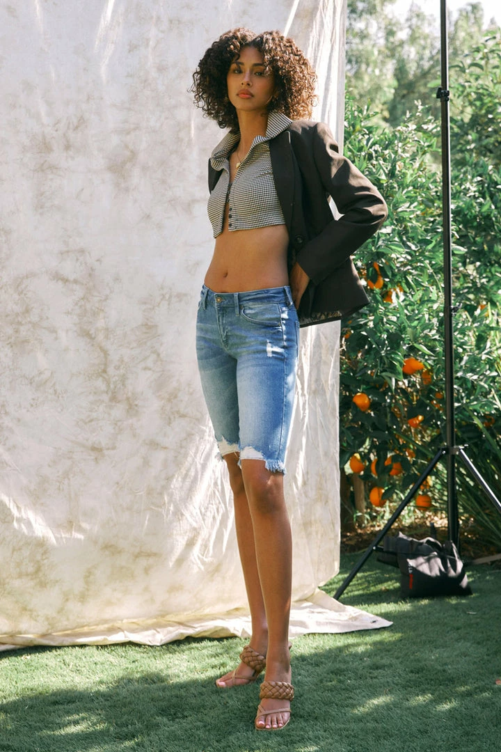 Our Yara Bermuda Short comes in a medium or dark wash with minor distress and a heavily frayed hem for a laidback look. Complete with a button front closure, fading, whiskering, and a relaxed fit that creates a flattering mid-rise style.