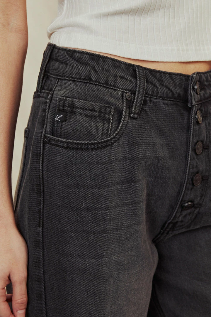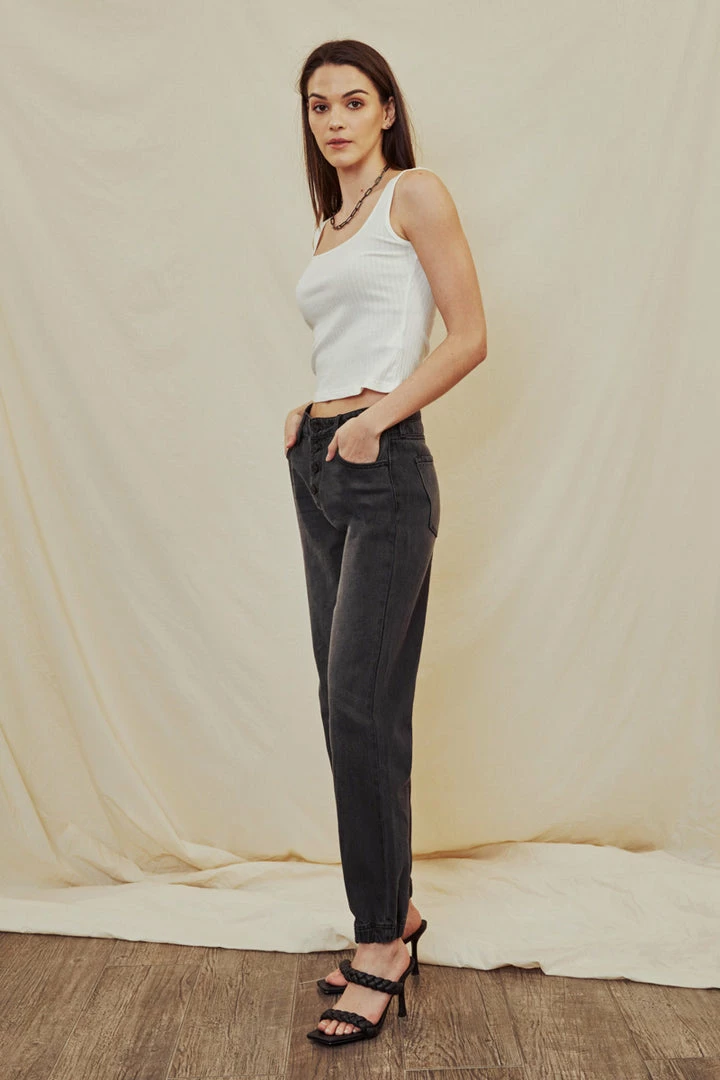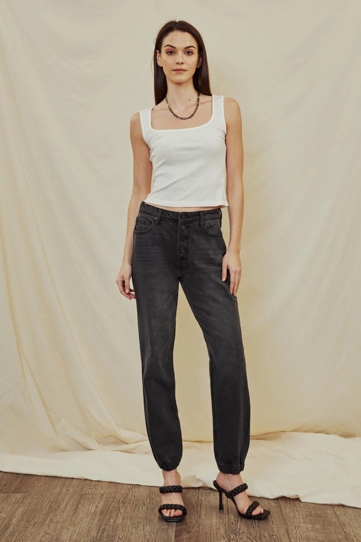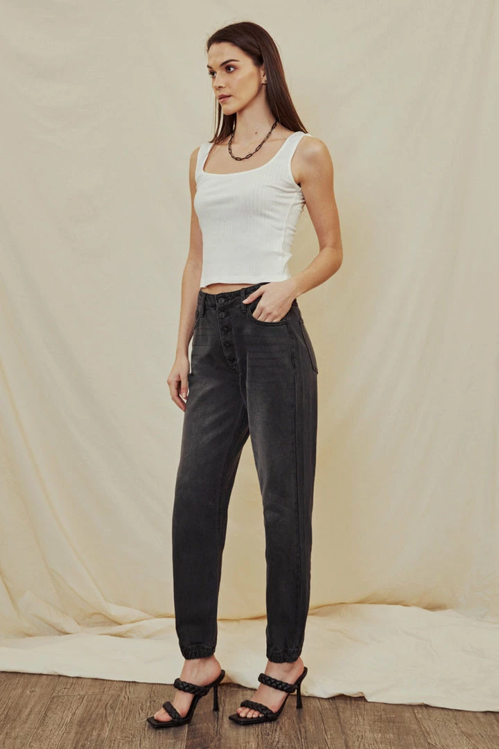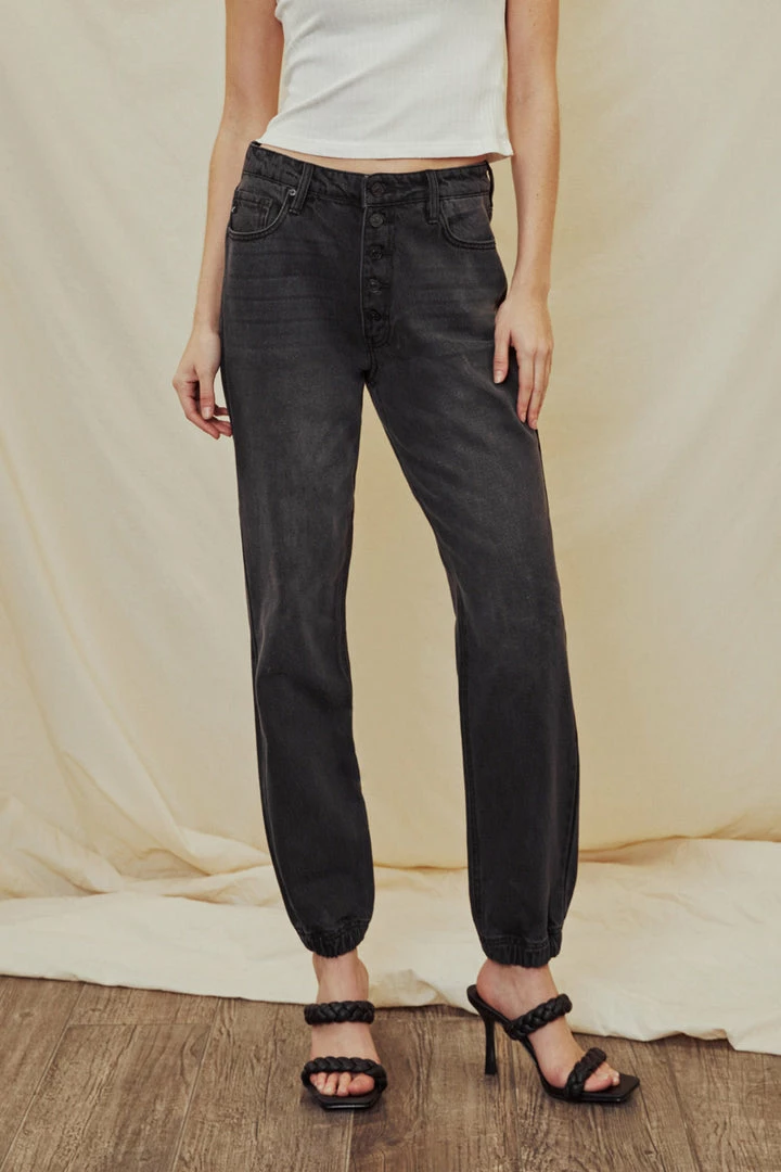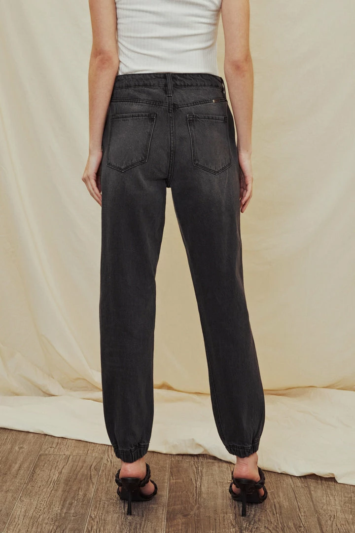 Faded grey non-stretch denim that’s comfortable and lightweight. Our Sheldon High Rise Jogger sits above the natural waistline as it lightly parachutes down the leg and finishes at the hemline that features a crunched elastic hem. Features a classic five-pocket design, and 5 button closure.