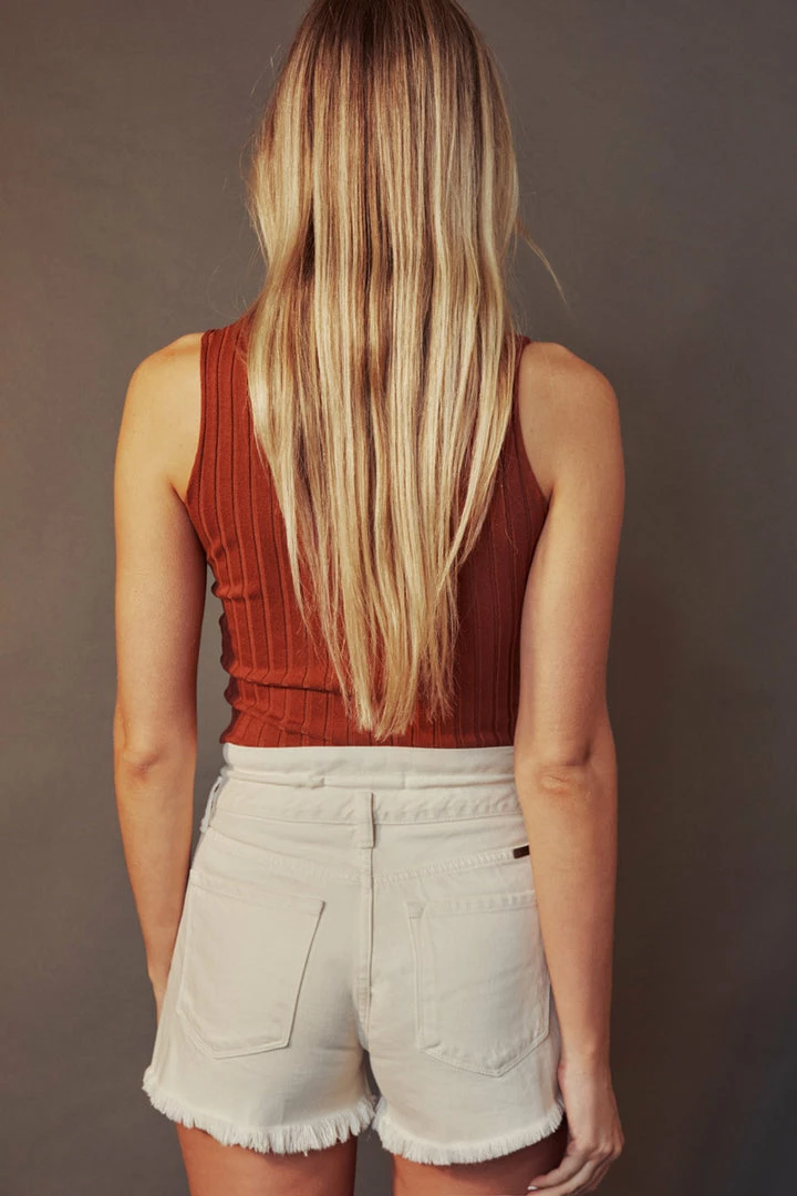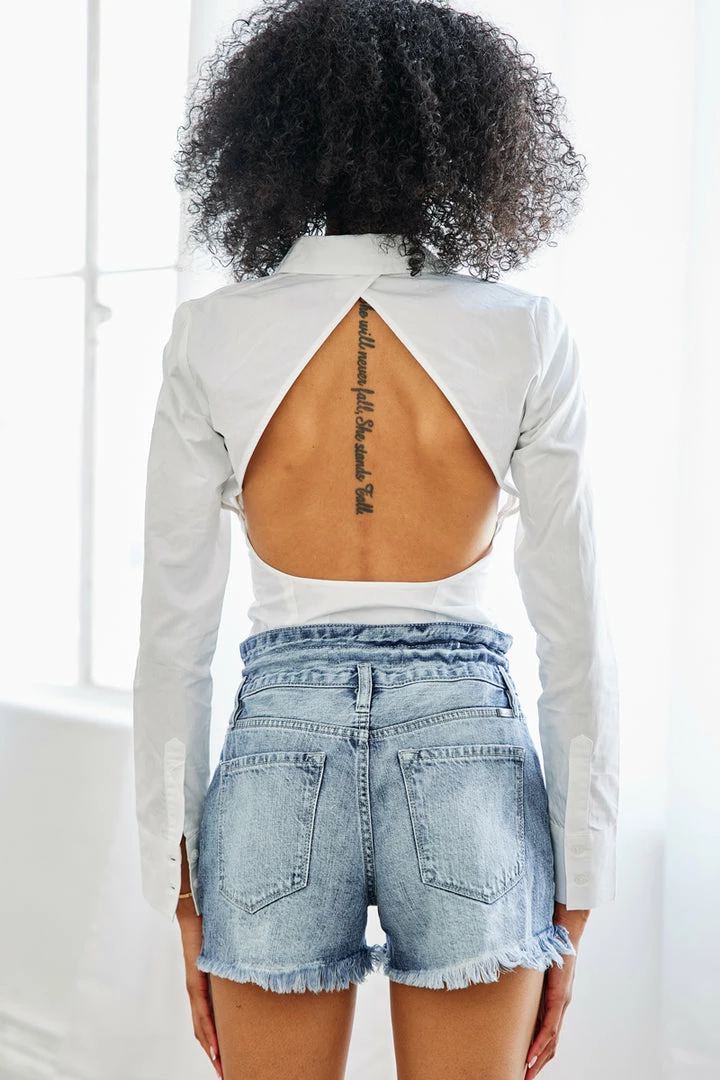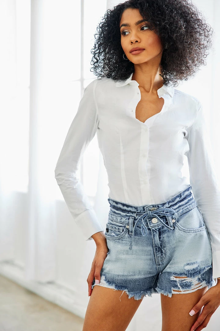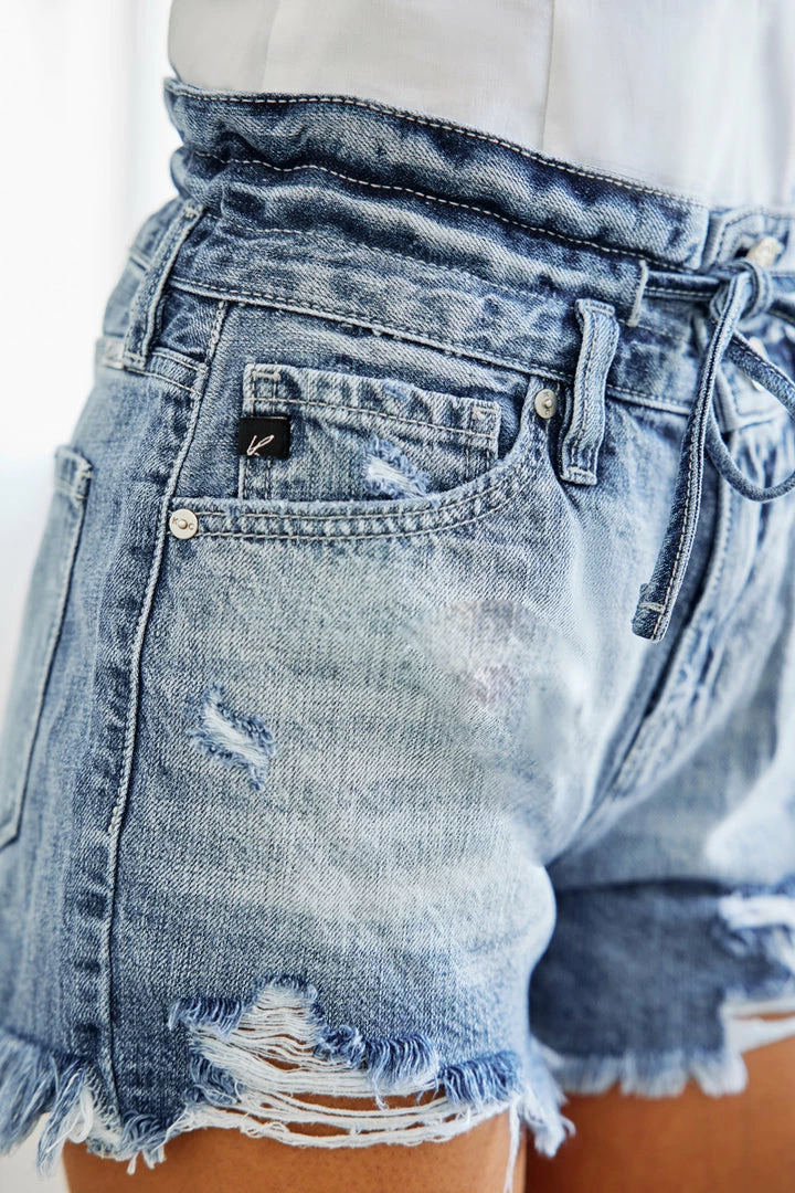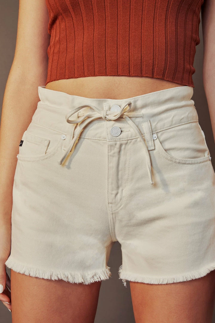 Ultra-high-rise shorts that are available in acid wash or beige that will make the perfect addition to your summer wardrobe. Sits high above the natural waistline with a raw frayed hem for a lived-in look. Its tie-belt accessory gives this piece a stylistic element that adds to its cute, laidback vibe. Made with classic rigid denim, a 5-pocket design, two-button front closure, and tie-belt accessory.