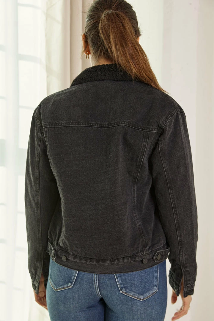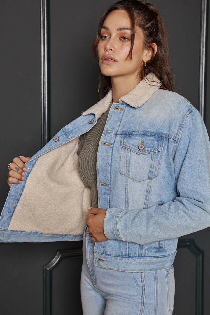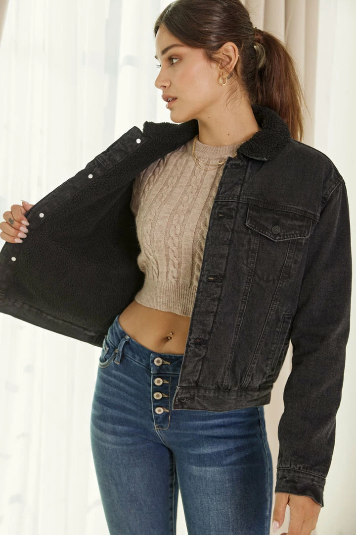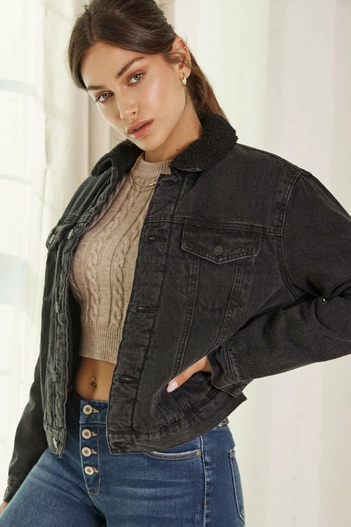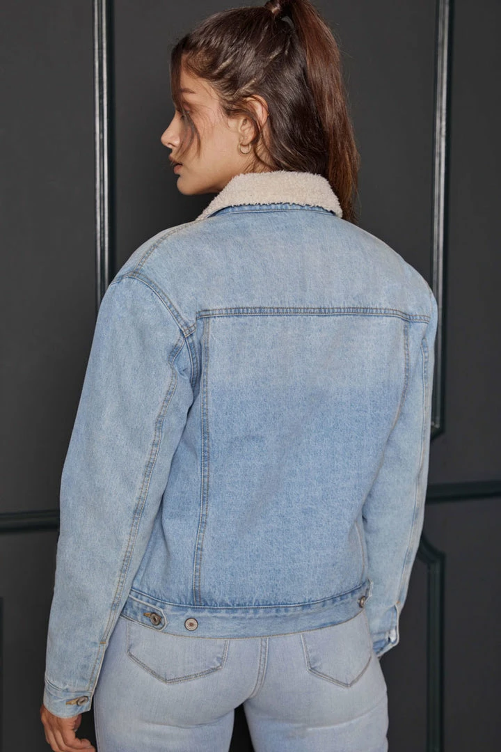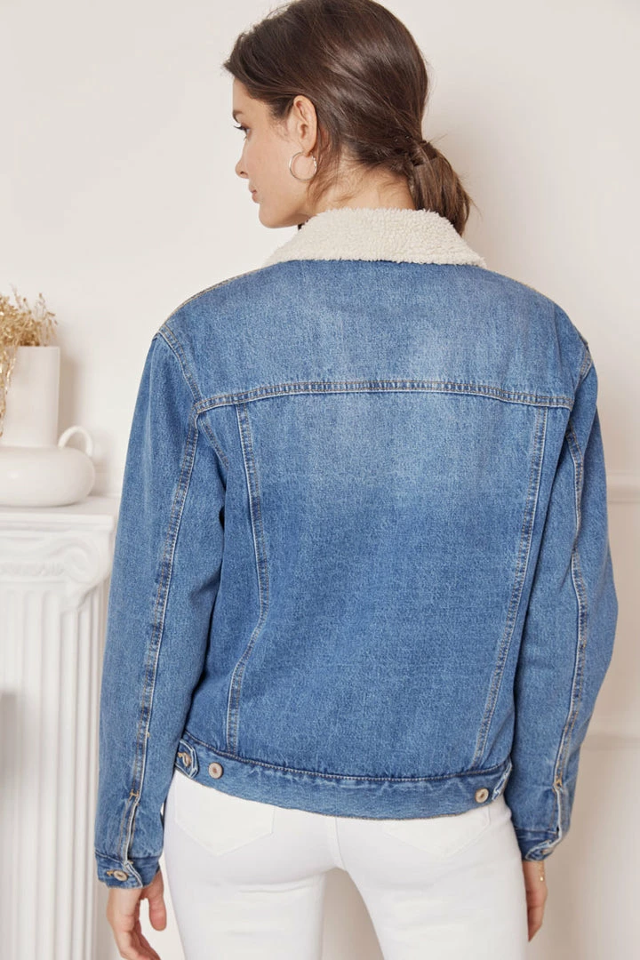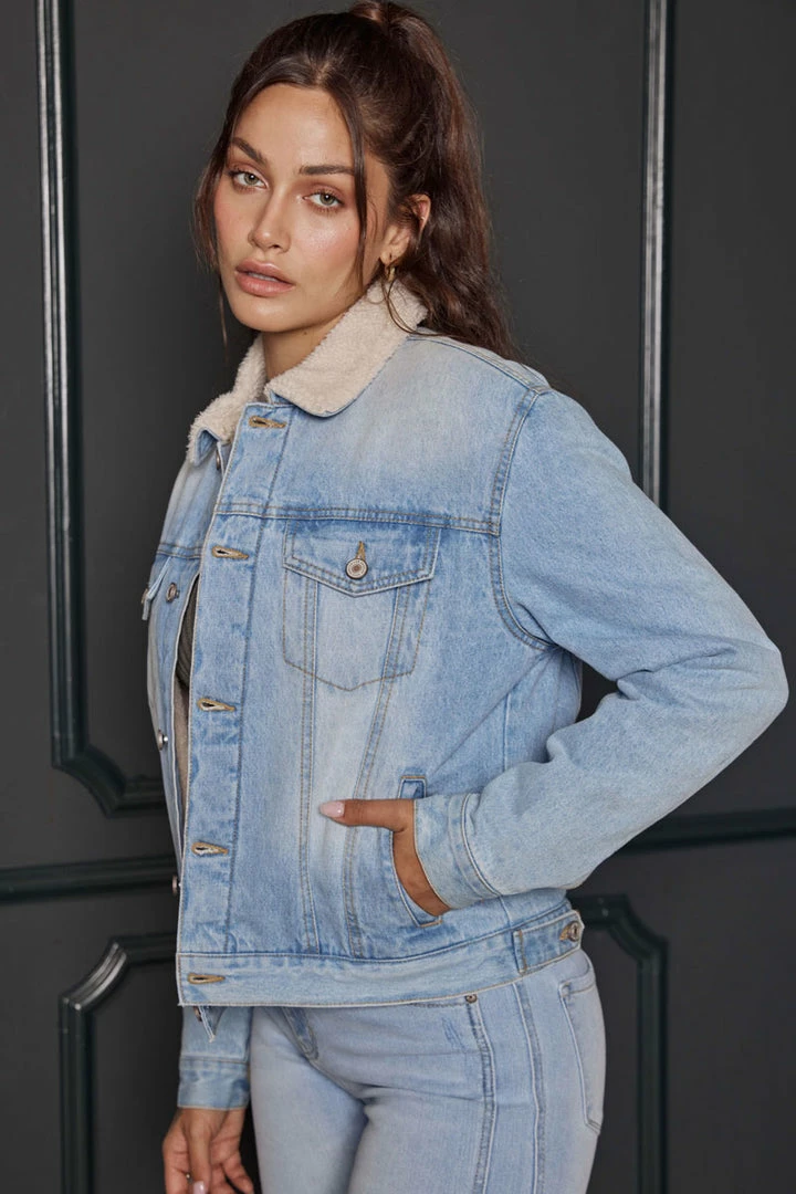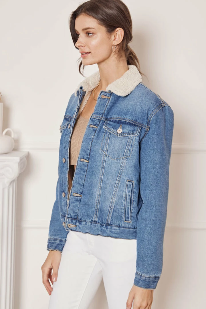 You don’t have to compromise style for comfort with this chic button-down denim jacket featuring a sherpa collar, two front pockets, and two side pockets.