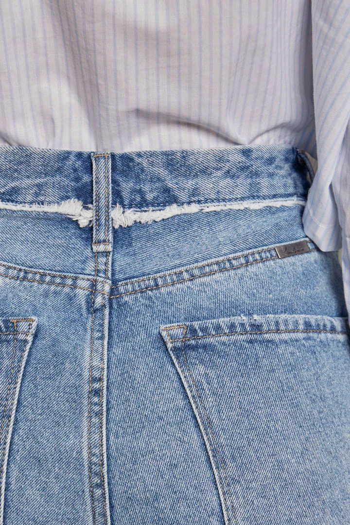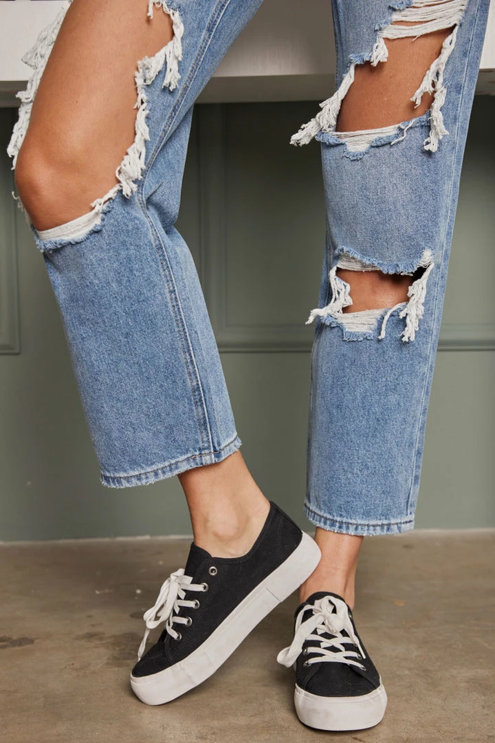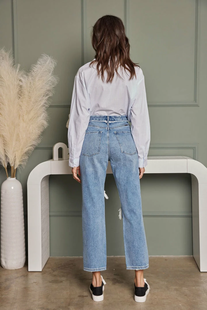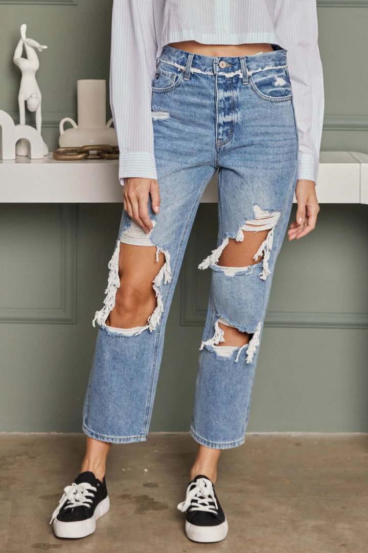 Medium-washed denim with ultra fading detail and destruction on both legs for a worn-in look with a bit of edge. Our Sylvie Ultra High Rise Jeans sit high above the natural waistline as they relax down the thigh and leg for a classic boyfriend fit. A trendy style made with lightweight rigid denim that won’t lose its shape after each wear. Features a classic five-pocket design, five-button front closure, finished with gold-colored hardware.