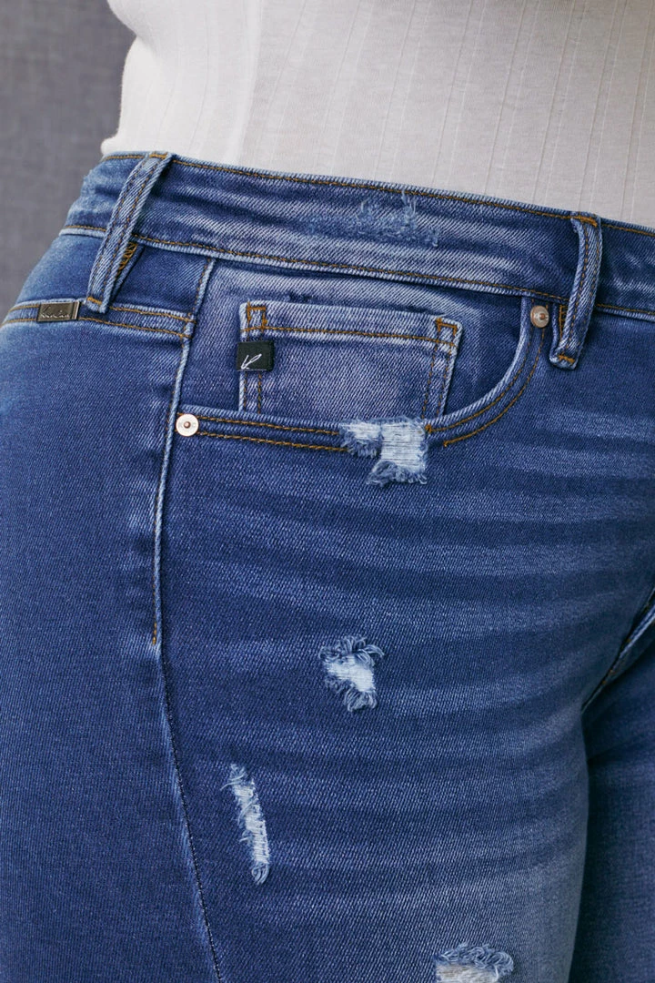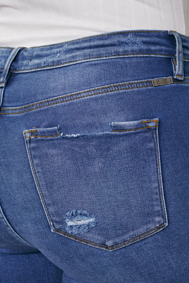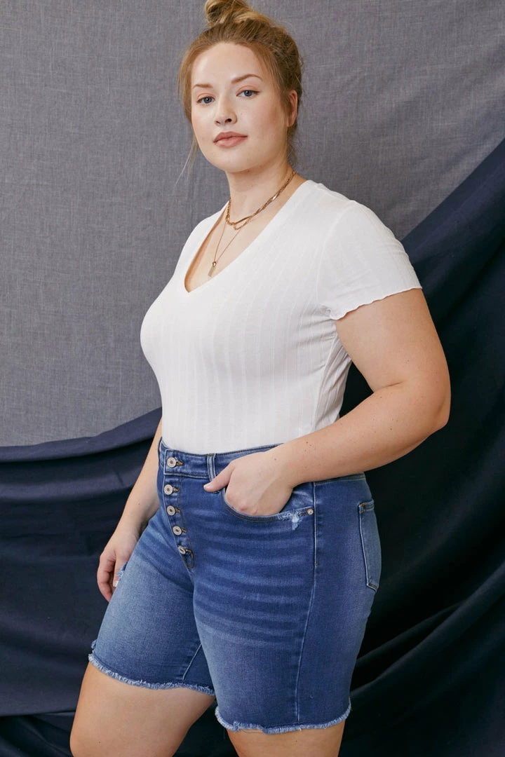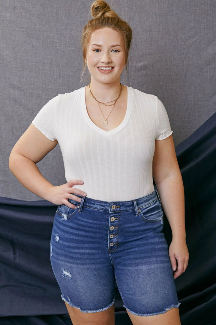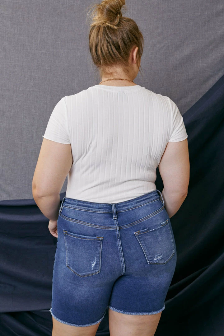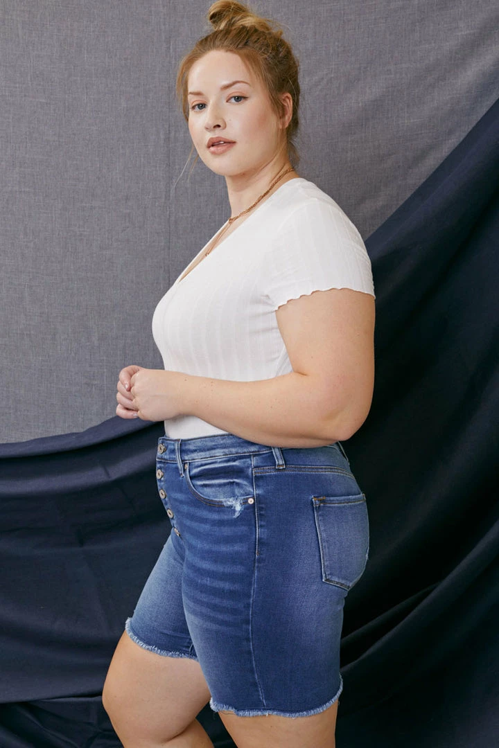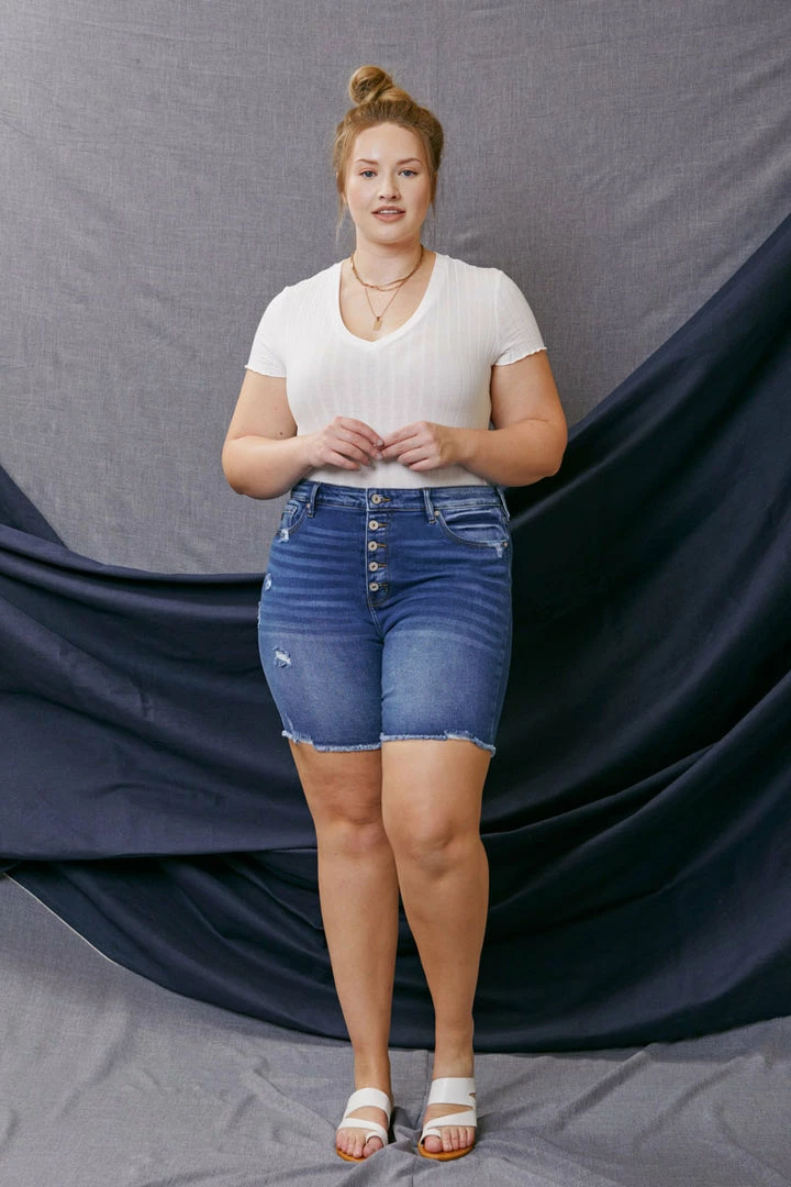 Our Tammy medium wash Bermuda short features a distressed hem with fading and whiskering. Its style accentuates every curve giving you a sleek yet fitted silhouette that complements any vibe. Sitting right at the waist with ultra high-rise and traditional five-pockets, it’s a fun twist on a classic short design.