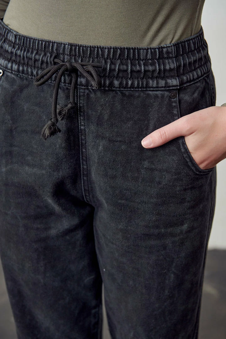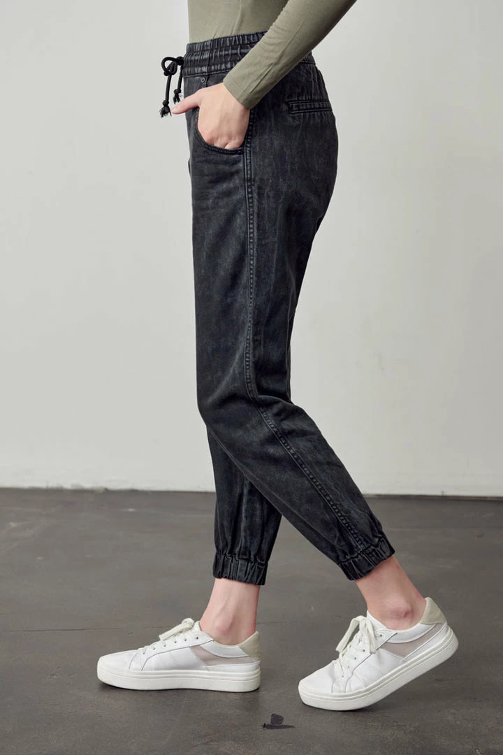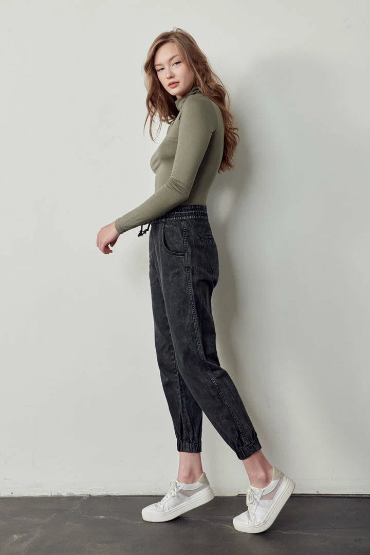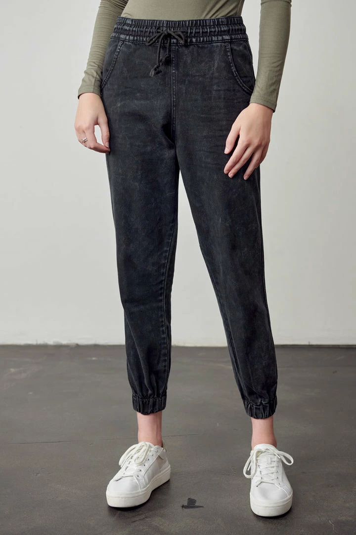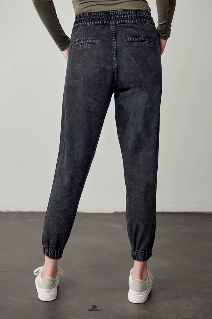 Our Tantina Ultra High Rise Jogger comes in a faded black tie-dye wash featuring an elastic waistband, drawstring, and elastic scrunch bottom right above the ankles. This jogger comes with 2 front pockets and 2 faux welt back pockets. Its relaxed fit is designed to give you comfort throughout the day.Â