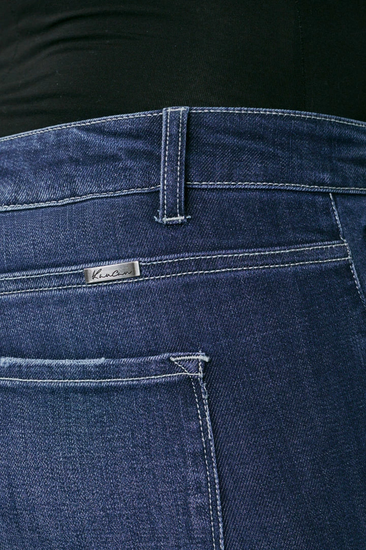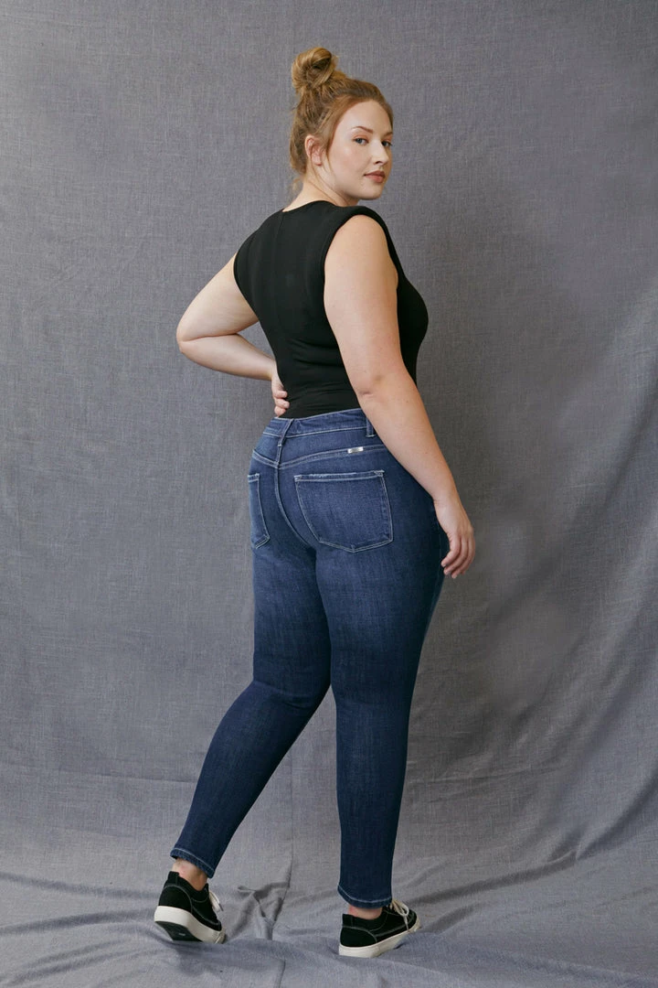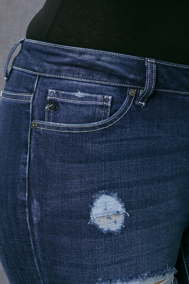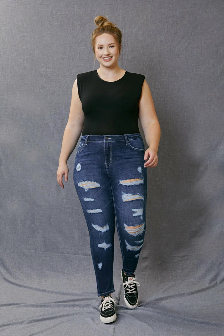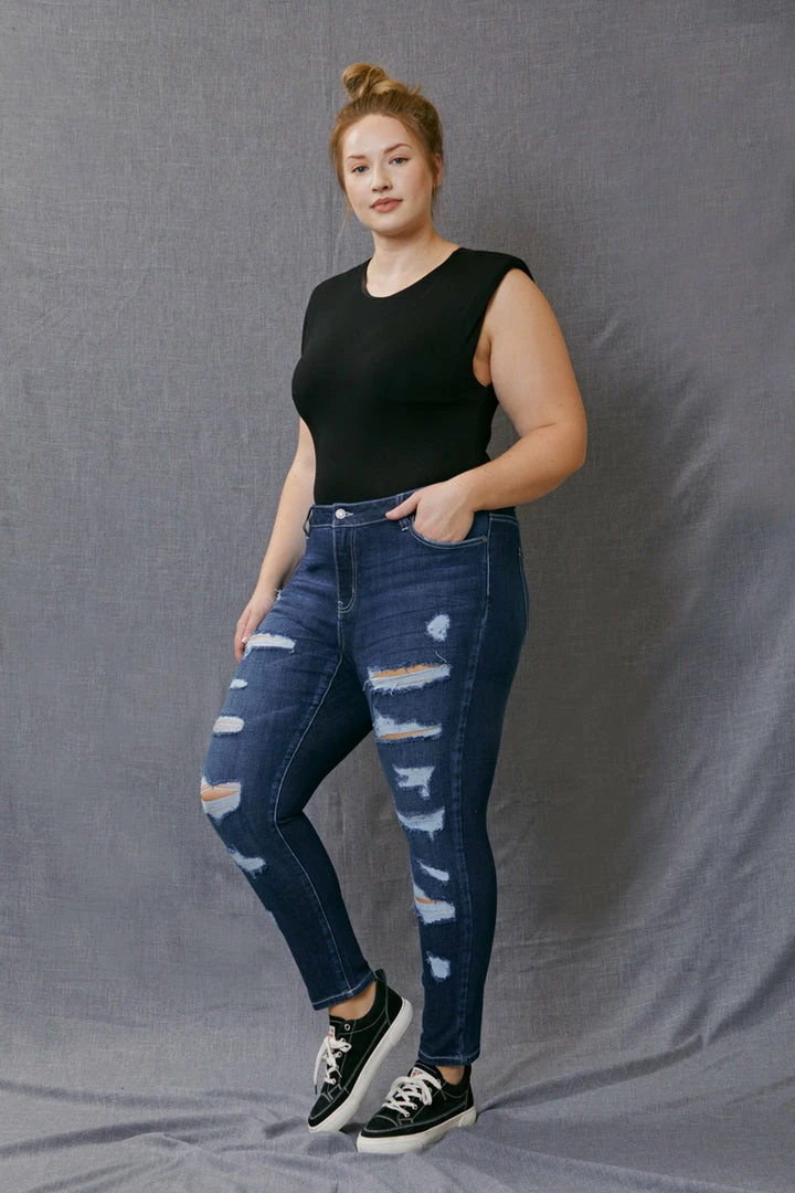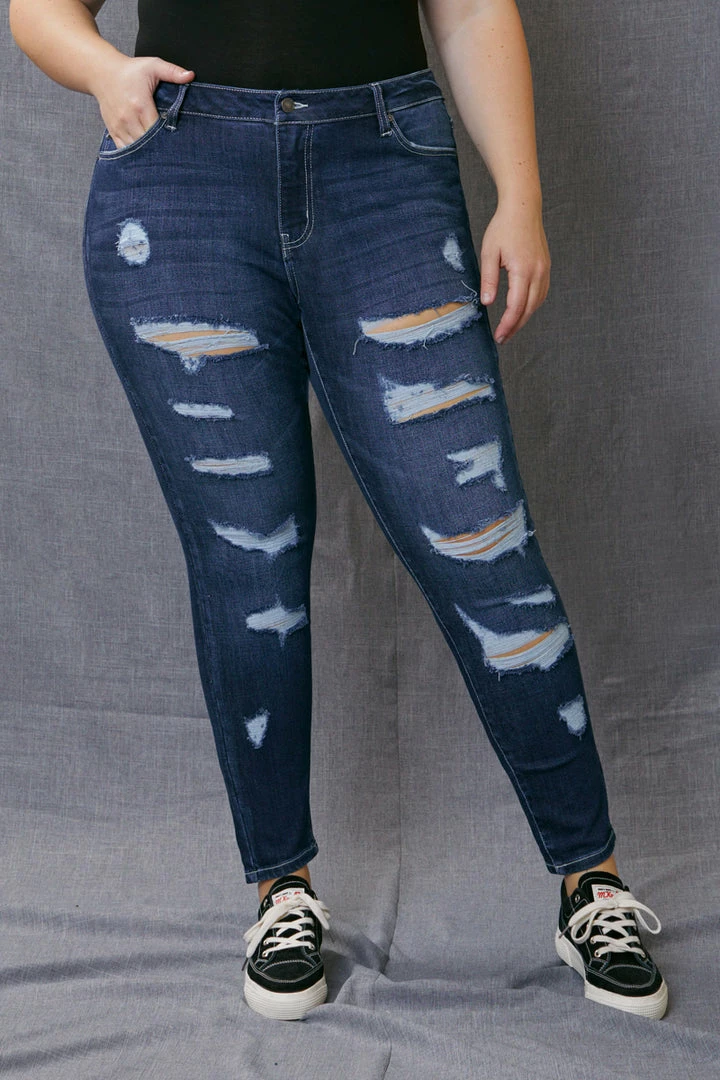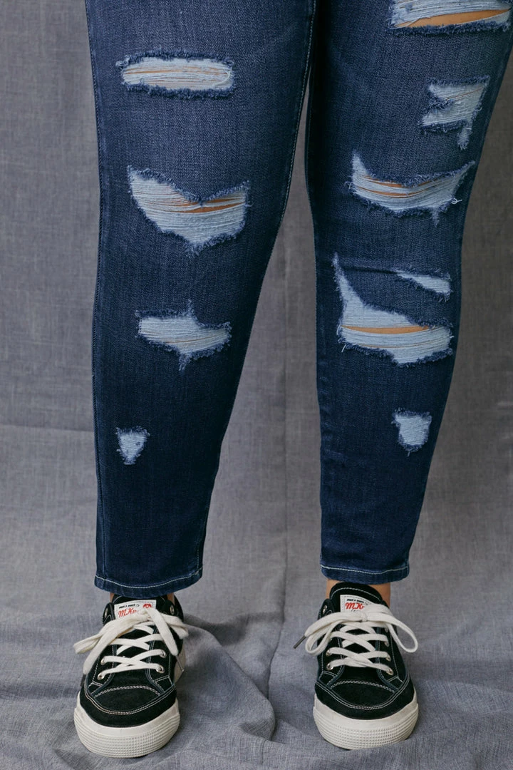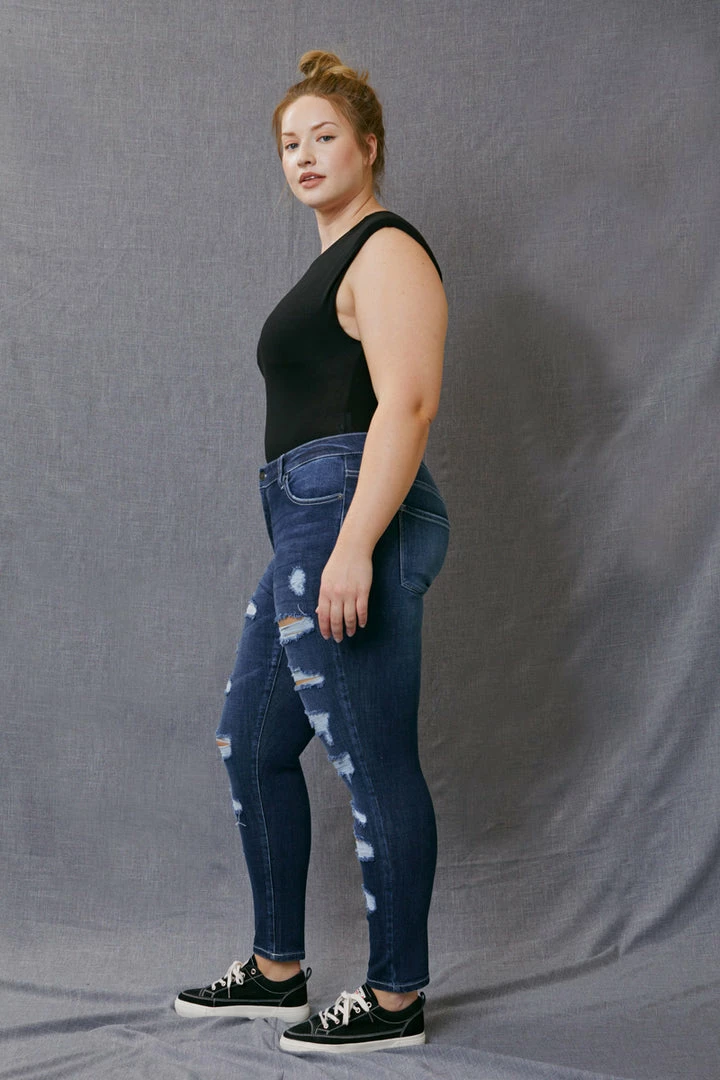 Distress finds a new meaning with this dark blue high-rise super skinny. This style comes with heavy distress that accents a beautiful deep blue shade. Perfect for creating a ruggedly chic look.