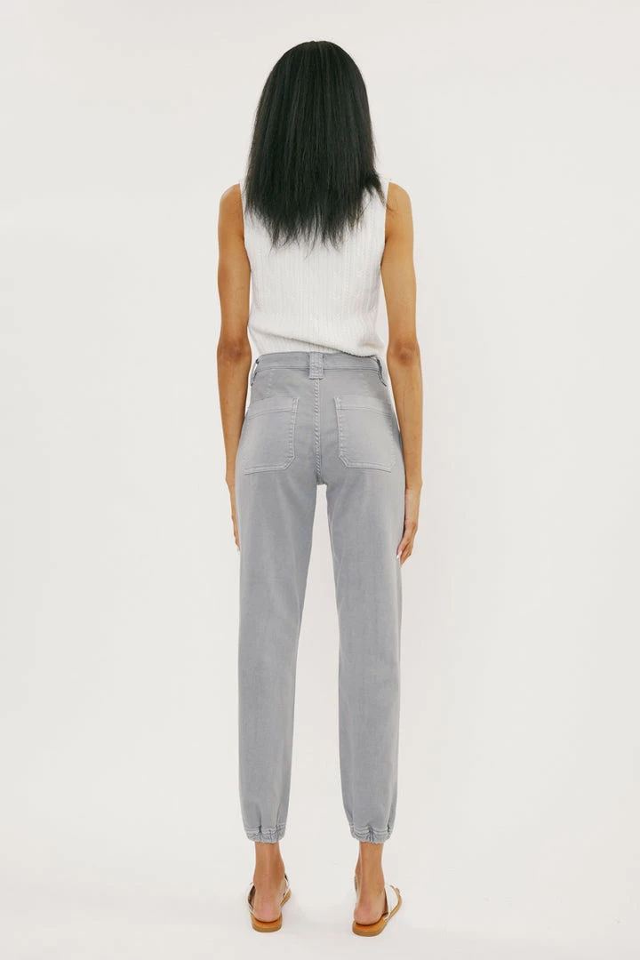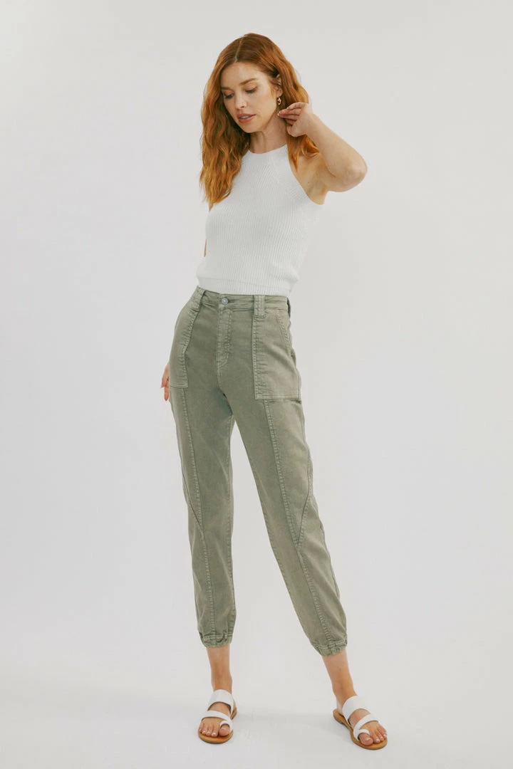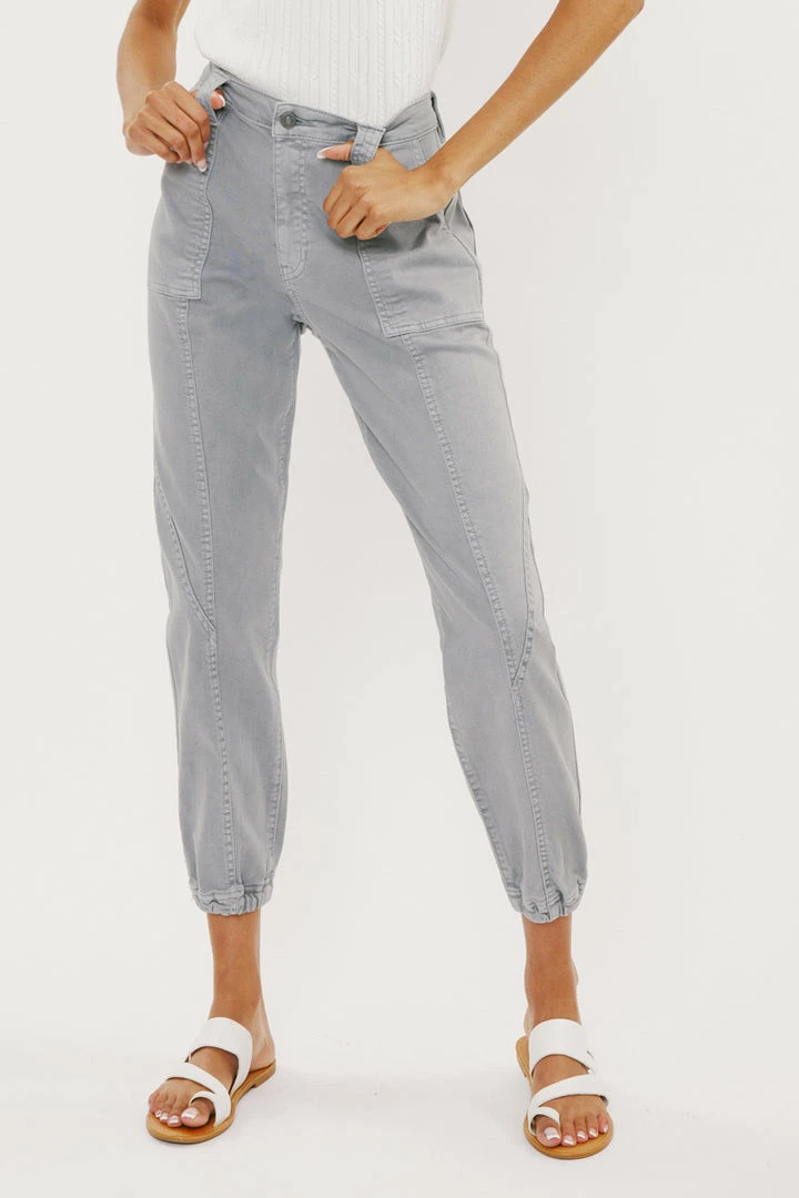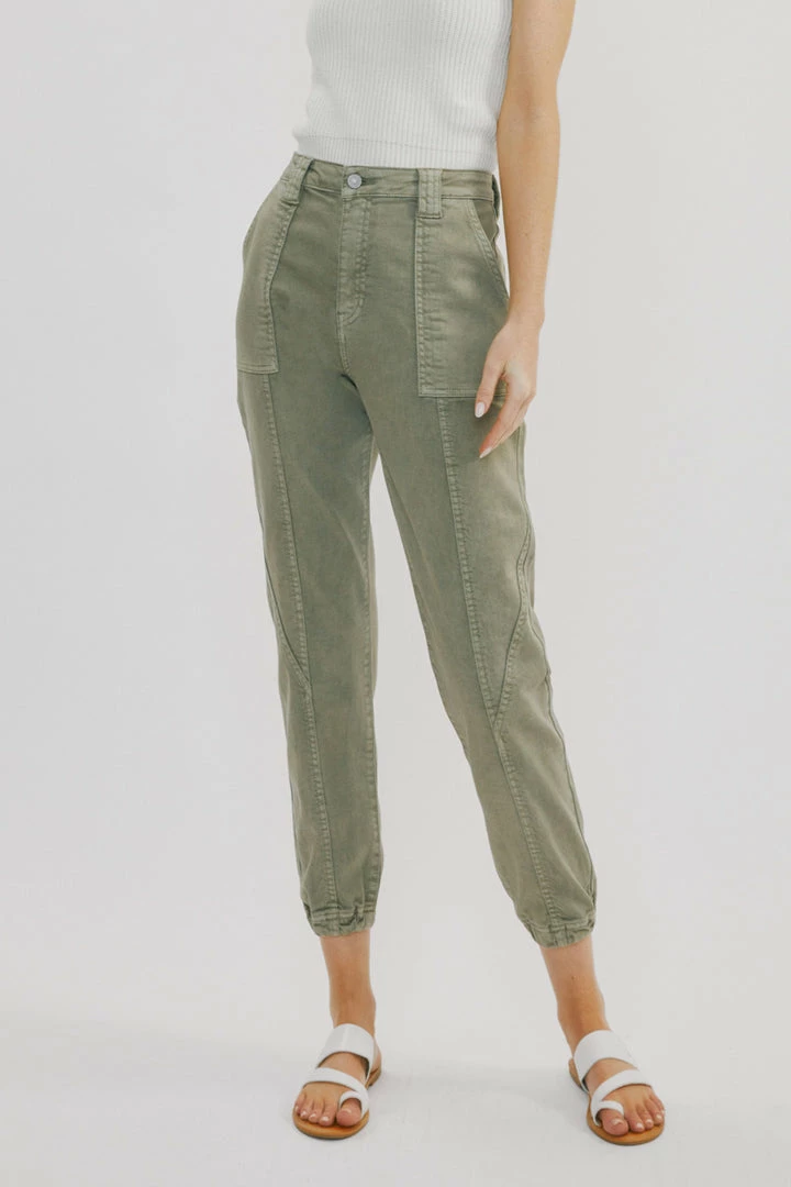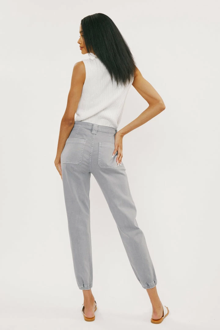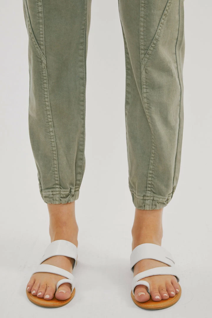 Denim joggers available in a beautiful green or light grey wash structured with front seam details that come together to form this unique jogger style. Our Tatiana High Rise Jogger sits above the natural waistline as it lightly parachutes down the leg and finishes at the elastic scrunch hemline. Made with comfort-stretch denim that’s comfortable and lightweight. Features 2 font spacious slant pockets, 2 back pockets, wide belt loops, a single-button front, and a zip-fly closure.Â