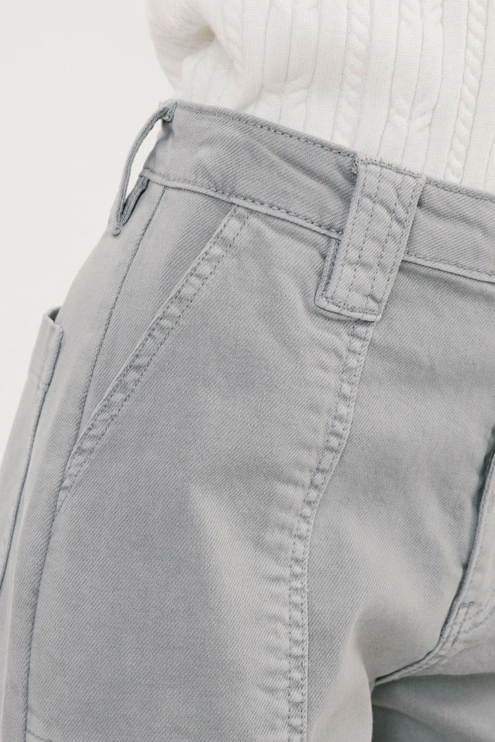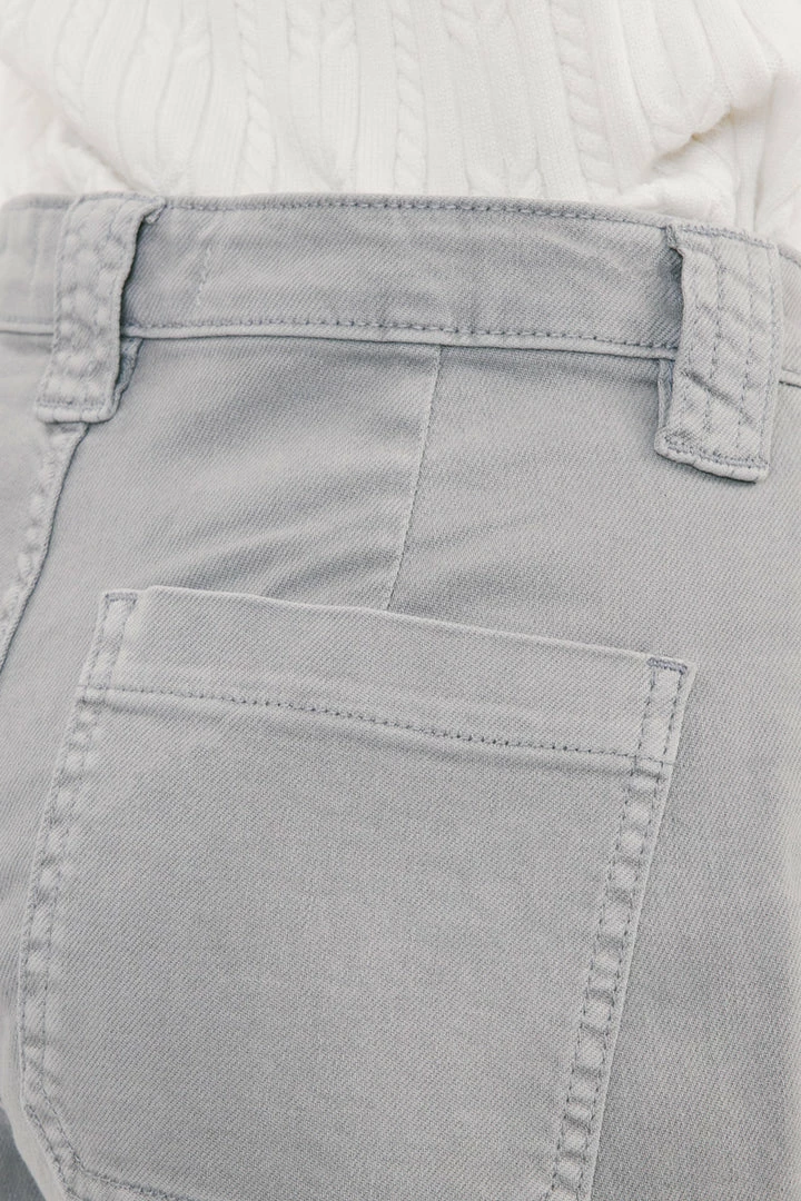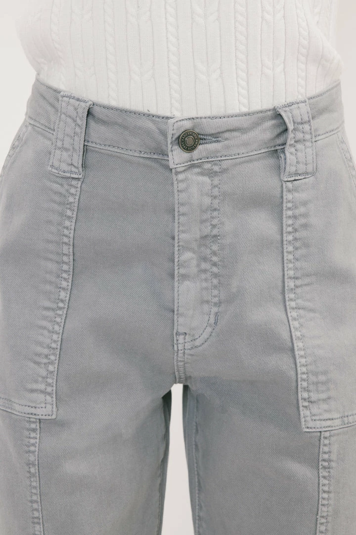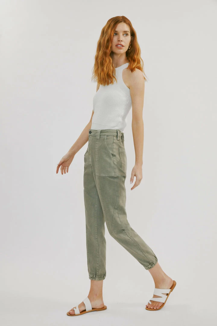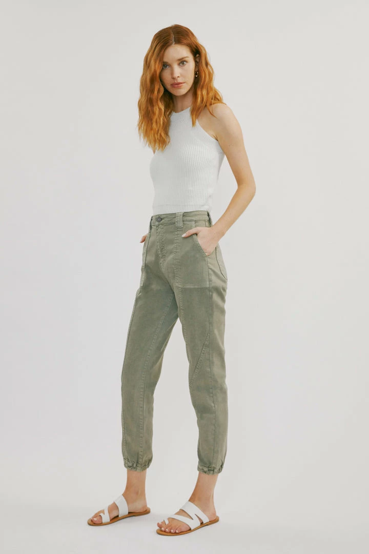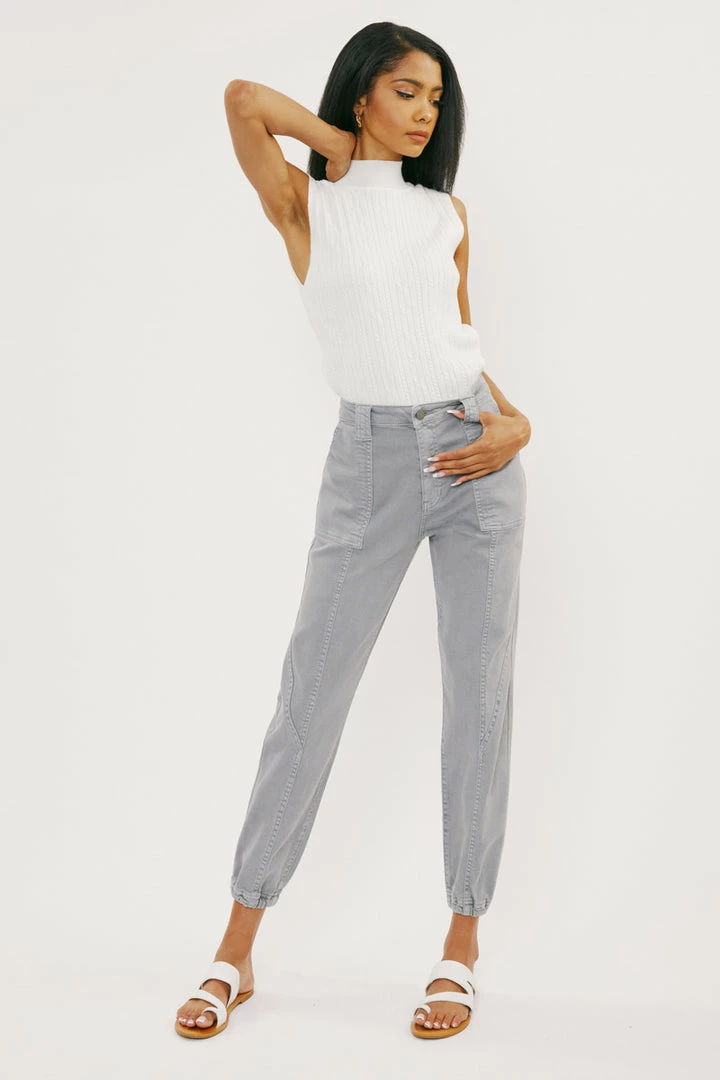 Denim joggers available in a beautiful green or light grey wash structured with front seam details that come together to form this unique jogger style. Our Tatiana High Rise Jogger sits above the natural waistline as it lightly parachutes down the leg and finishes at the elastic scrunch hemline. Made with comfort-stretch denim that’s comfortable and lightweight. Features 2 font spacious slant pockets, 2 back pockets, wide belt loops, a single-button front, and a zip-fly closure.Â