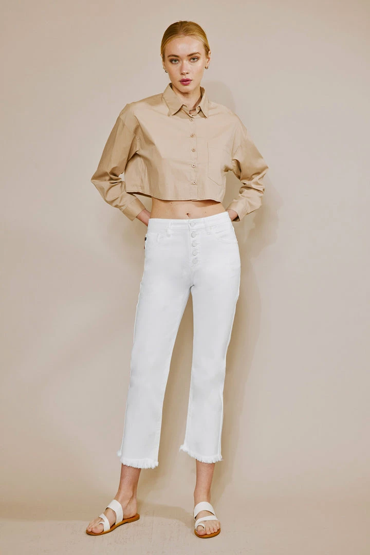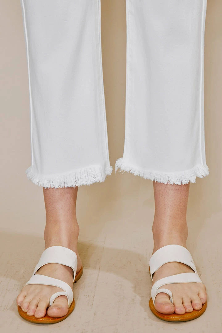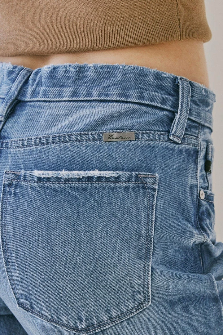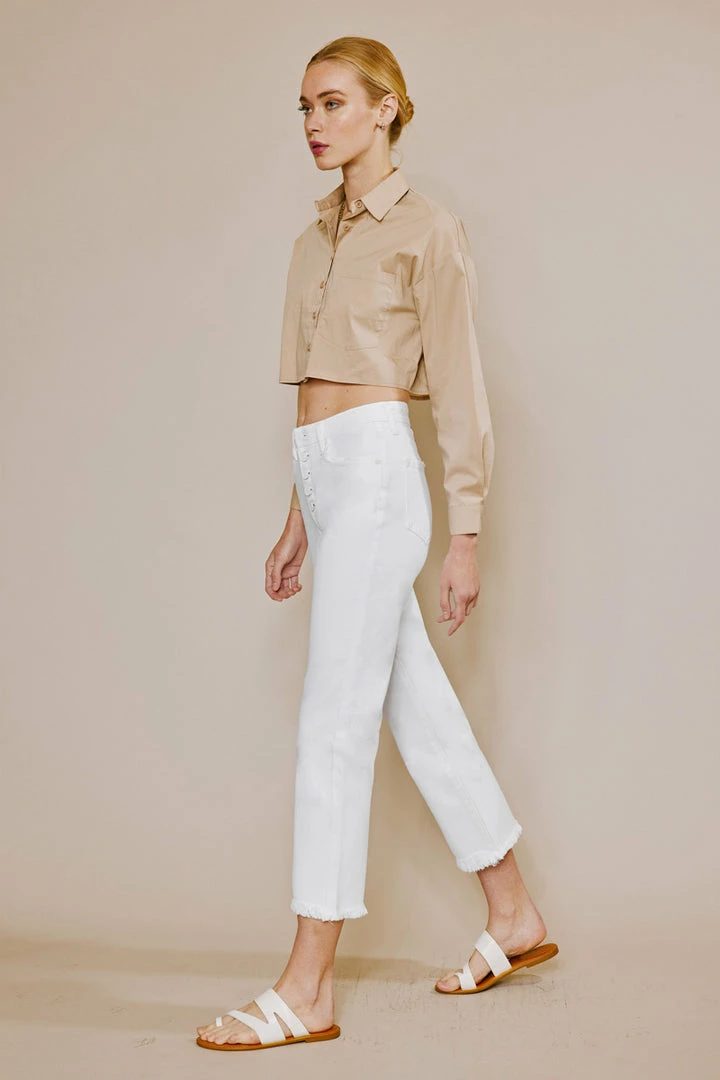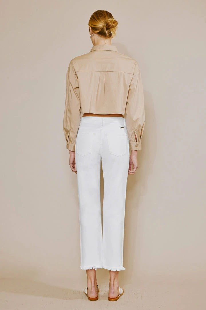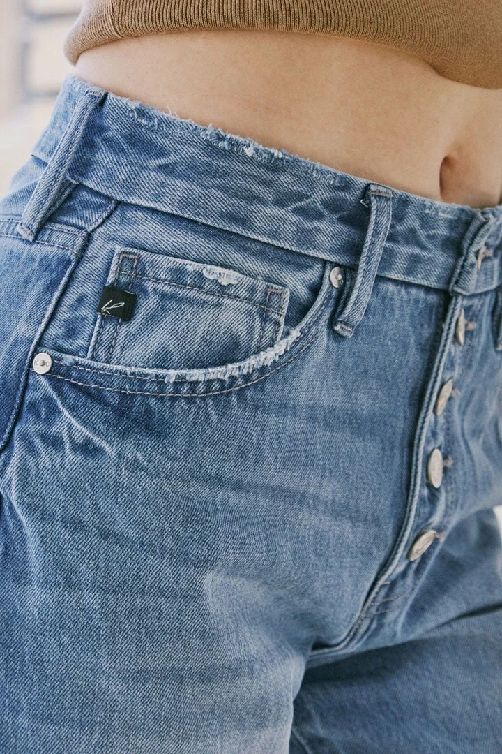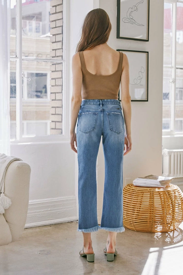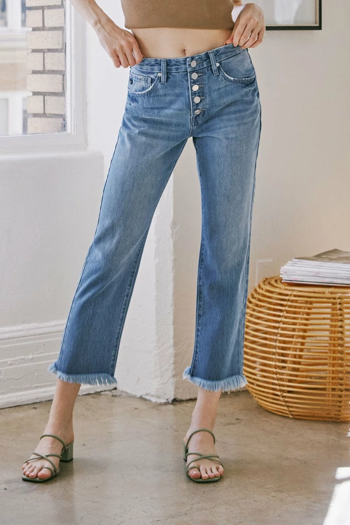 Medium and light-wash denim with slight fading and marbling throughout as it relaxes down the leg and finishes at the ankle with a frayed hem. Our Taurus High Rise Jeans sit above the natural waistline as it gently drapes down the legs for a classic straight-leg fit. Made with rigid denim that gives you an original, blue jean feel that’ll never go out of style. Features a classic five-pocket design and five-button button-up closure. Finished with gold-colored hardware.