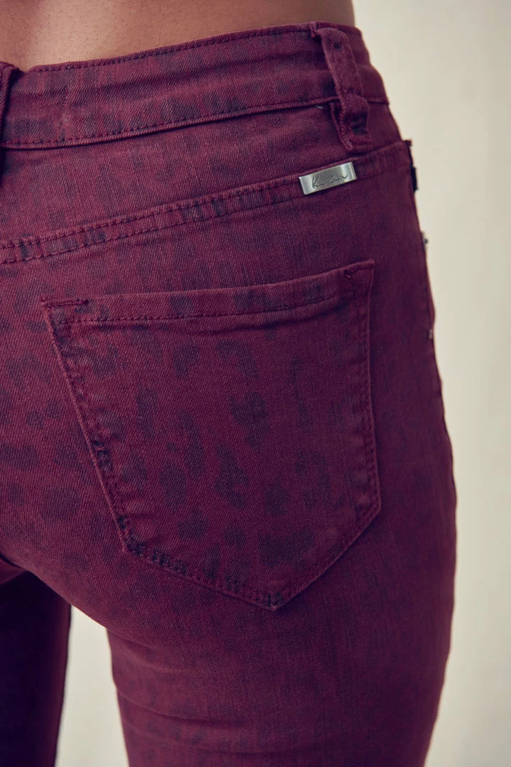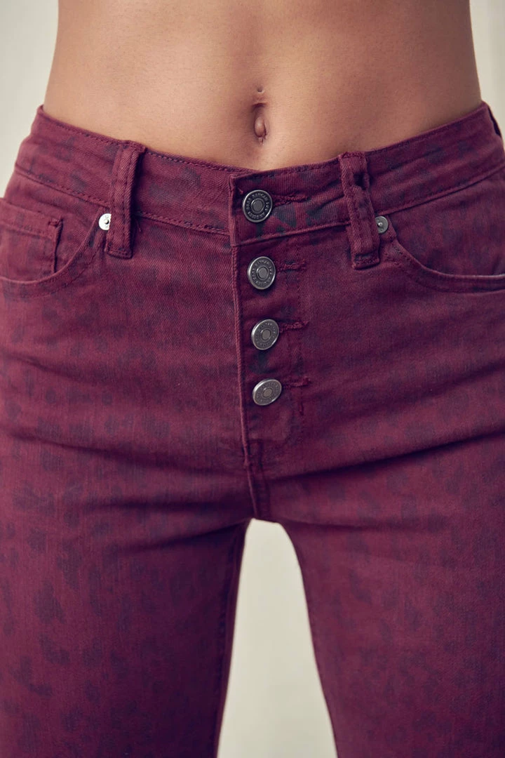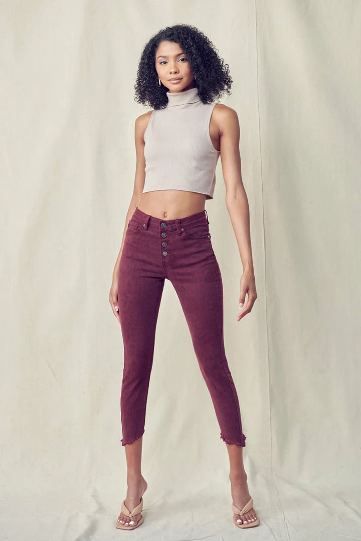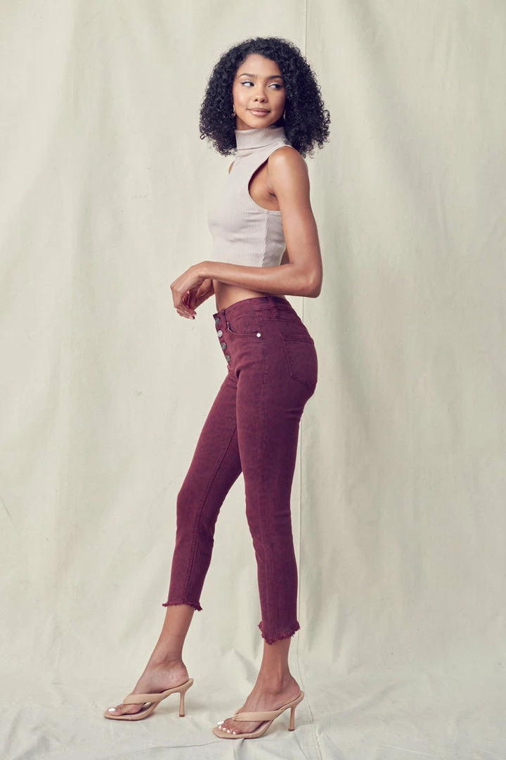 Our Tayona cropped skinny jean features a burgundy leopard print wash with slanted raw edge hems. Its rugged look is softened by its skinny fit and high waist design, giving it a more stylish feel. This jean was made for chic babes like you.