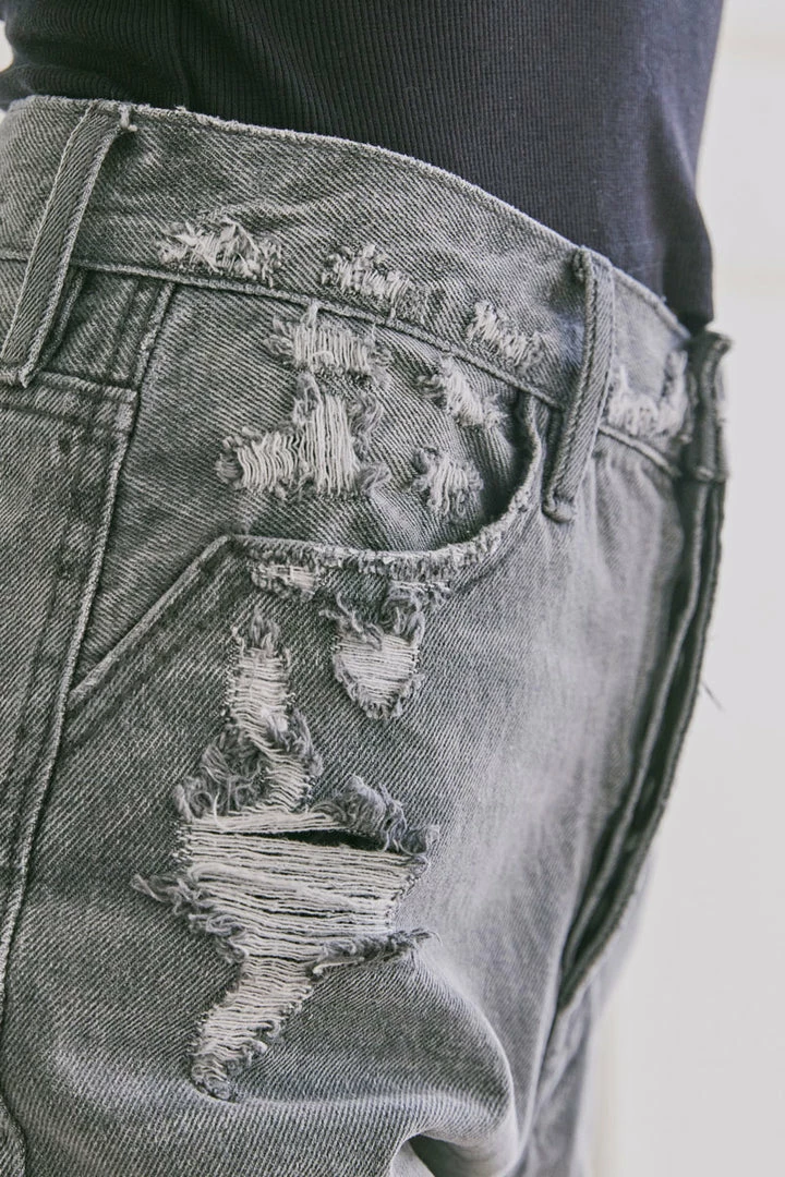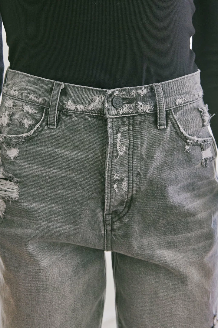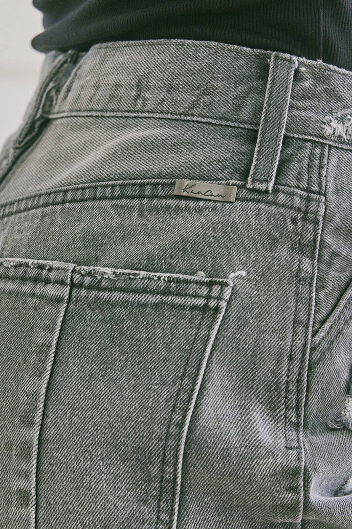 The light grey 90’s Bermuda shorts feature a frayed hem with slightly distressed details, fading, and whiskering. Its style is a classic 90’s fit that is a more relaxed fit for that extra beachy vibe. Sitting above the waist with an ultra high-rise fit and traditional five-pockets, it’s a refreshing take on a classic short design.