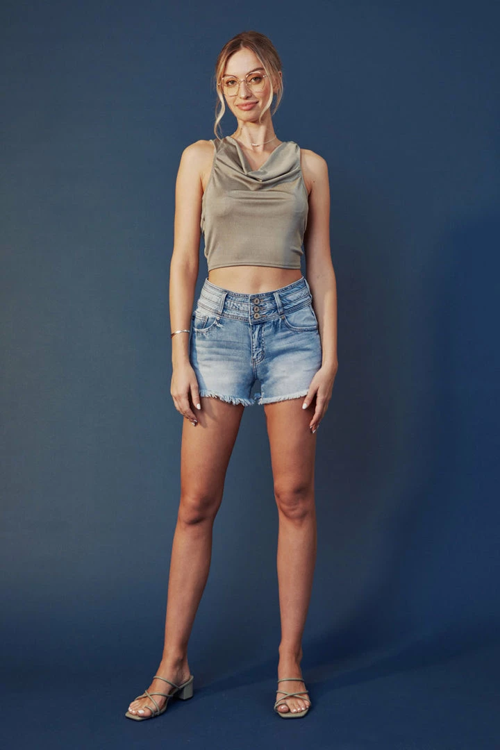 This pair of high-rise, medium wash denim shorts will keep you comfy yet stylish everywhere you go! Whether you’re headed for a stroll around town or a night out with friends, our Judie shorts will create a chic, laid-back aesthetic! Featuring a high-rise fit that cinch and accentuates your waist, whiskering, fading, frayed hems, a 5-pocket design, and a triple button closure with zip fly.Â