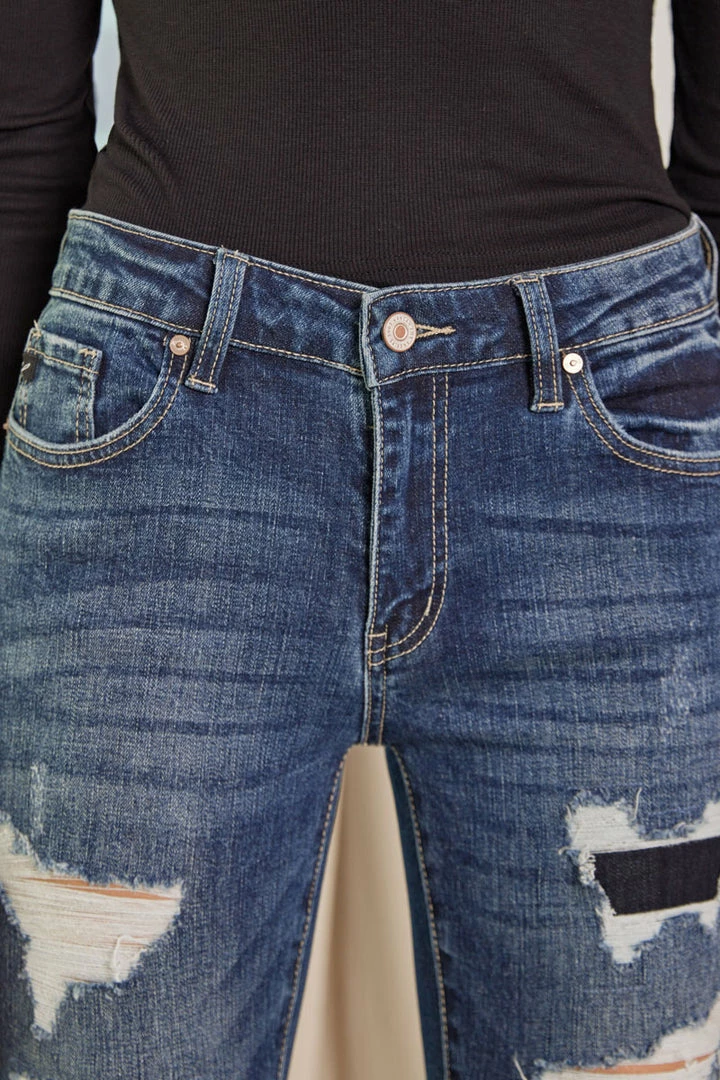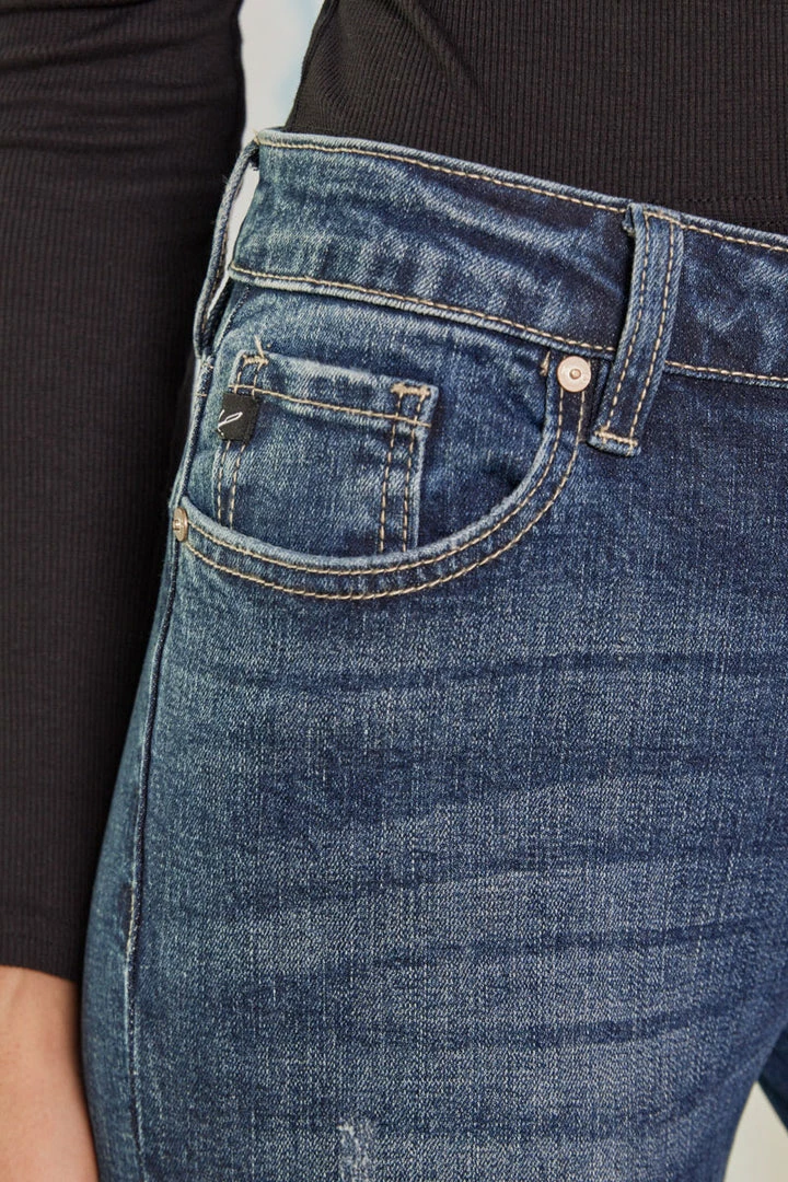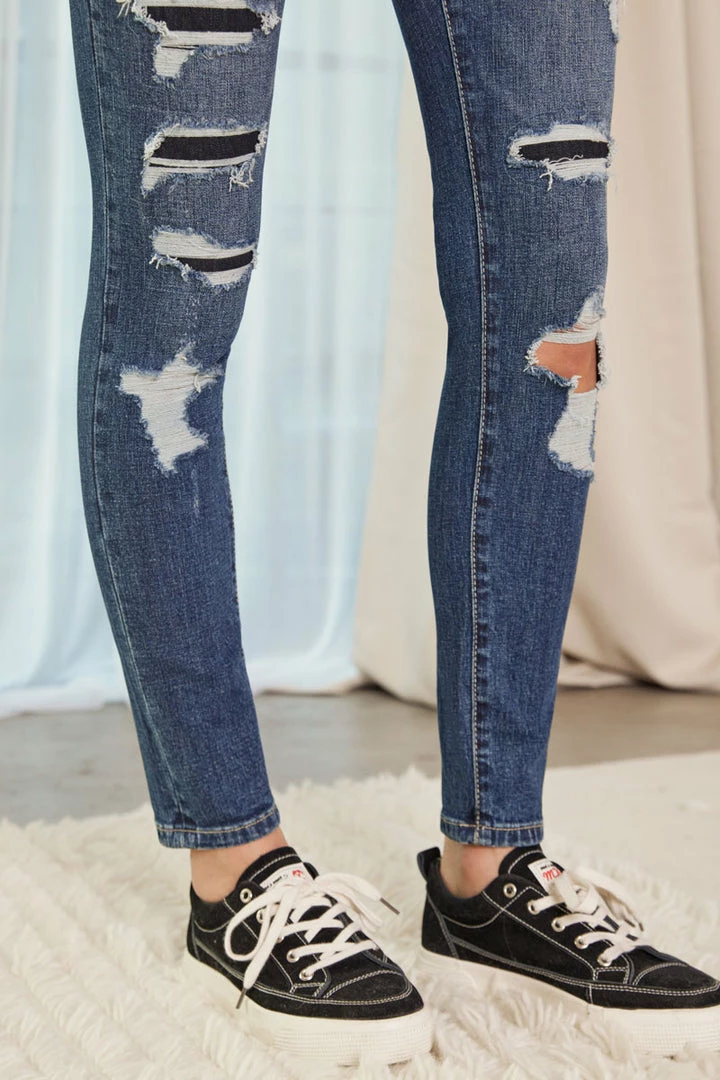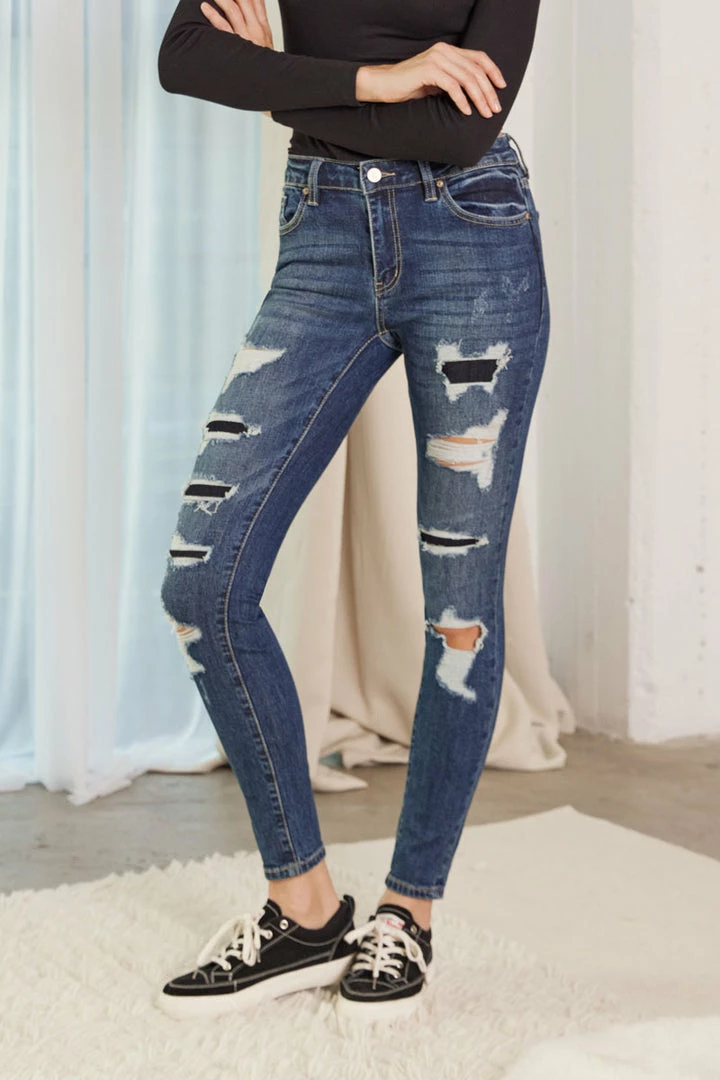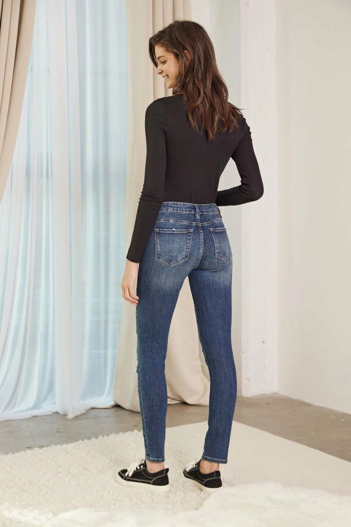 Midnight blue dark stone washed figure-formatting skinny that smoothly fit and hug your body, featuring subtle distresses, tattered and rip and repair detailing.Â