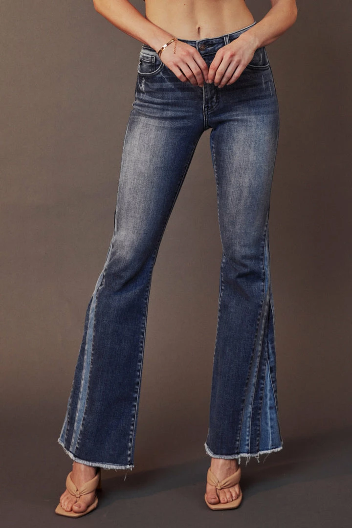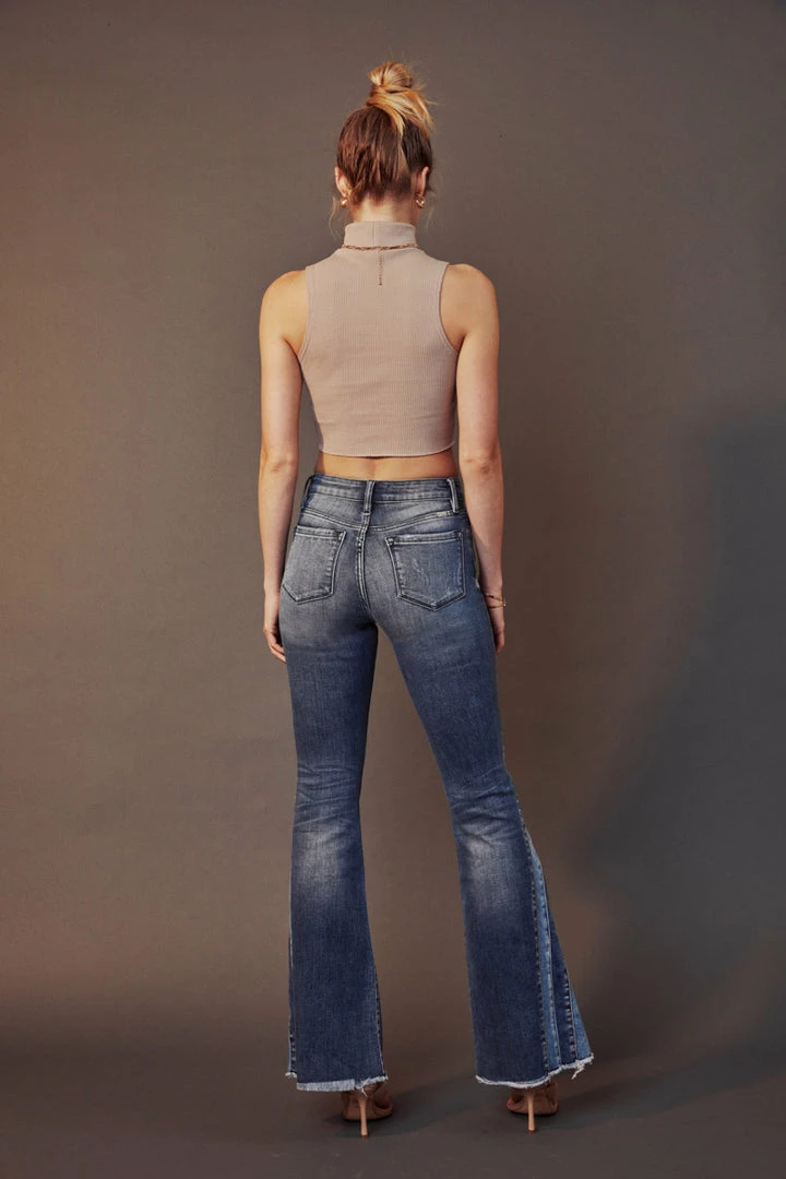 Show off your style with this pair of Treasure flare jeans with silhouette-enhancing medium-washed flare jeans crafted from soft denim, featuring light whiskering, fading, subtle distressed detailing on the front and back pockets. These flares come with the classic 5-pocket design and single button closure. With a piecing detail at the side bottom, this style is perfect for adding a flare to any outfit.Â