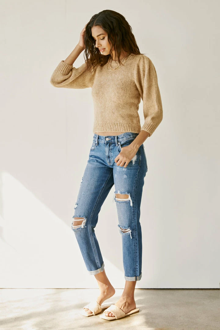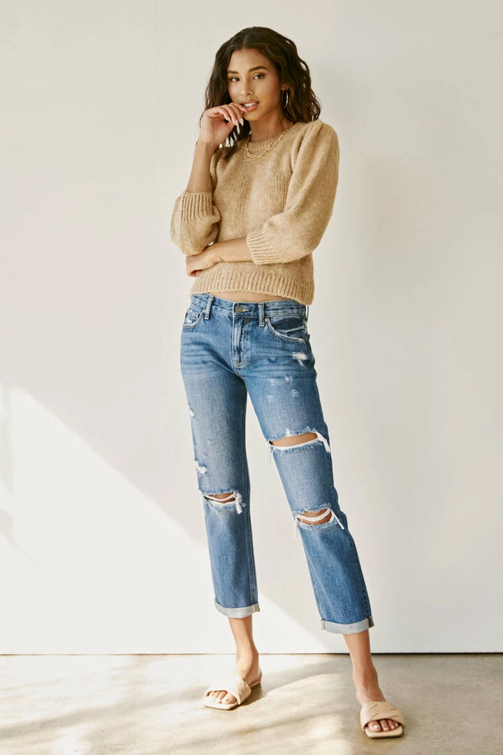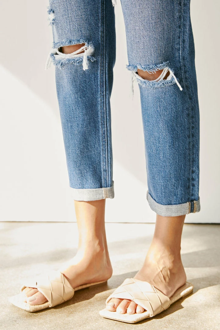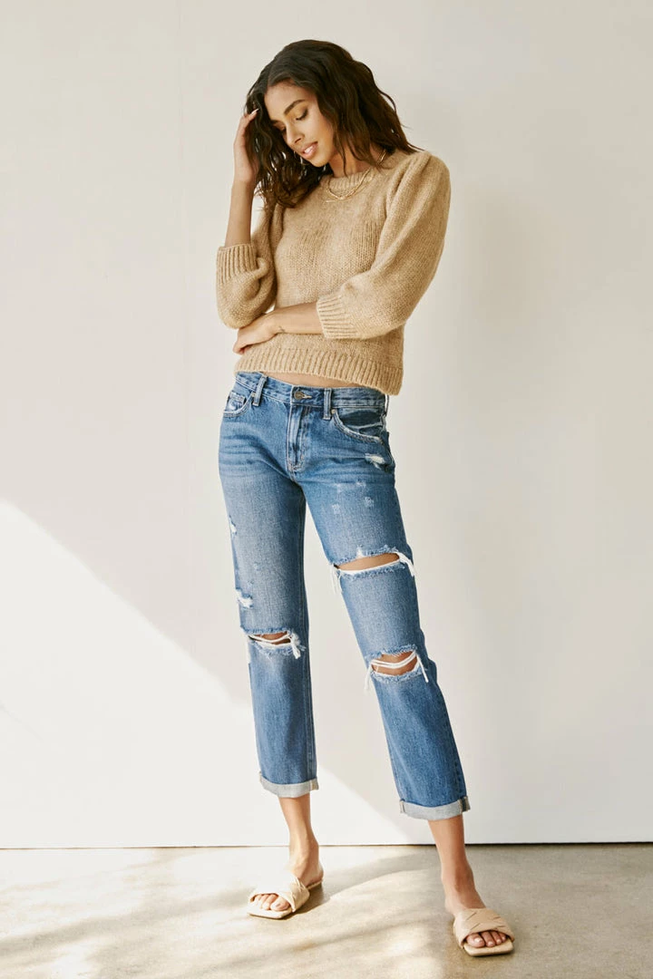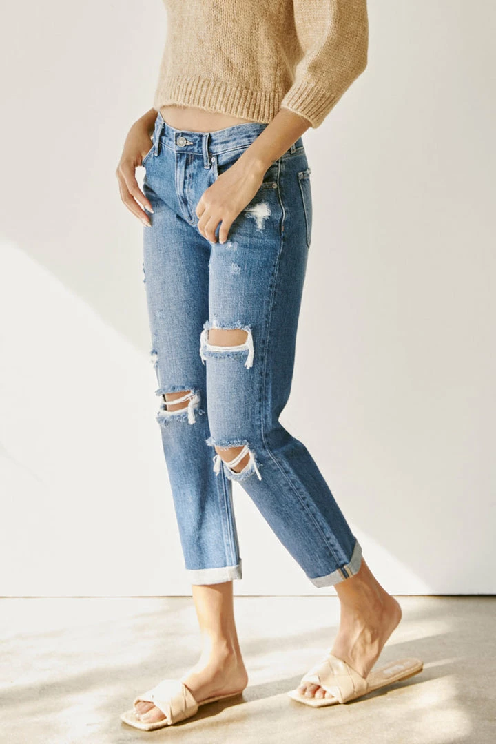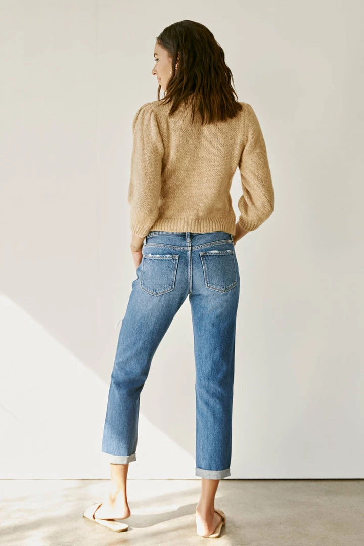 A dark washed denim with a slightly faded wash, whiskering, and moderate distress details for a classic, worn-in look. Our Veda High Rise Jeans site above the natural waistline as they loosen up at the thigh and leg for a relaxed, boyfriend fit. Made with rigid denim to maintain its shape after multiple wears and also include a classic five-pocket design, single-button front, and zip-fly closure. Finished with antique gold hardware.