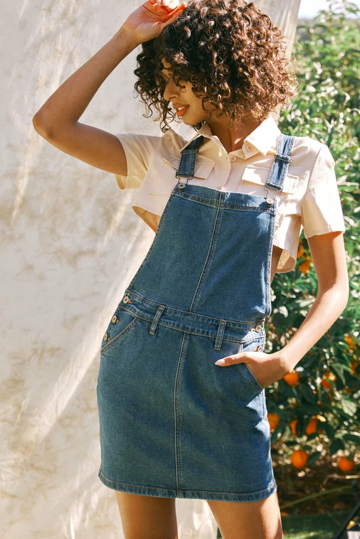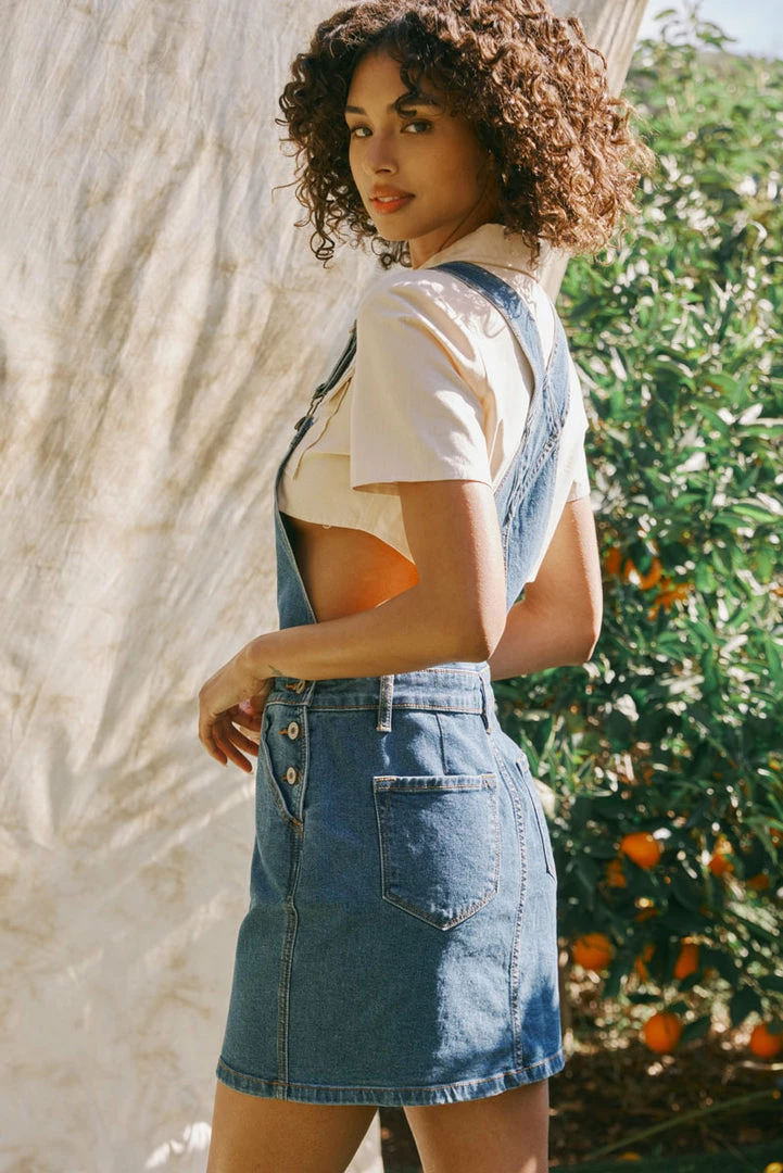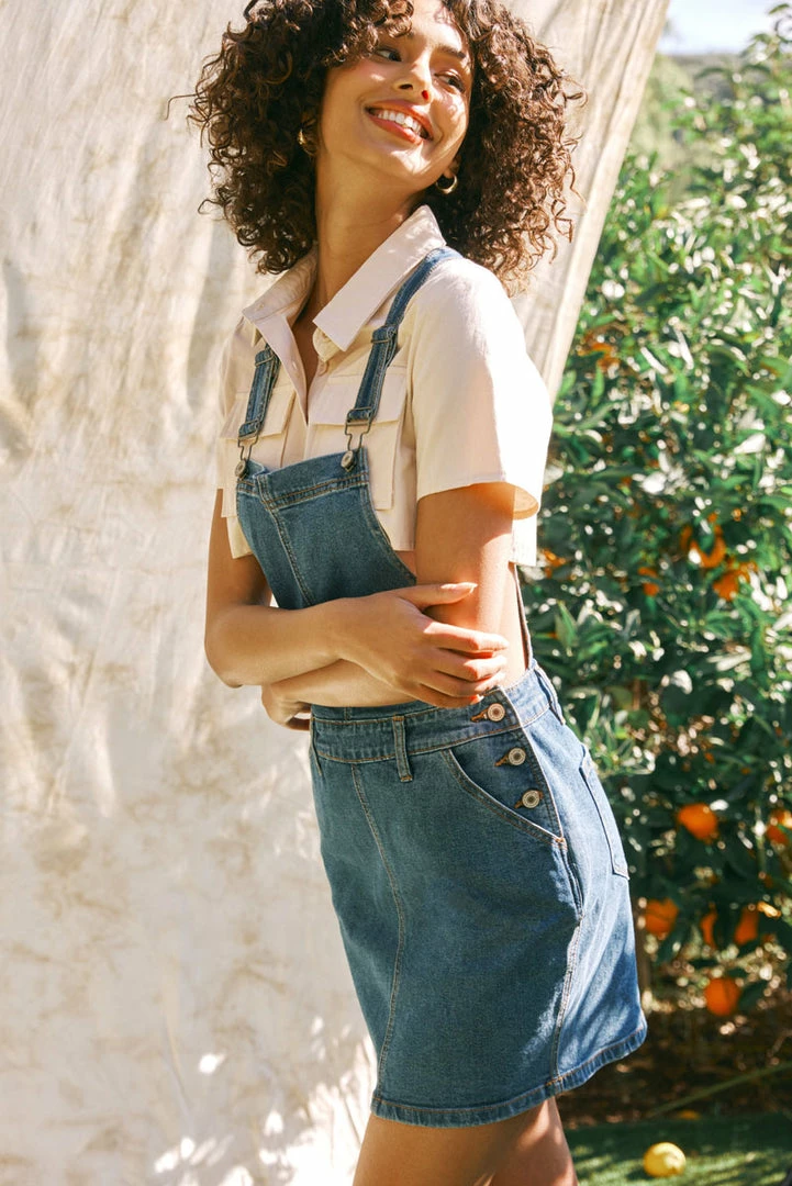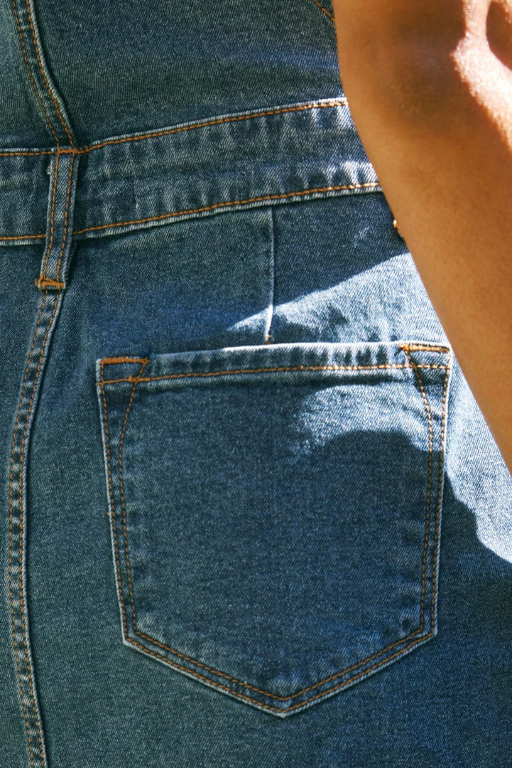 Our Vivi Mini Skirt Overalls feature a rich blue tone with contrast stitching that gives this piece a stylistic edge. Sits slightly above the natural waistline as it relaxes down the hips creating a casual fit that’s fun and flirty. Made with comfort-stretch denim that’s soft and durable giving you a flexible fit every time. Features a four-pocket design, triple-button side closure, front bib, and clasped straps on both shoulders.Â