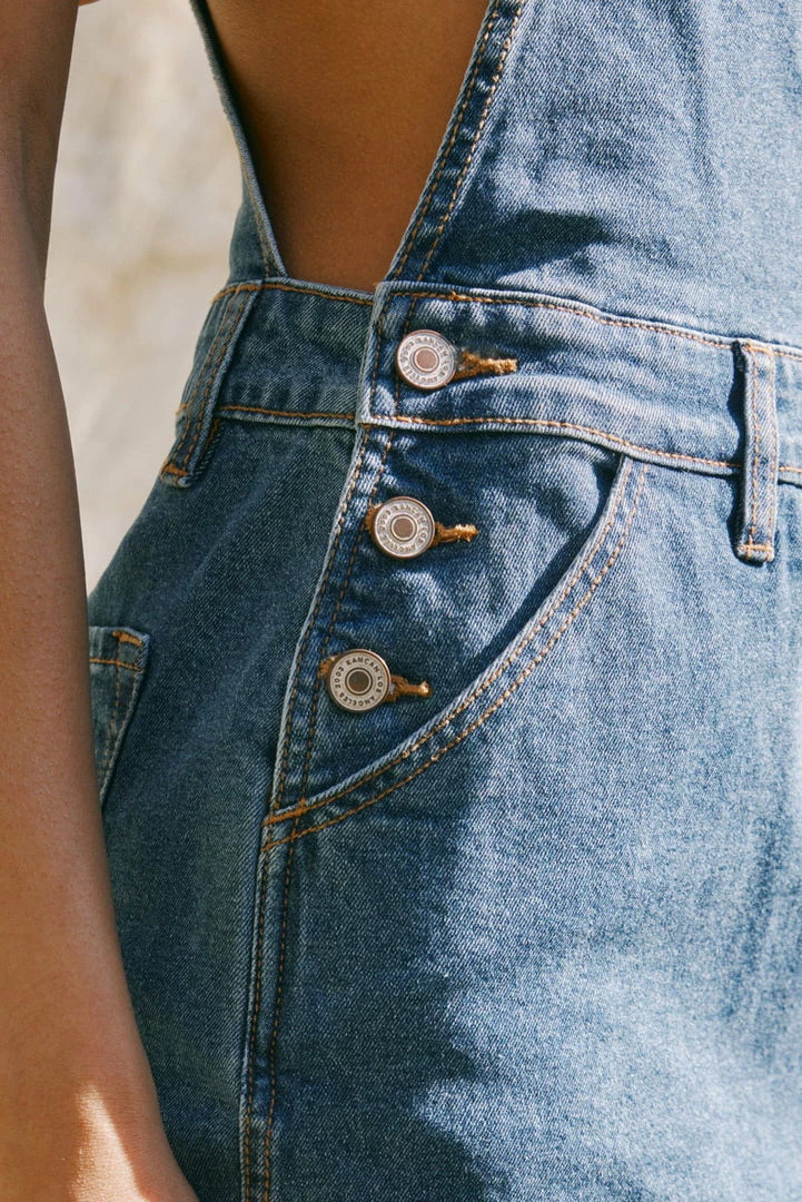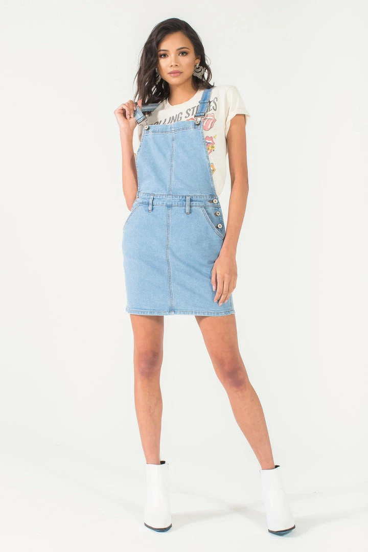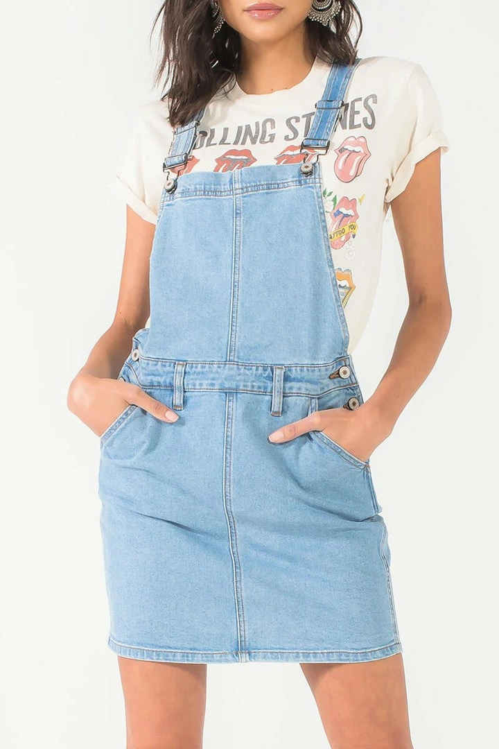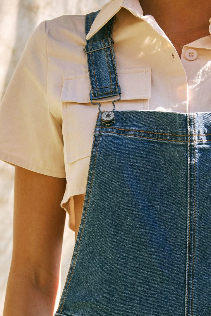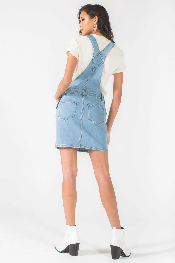 Our Vivi Mini Skirt Overalls feature a rich blue tone with contrast stitching that gives this piece a stylistic edge. Sits slightly above the natural waistline as it relaxes down the hips creating a casual fit that’s fun and flirty. Made with comfort-stretch denim that’s soft and durable giving you a flexible fit every time. Features a four-pocket design, triple-button side closure, front bib, and clasped straps on both shoulders.Â