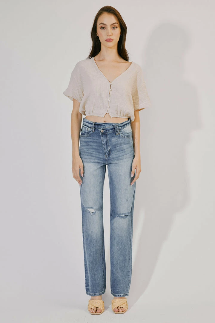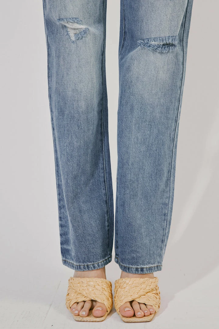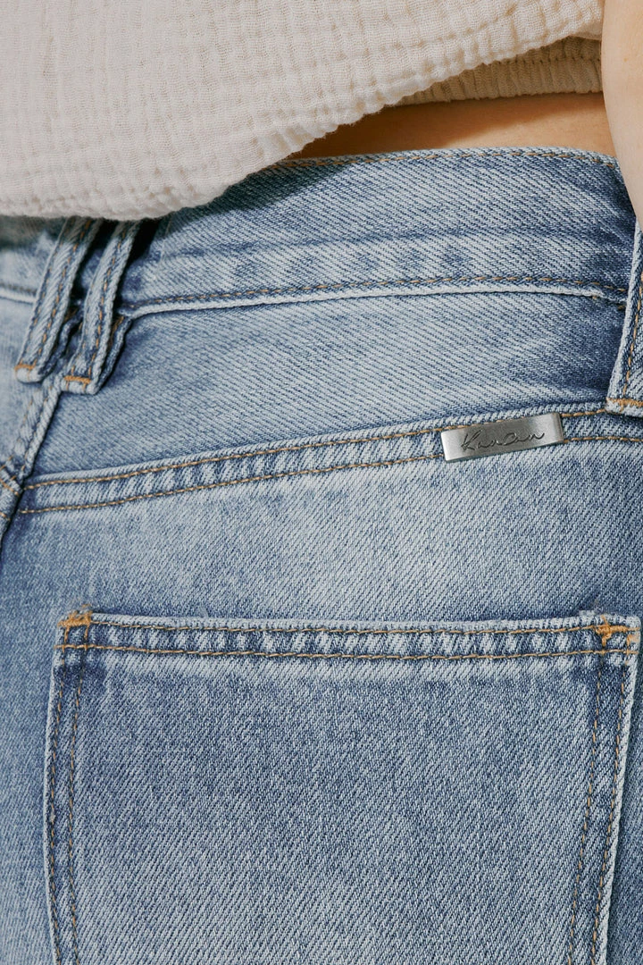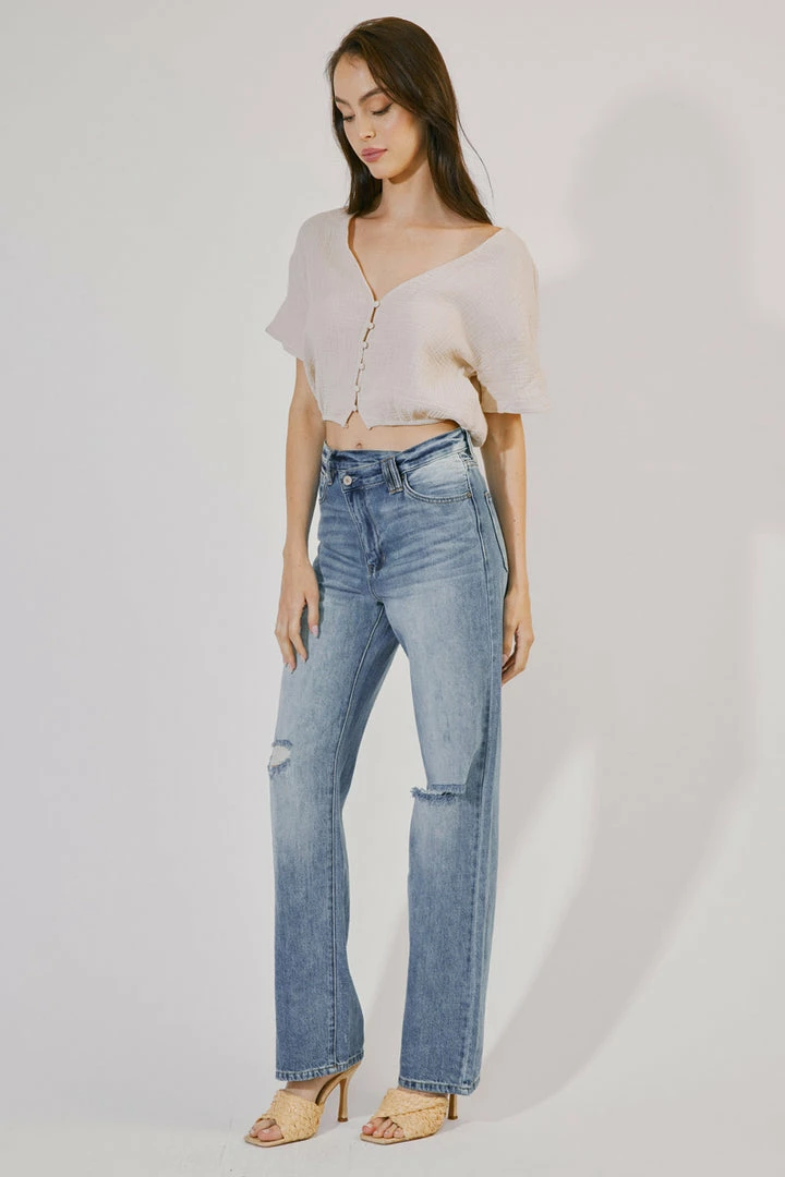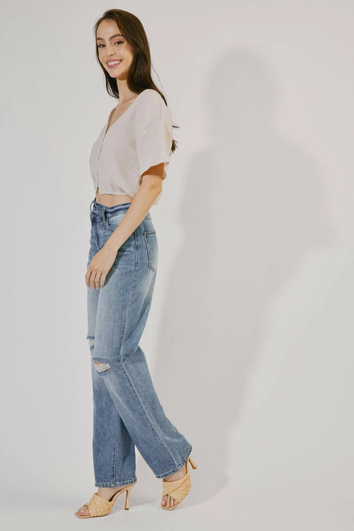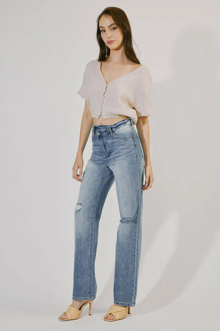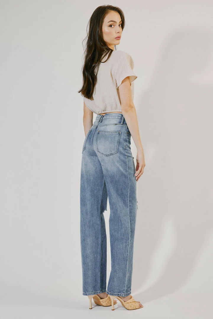 Our Wanda Ultra High Rise Jeans come in our classic 90’s Straight Leg fit with tattered knee destruction and a gently faded wash. Made with rigid denim that holds its shape while retaining a buttery-soft feel. Features a classic five-pocket design and hidden five-button front closure.