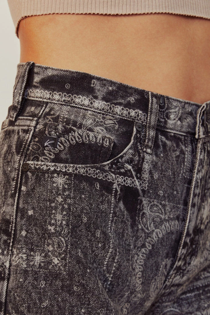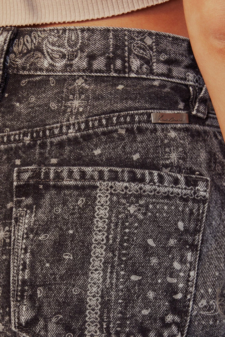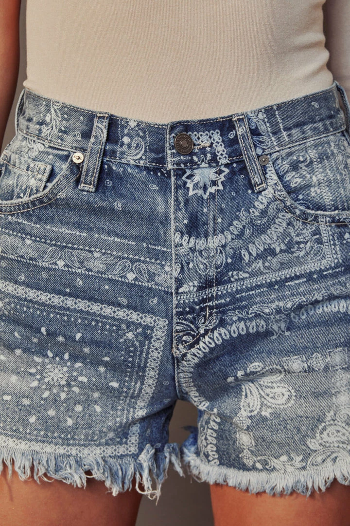 Level up your summer outfit with this pair of bandana patterned high-rise shorts available in a medium blue wash and black. Features a frayed hem, fading detail for a more worn-in feel that gives these shorts a more vintage look.  Comes with a 5-pocket design, single-button closure, and zip fly.