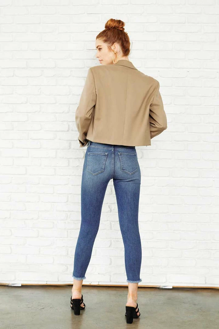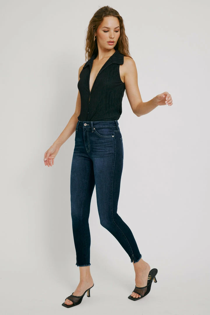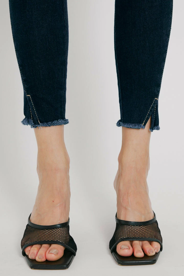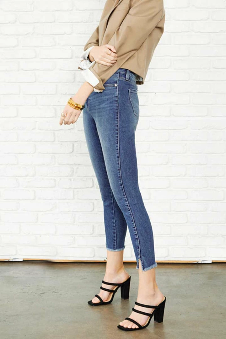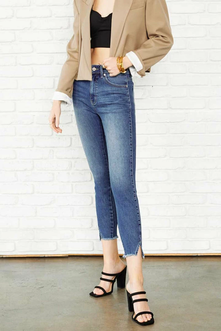 A medium and dark-wash ankle skinny jean with a slit, raw hem detail for an extra edgy look. Our Zinnia High Rise Jeans sit above the natural waistline as the tapper down the leg for a fitted style that forms a fashionably sleek silhouette. Subtle fade and whiskering details add to this style’s lived-in look that goes perfectly with casual tops or you can dress it up with your favorite heels. Comes with a classic five-pocket design, single-button front, and zip-fly closure. Finished with gold-colored hardware.
