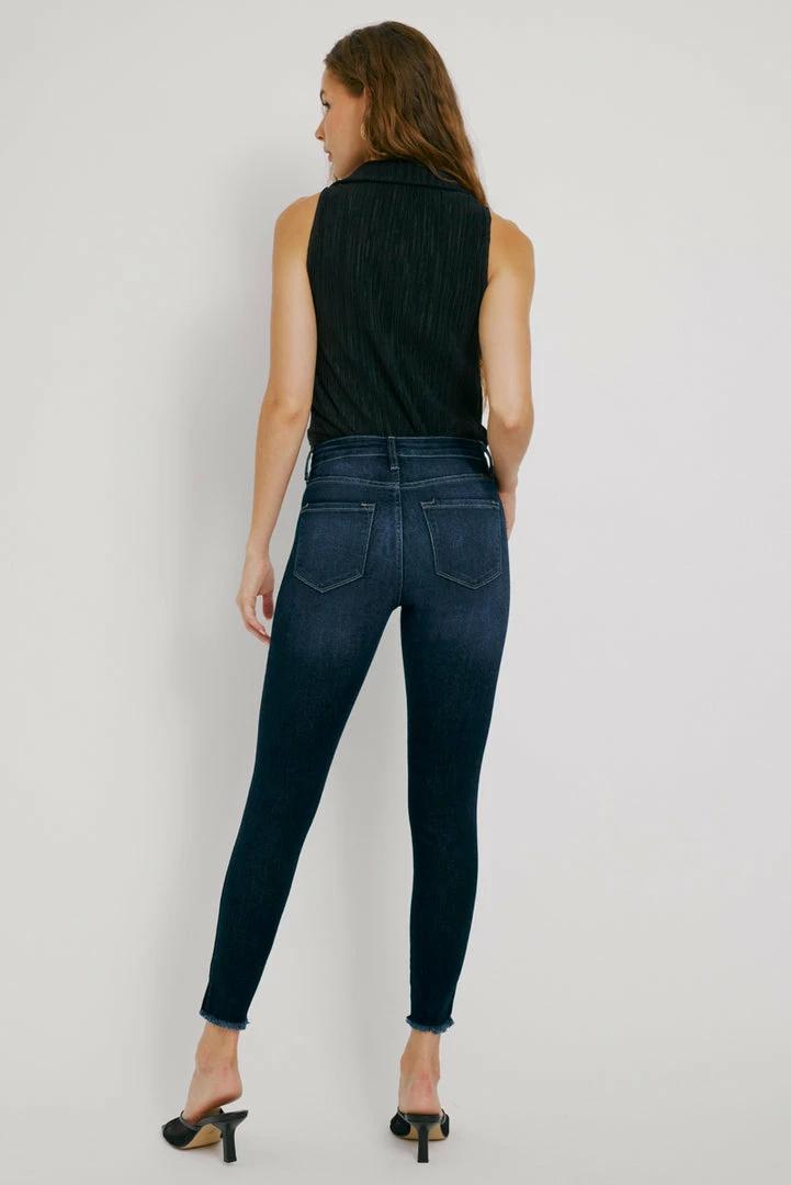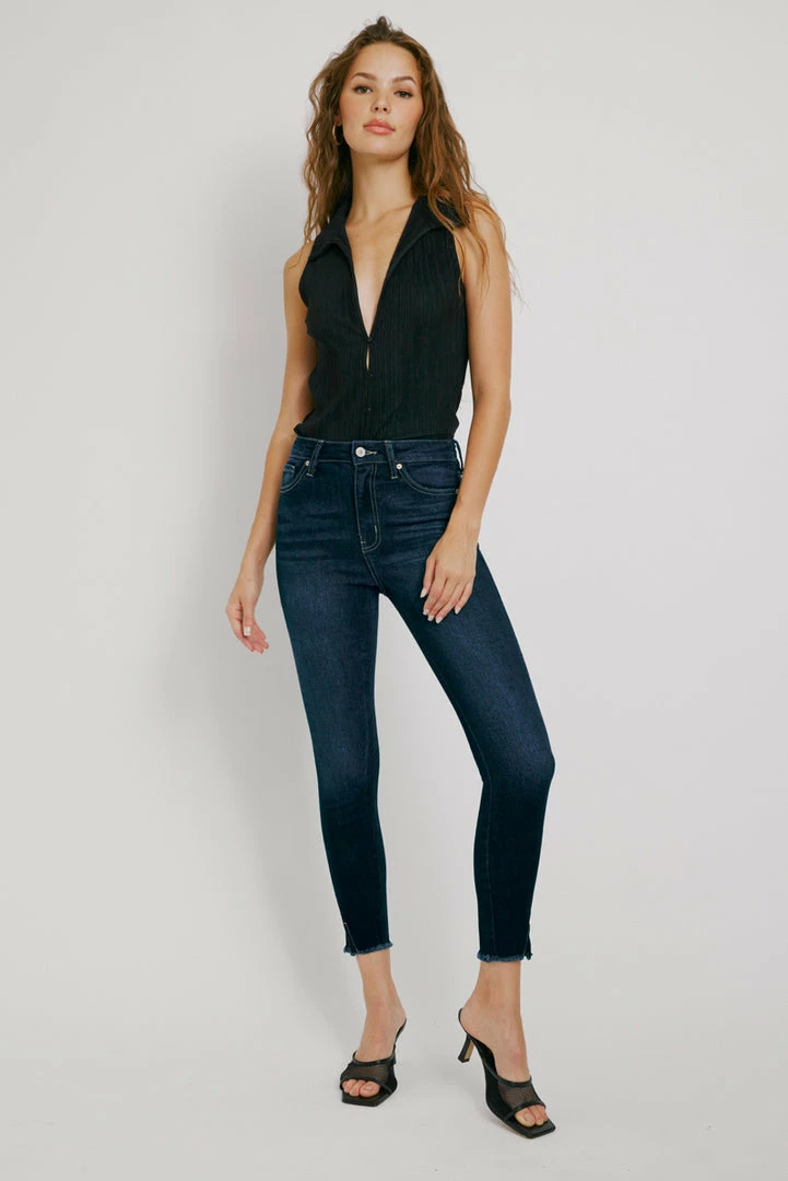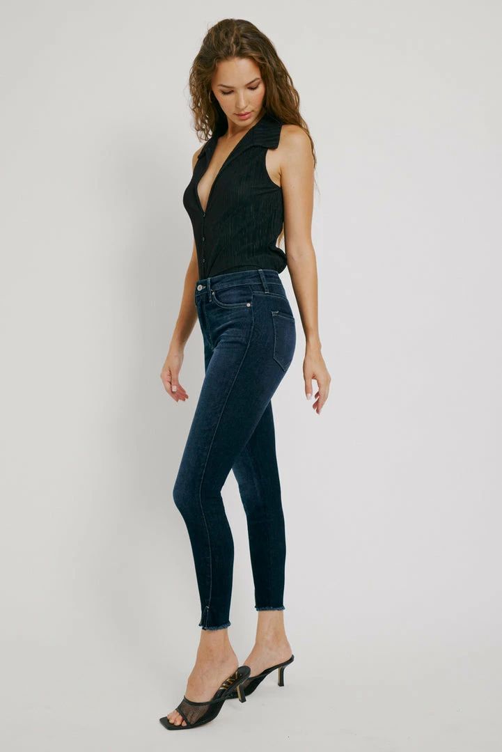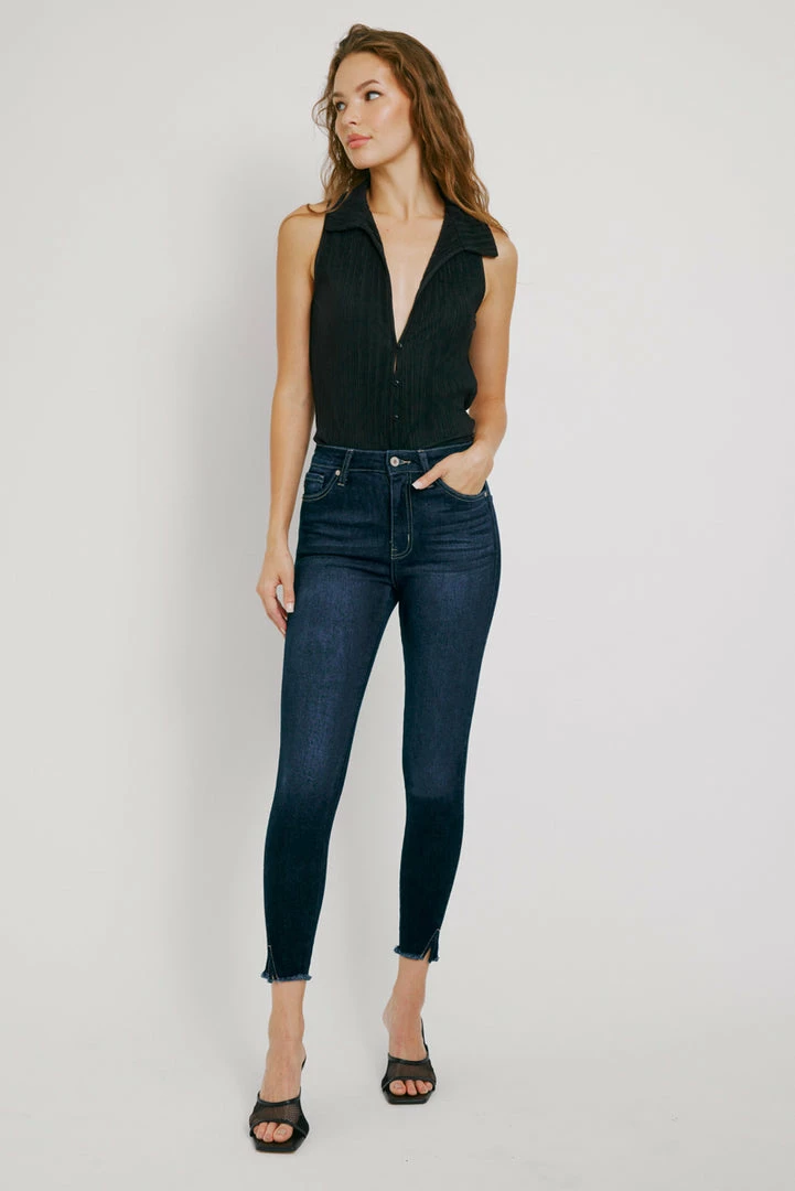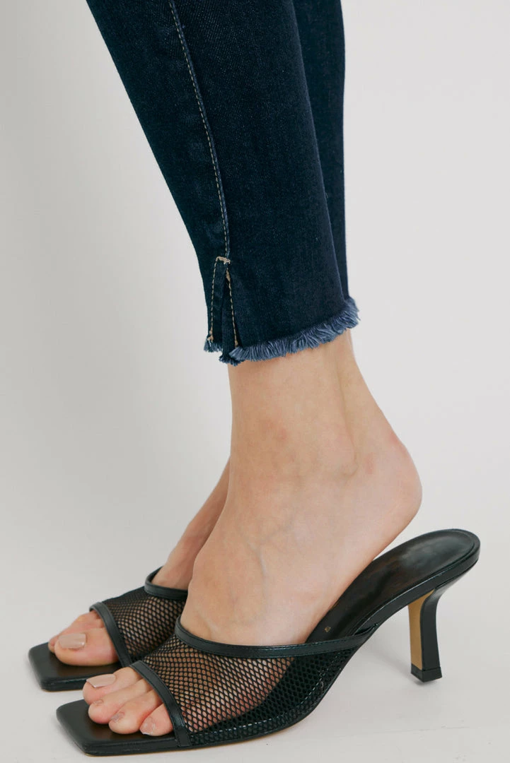 A medium and dark-wash ankle skinny jean with a slit, raw hem detail for an extra edgy look. Our Zinnia High Rise Jeans sit above the natural waistline as the tapper down the leg for a fitted style that forms a fashionably sleek silhouette. Subtle fade and whiskering details add to this style’s lived-in look that goes perfectly with casual tops or you can dress it up with your favorite heels. Comes with a classic five-pocket design, single-button front, and zip-fly closure. Finished with gold-colored hardware.
