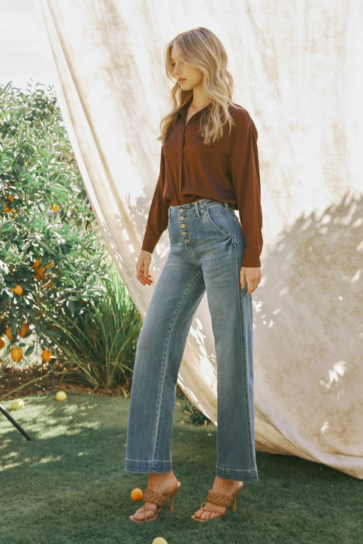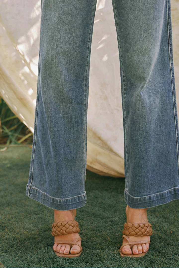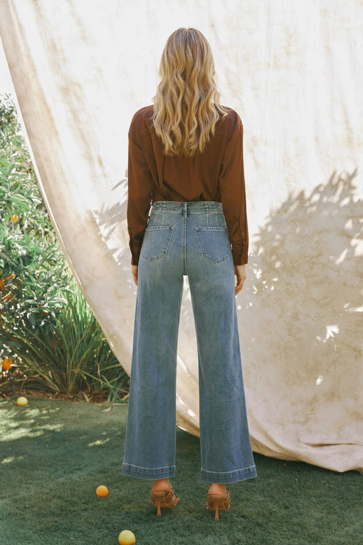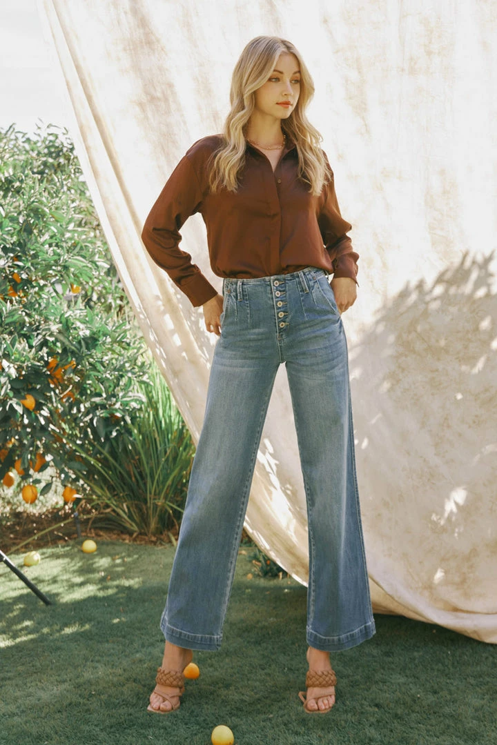 A medium-washed, wide-leg jean with moderate destruction on both legs for an edgy, yet sophisticated look. Our Zoelle Ultra High Rise Jeans sit high above the natural waistline as they loosen down through the thigh and leg for a roomy fit that’s both trendy and unique. Made with comfort stretch denim that won’t bag out after each wear. Features a four-pocket design, five-button front closure, and finished with gold-colored hardware.