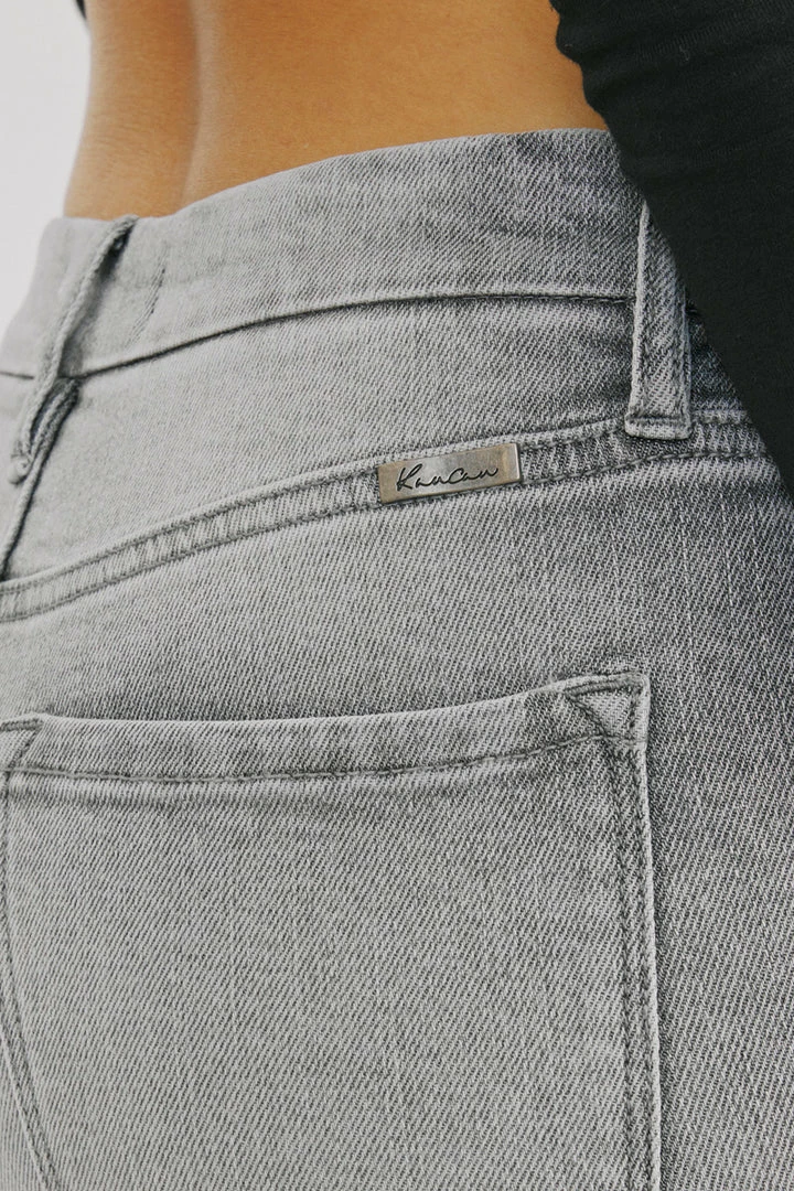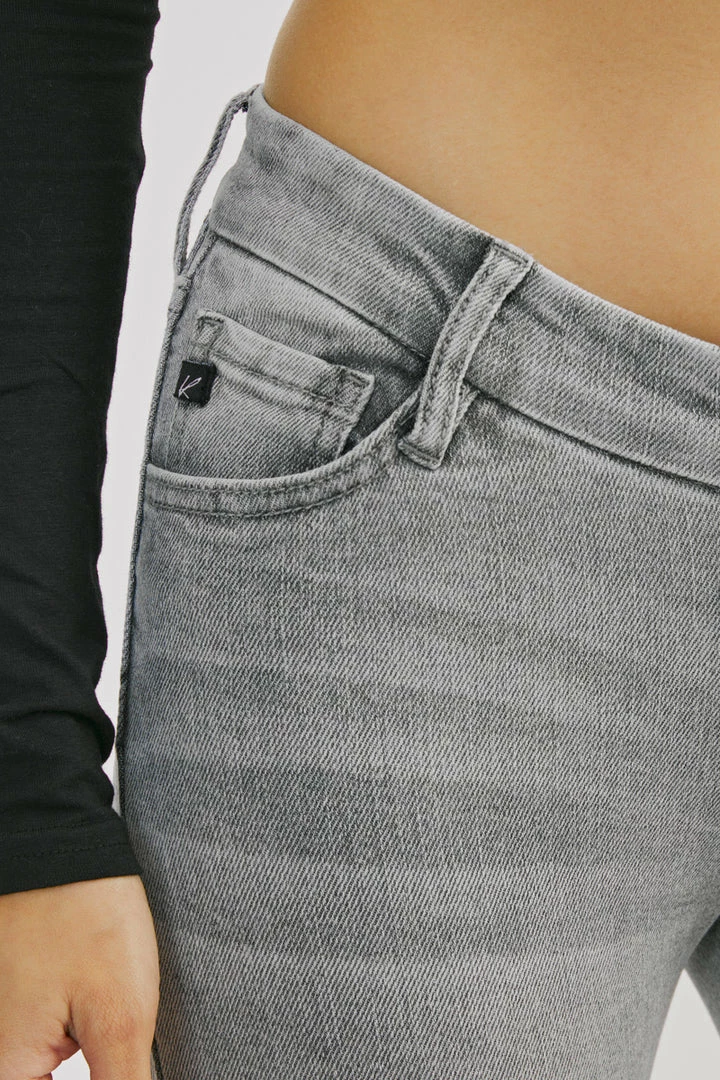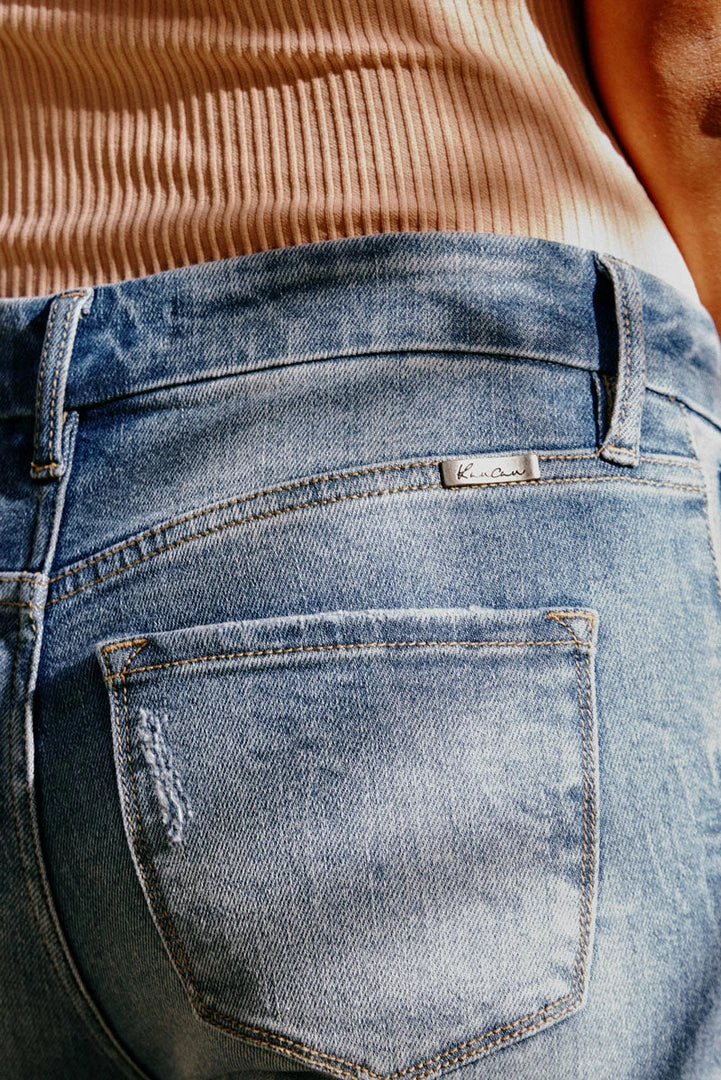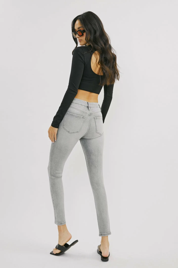Our Kira skinny jeans come in a classic ankle skinny jean fit that hugs in all the right places. Comes in a faded medium blue wash with subtle distress detail and whiskering. It comes in a V shape with a mid-rise front but a higher waistband in the back for a more flattering shape. Has a 5 pocket design, single-button closure, and zip fly.Â