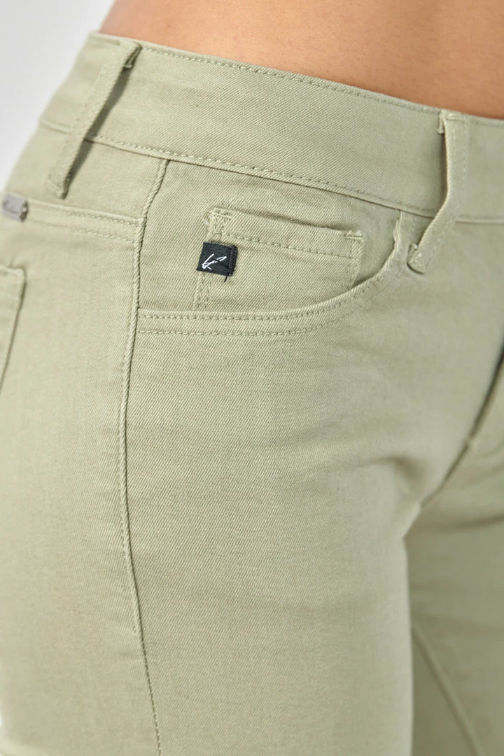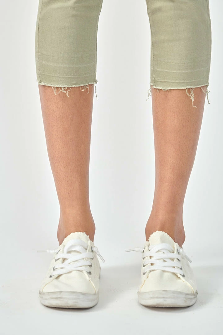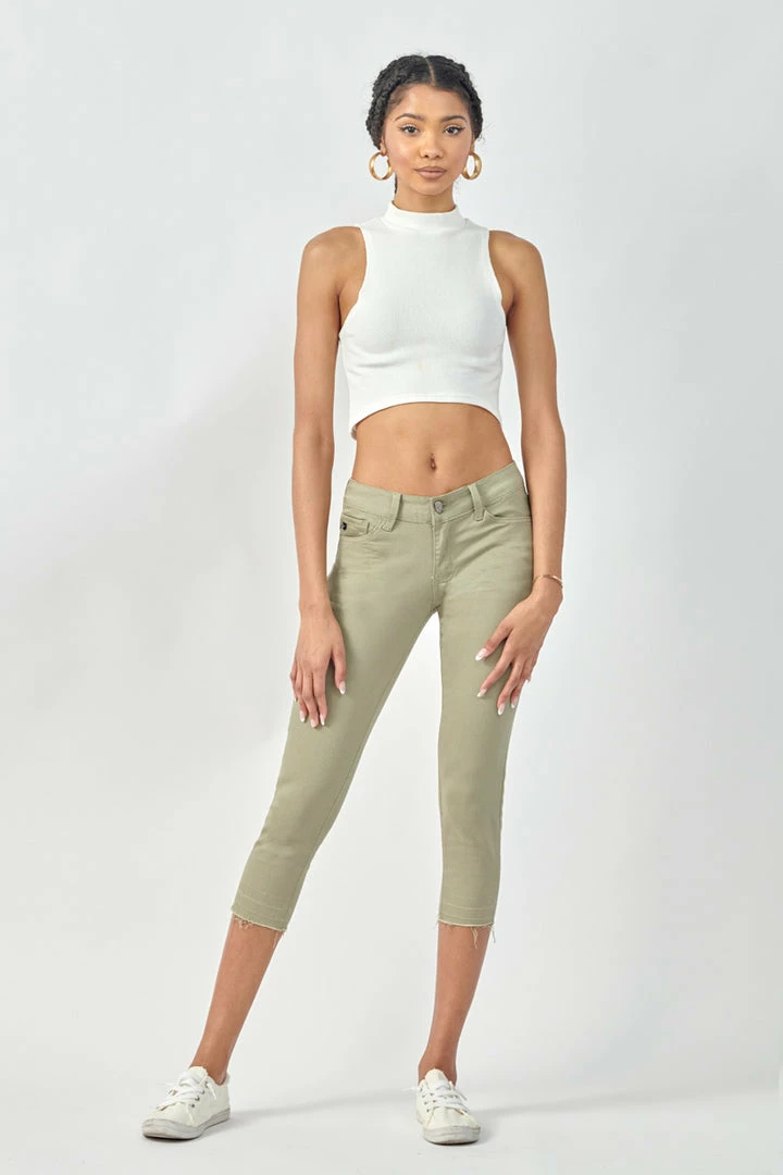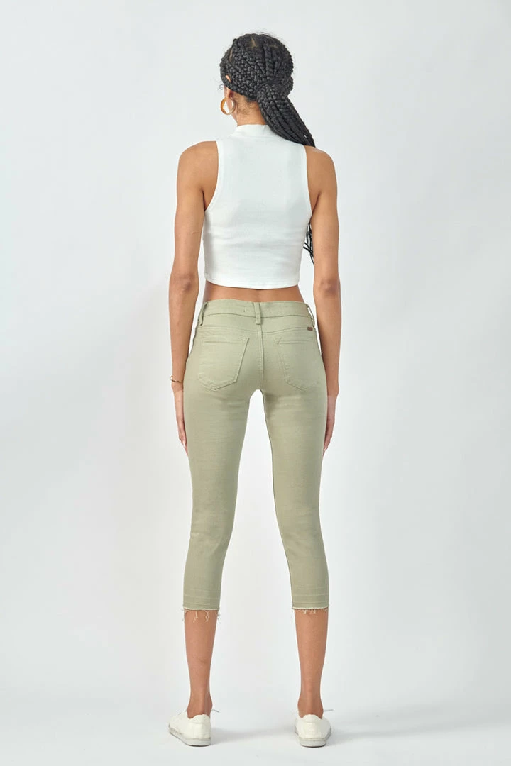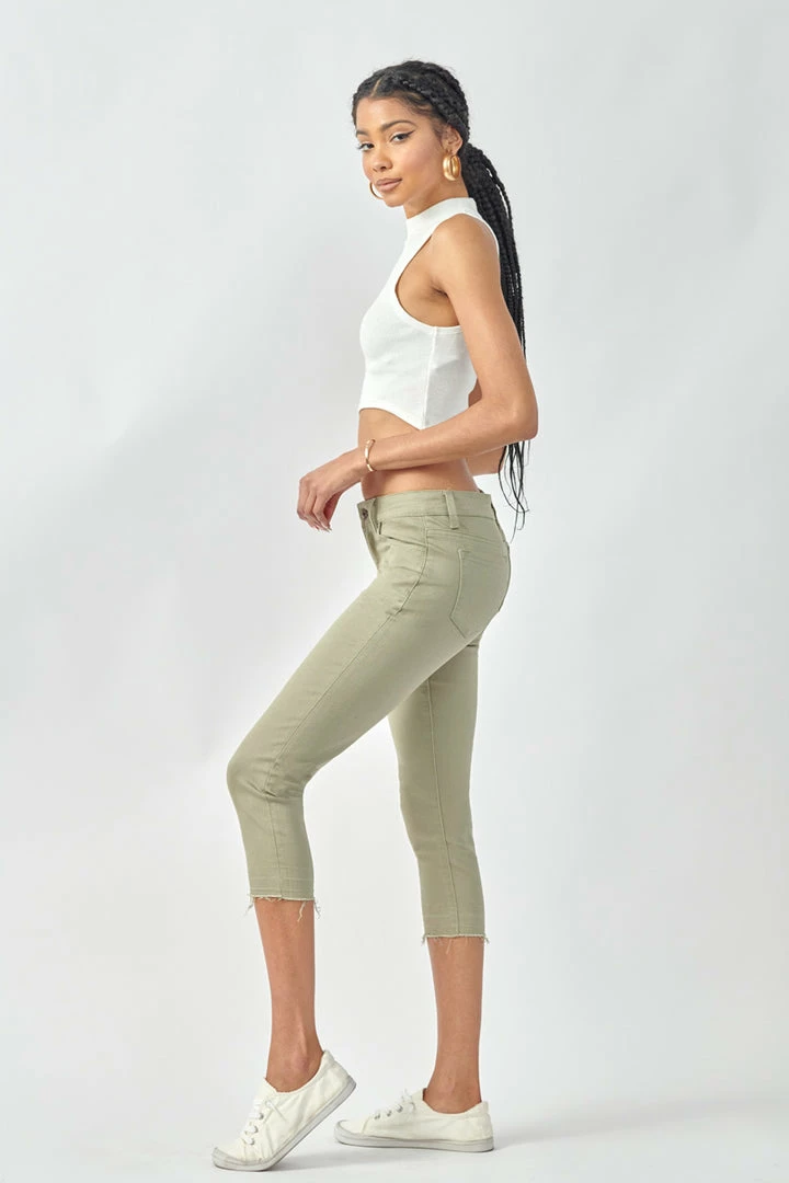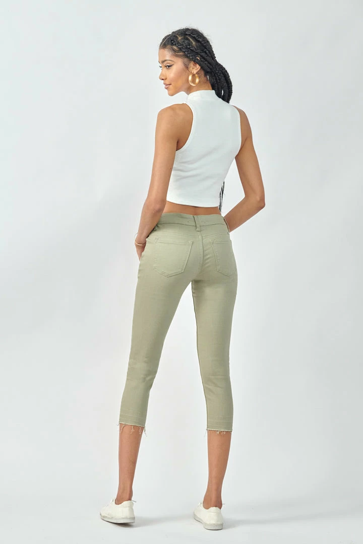 Show off your sleek yet trendy style with this pair of mid-rise capris that come in a green pastel color perfect for Spring. Features a raw hem to give it that next level of trend and style. Has a classic 5 pocket design, single-button closure, and zip fly.