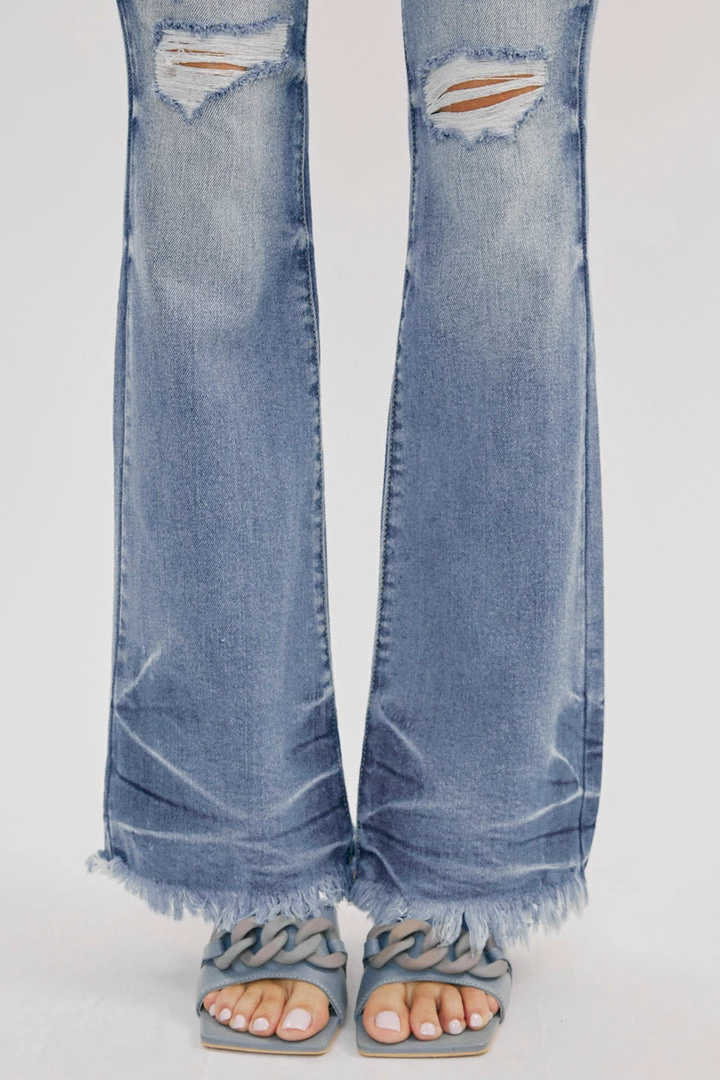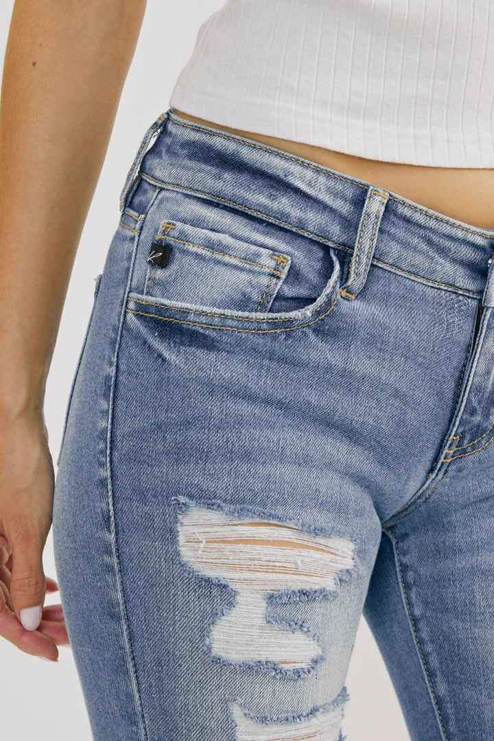 Our Casey Low Rise Jeans come in a bootcut fit in a medium wash. Sits right below the natural waistline as it tapers down the thigh and begins to flare out at the lower calf, giving you a classic flare fit. Made with stretch denim that hugs your every curve while still giving you comfort with its flexible and breathable denim blend. Features a classic five-pocket design, single-button front, and zip-fly closure.