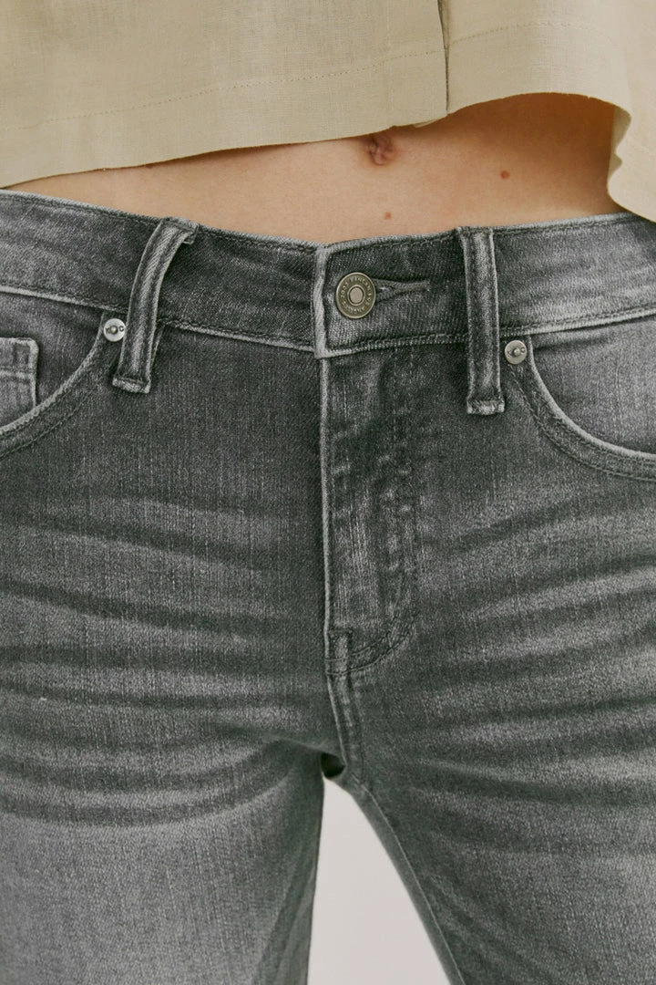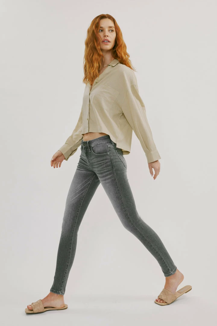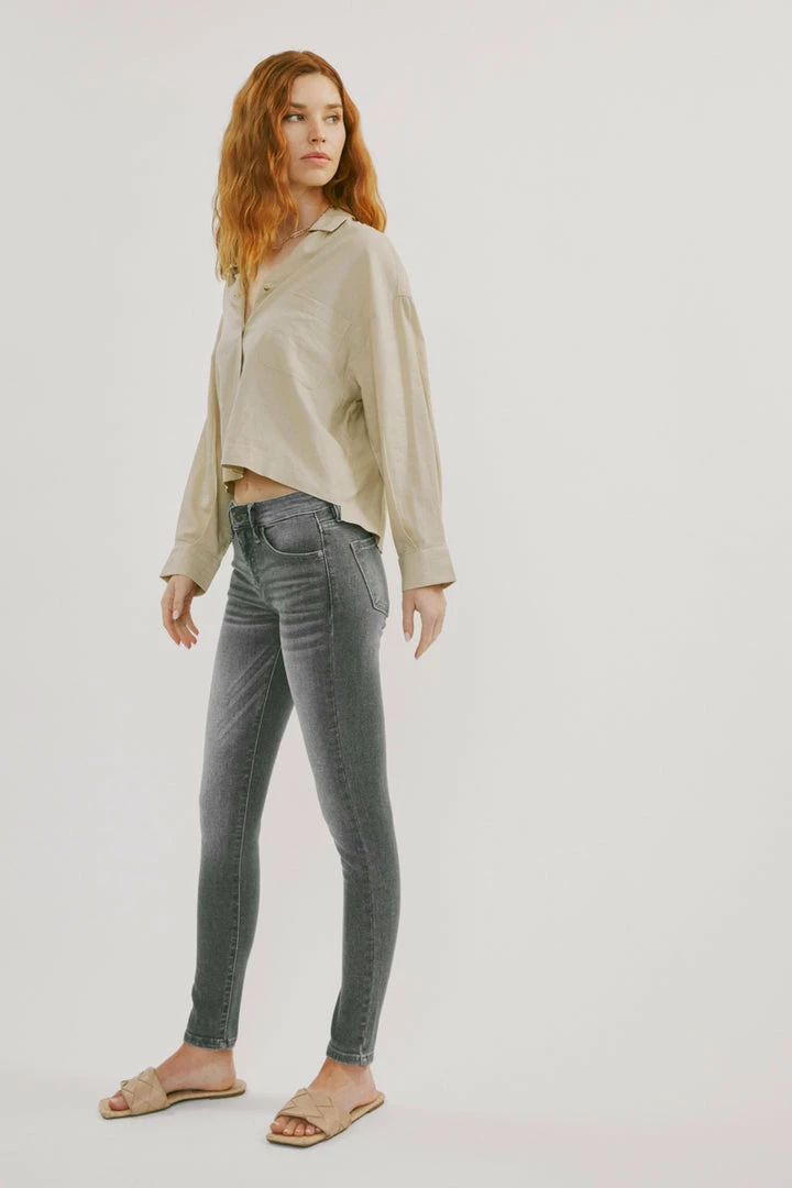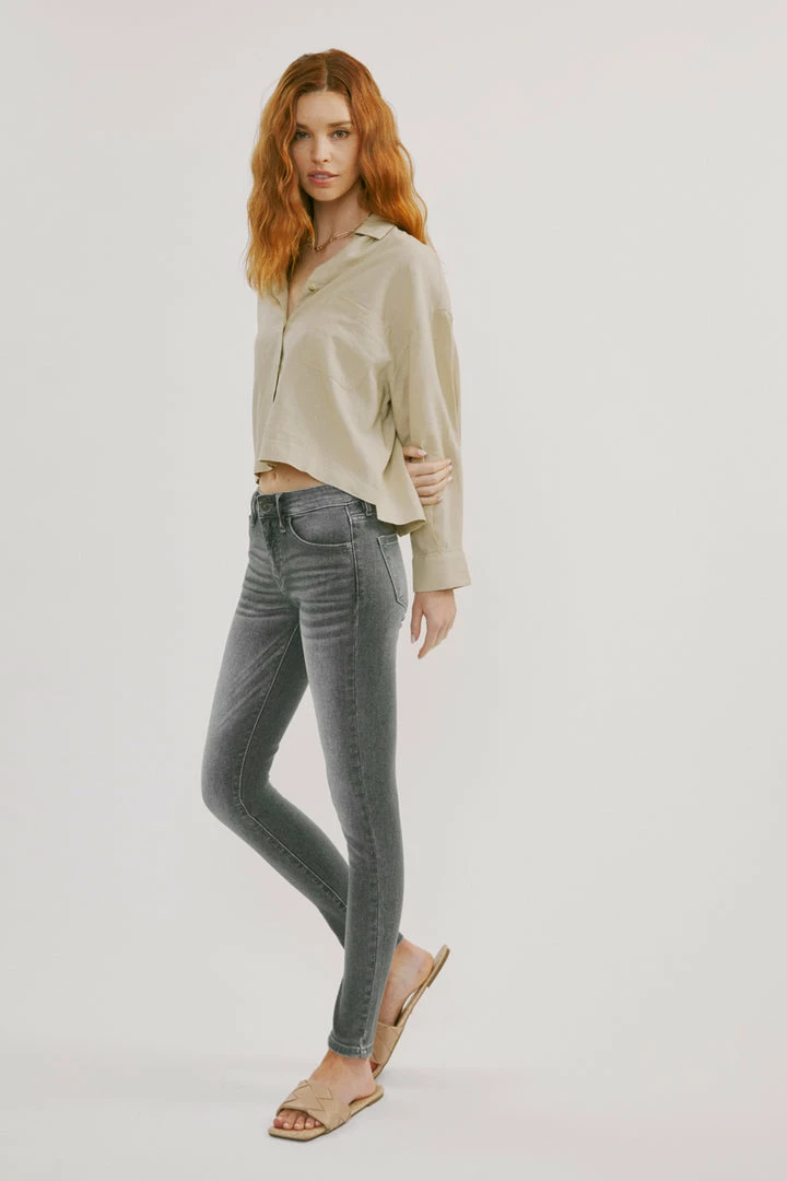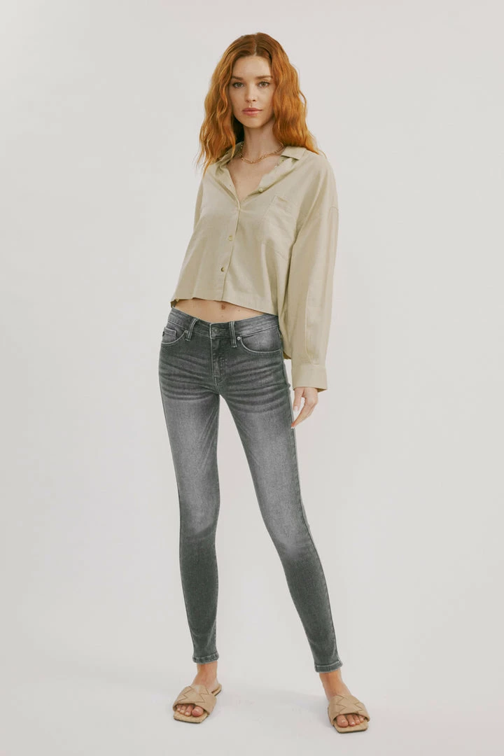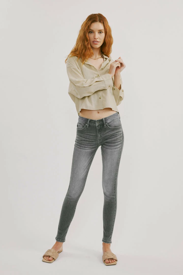 Our Jenner Mid Rise Super Skinny Jeans come in a super skinny cut with a gently faded grey wash and subtle whiskering that gives this style a hip look. Sits right at the natural waistline as it tapers down the leg giving you a figure-flattering fit that’s sexy and sleek. Made with super-stretch denim that’s buttery-soft and flexible. Features a classic five-pocket design, single-button front, and zip-fly closure.